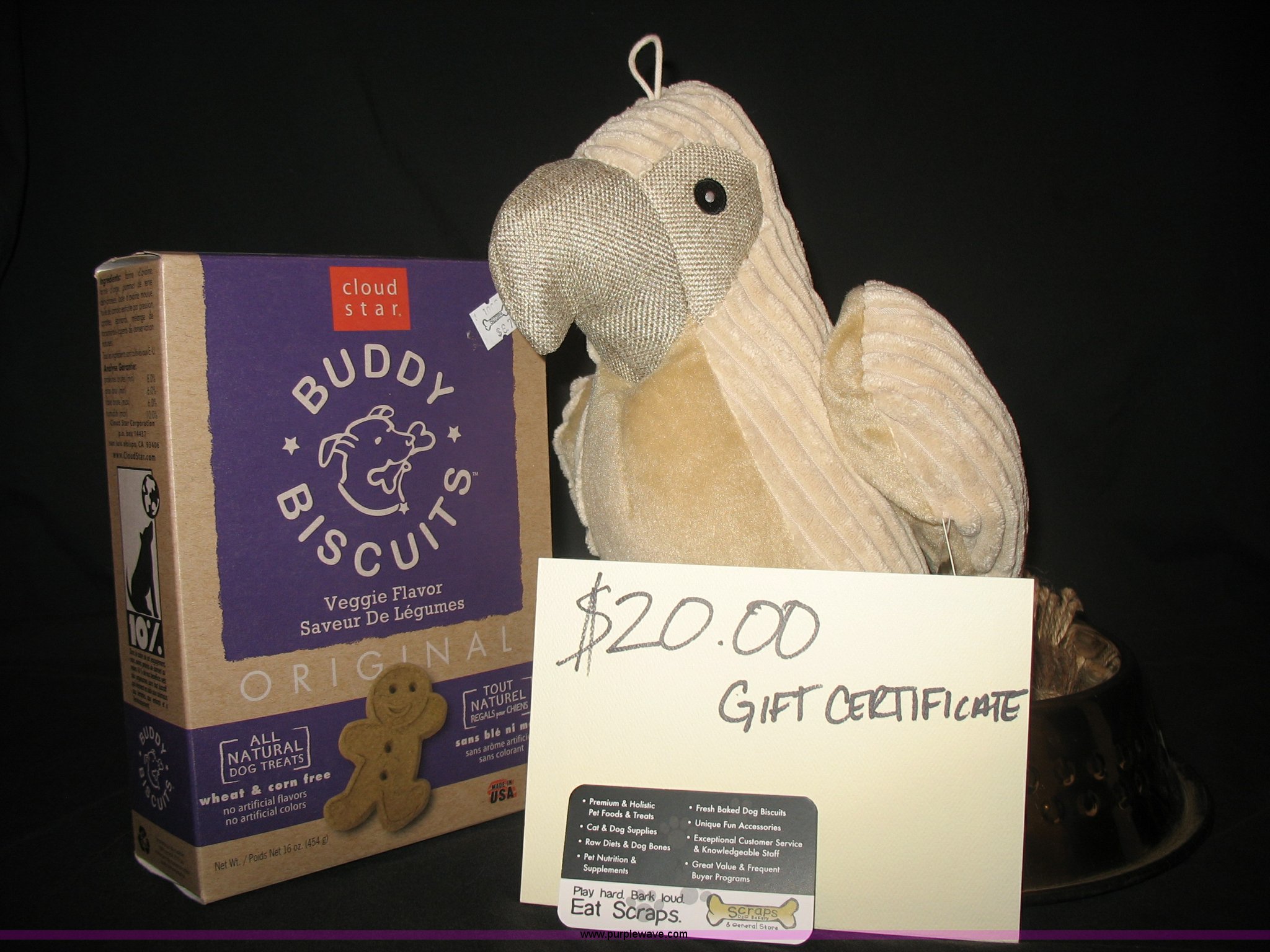 Gift Basket:. -Plush Dog Toy. -Metal Dog Bowl. -Dog Bones. -$20 Gift Certificate. Good in either Kings Beach or Truckee store. Donated by Scraps Dog Bakery. Purple Wave Sierra. 5853 S Carson Street. Carson City, NV 89701