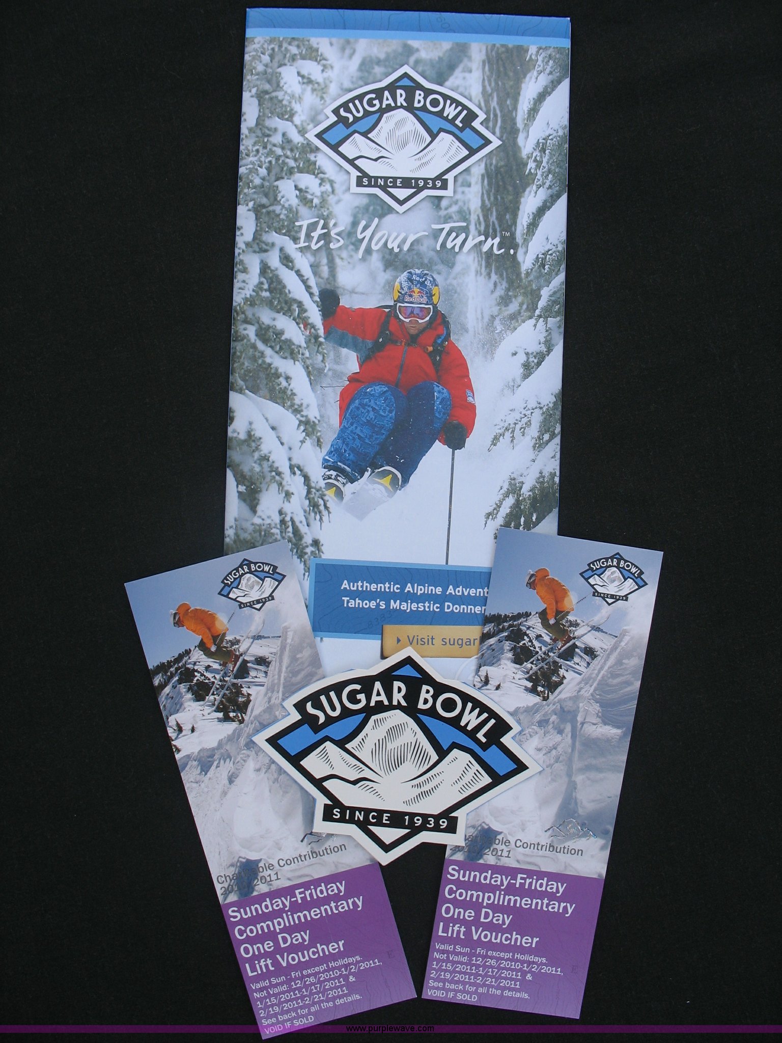 2 one-day adult lift tickets to Sugar Bowl. Valid Sun-Fri until March 21, 2011. Excluding Feb. 19 to Feb. 21. Valid any day from March 21, 2011 to close of 2011 season or June 1, 2011, whichever comes first. Donated by Sugar Bowl. Purple Wave Sierra. 5853 S Carson Street. Carson City, NV 89701