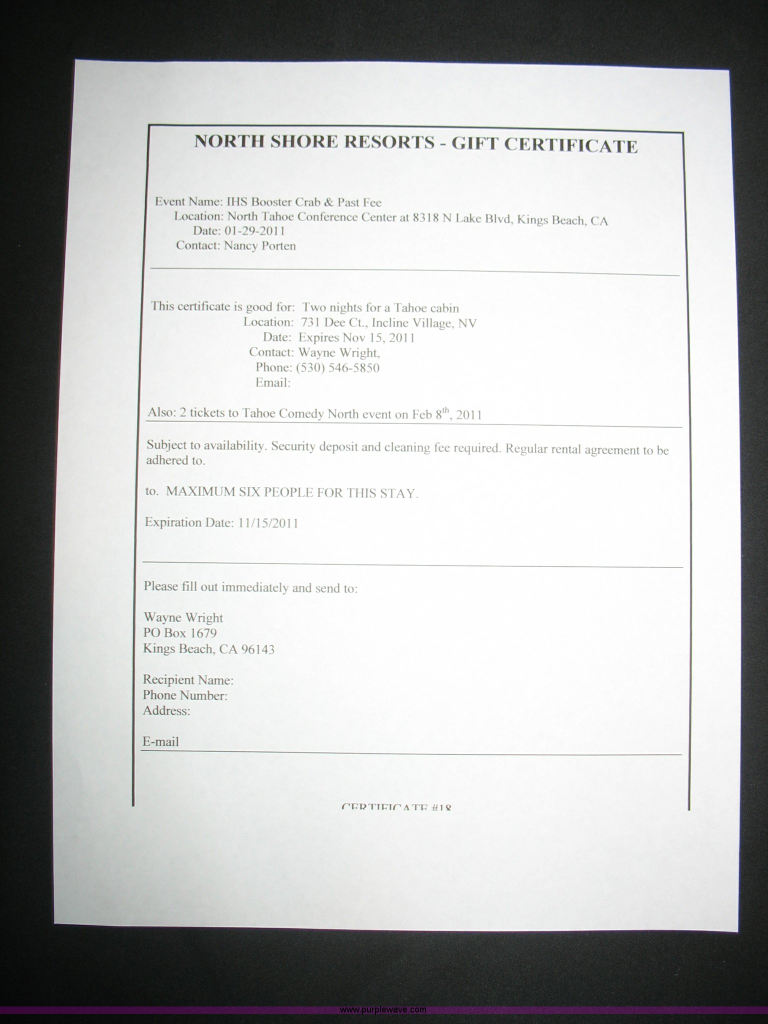 Purple Wave is selling a used Other Industrial or Business in Nevada. This item is a 2 Nights at a Tahoe Cabin with the following: 2 Nights at a Tahoe Cabin. 731 Dee Ct. See certificate for details. Purple Wave Sierra. 5853 S Carson Street. Carson City, NV 89701