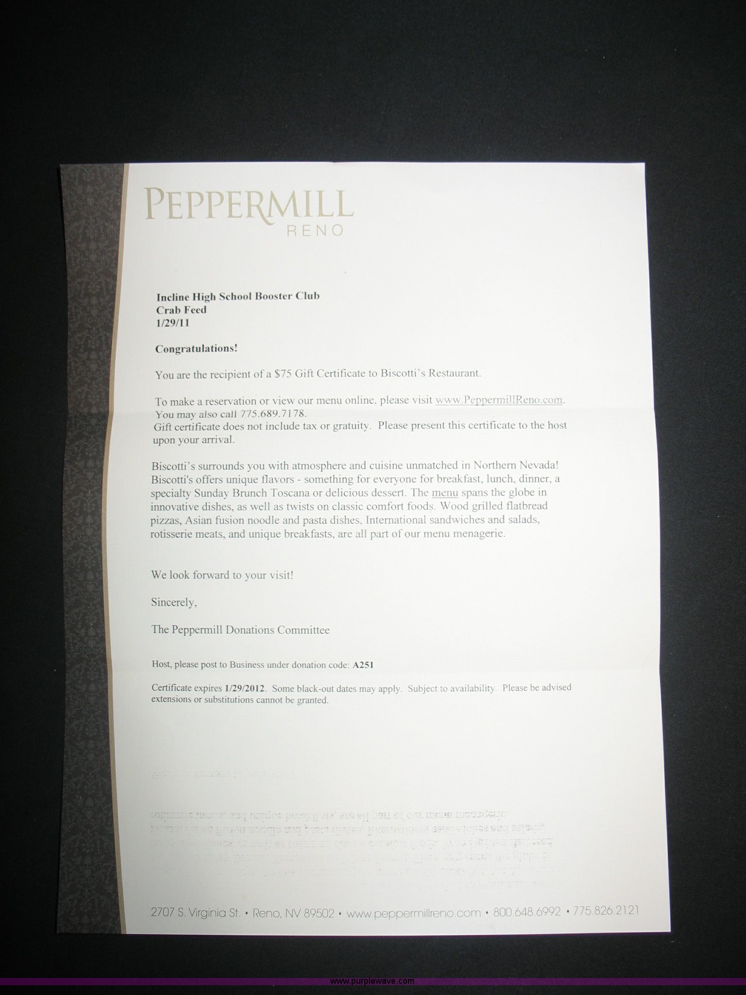 Purple Wave is selling a used Other Industrial or Business in Nevada. This item is a $75 gift certificate to Biscotti's Restaurant with the following: $75 gift certificate to Biscotti's Restaurant. Does not include tax or gratuity. Expires 1.29.12 . Some black-out dates . Donated by Peppermill. Purple Wave Sierra. 5853 S Carson Street. Carson City, NV 89701
