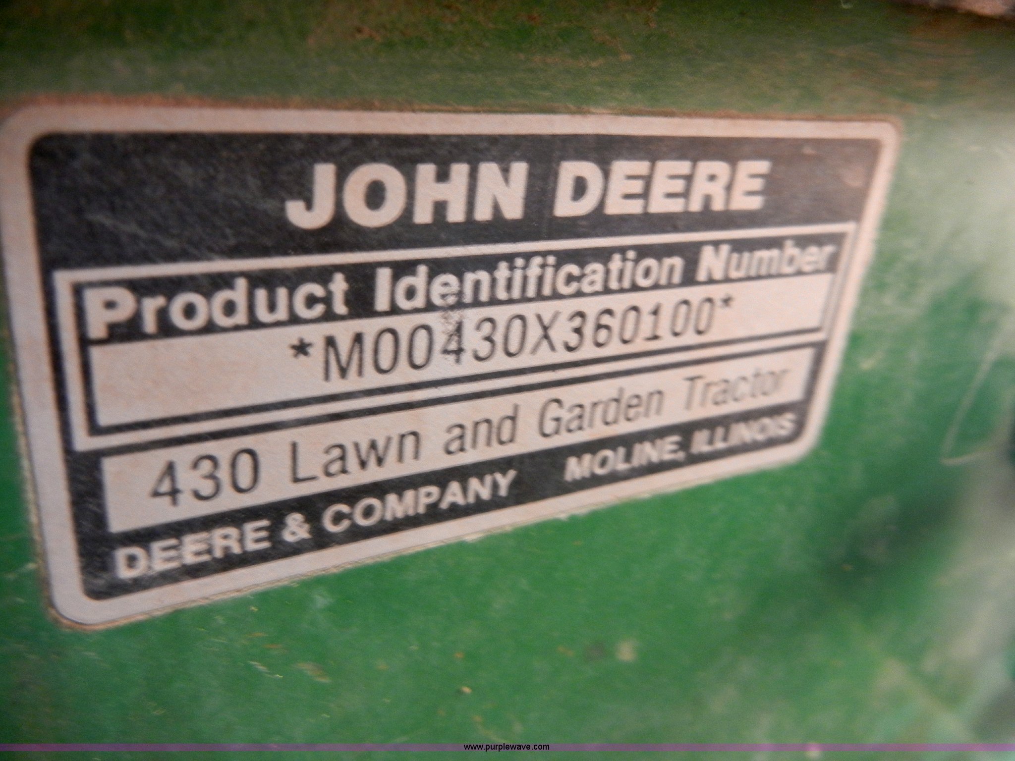 Purple Wave is selling a used Lawn Mower in Kansas. This item is a John Deere 430 riding mower with the following: No deck, Diesel engine, Serial CH3029D007008, Model 3TNA72UJ, Pin M00430X360100, Key, Rear tow bar, 18 x 8.50 - 8 front tires, 26 x 12.00 - 12 rear tires, Hood has cosmetic damage