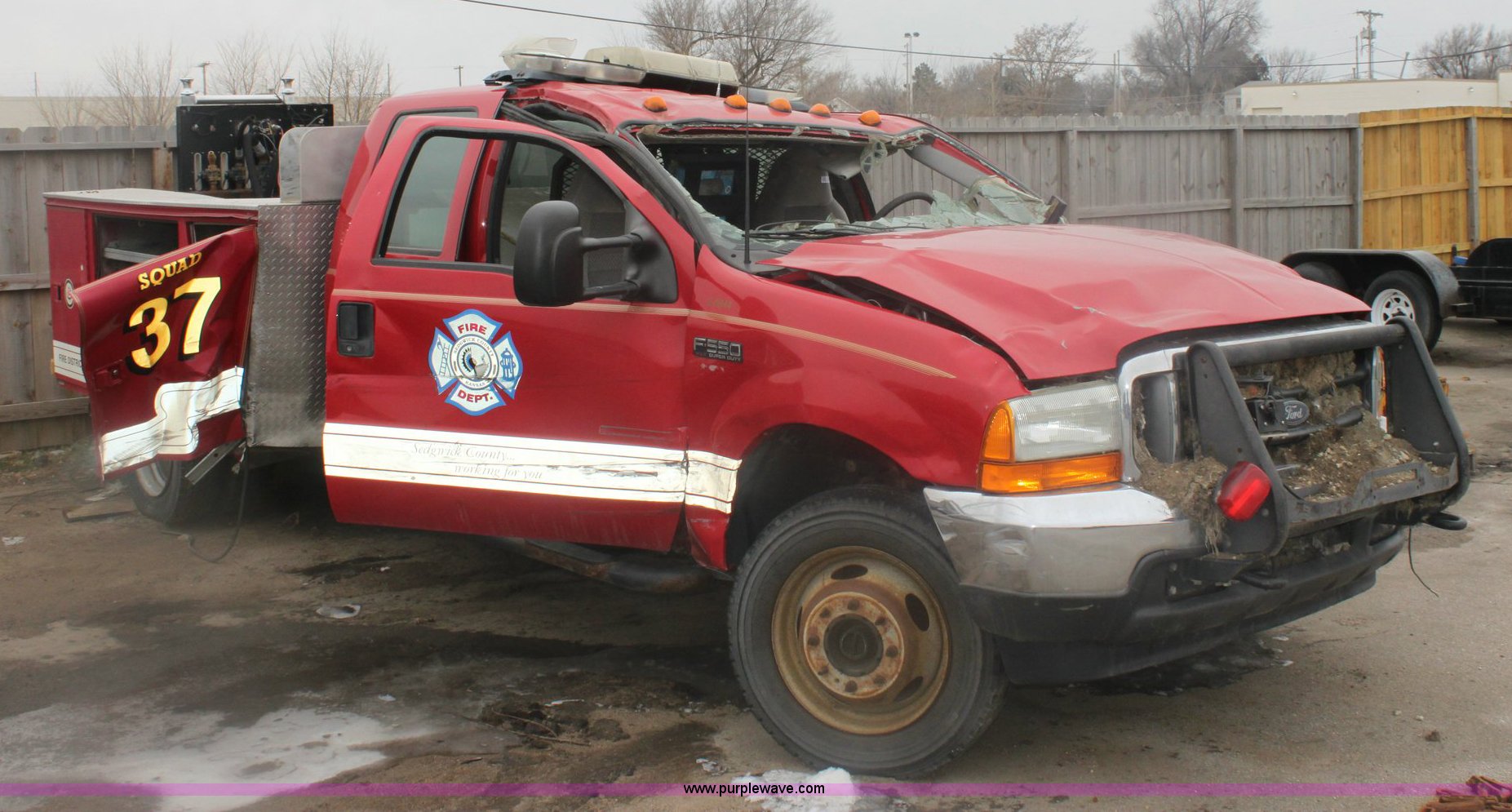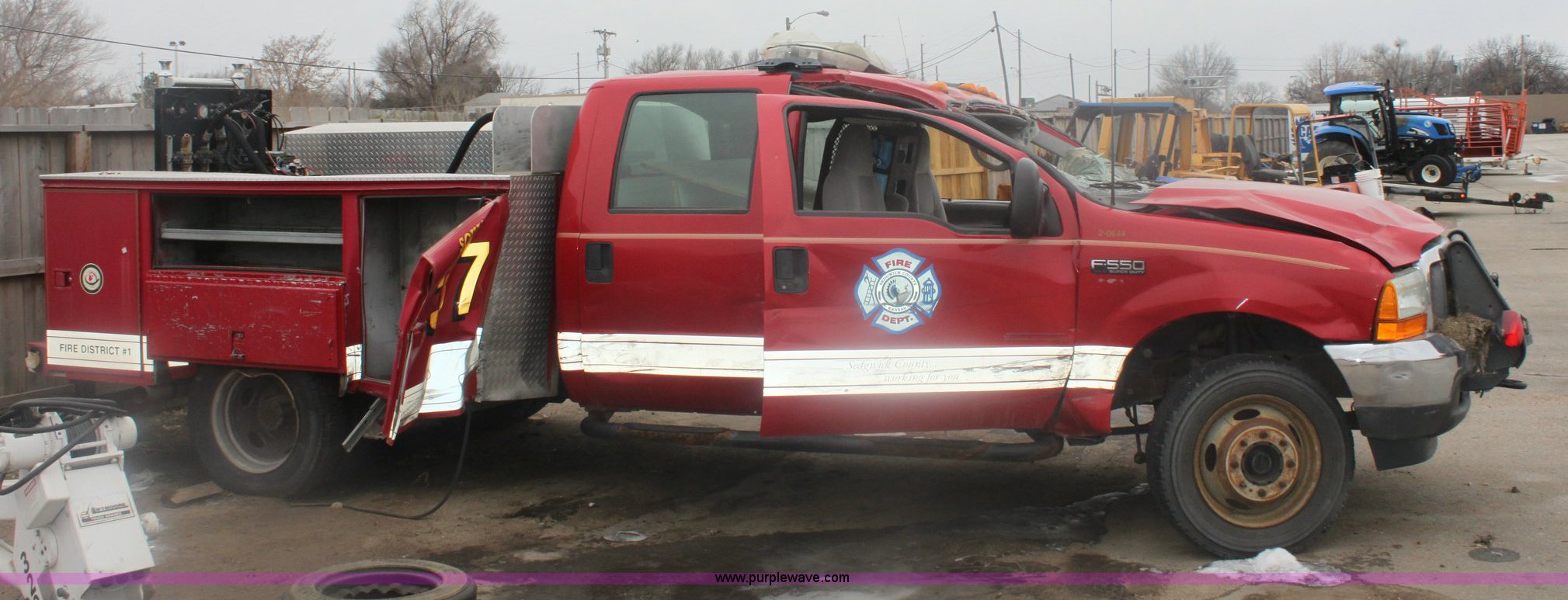 2001 Ford F550 XLT Super Duty pickup truck. 65,407 miles on odometer, V8 7.3L turbo diesel engine 205-235HP, Automatic transmission, Four wheel drive, AC and heat, Tilt, Cruise, AM/FM/Cassette, Power windows, locks, and mirrors, Utility bed, 225/70R19.5 tires, Vehicle been rolled, Inoperable. Water pump and motor for pump not included. 1FDAW57F41ED33568. Shipping quotes available. Sedgwick County Fire Dept. 1021 Stillwell. Wichita, KS 67213