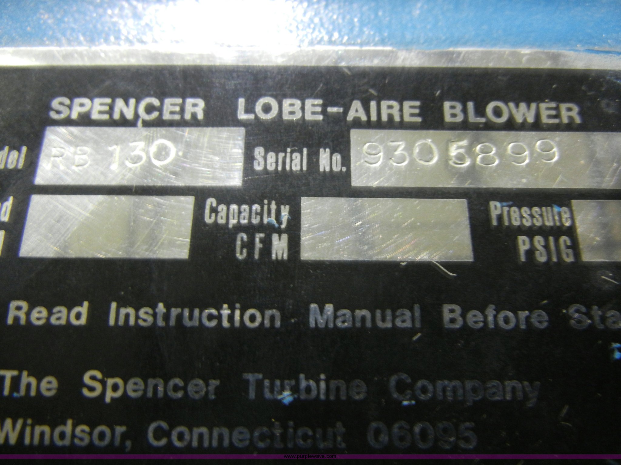 Purple Wave is selling a used Tools in Kansas. This item is a Spencer Lobe air blower with the following: Model RB130, 3.25" shaft, Serial 9305899