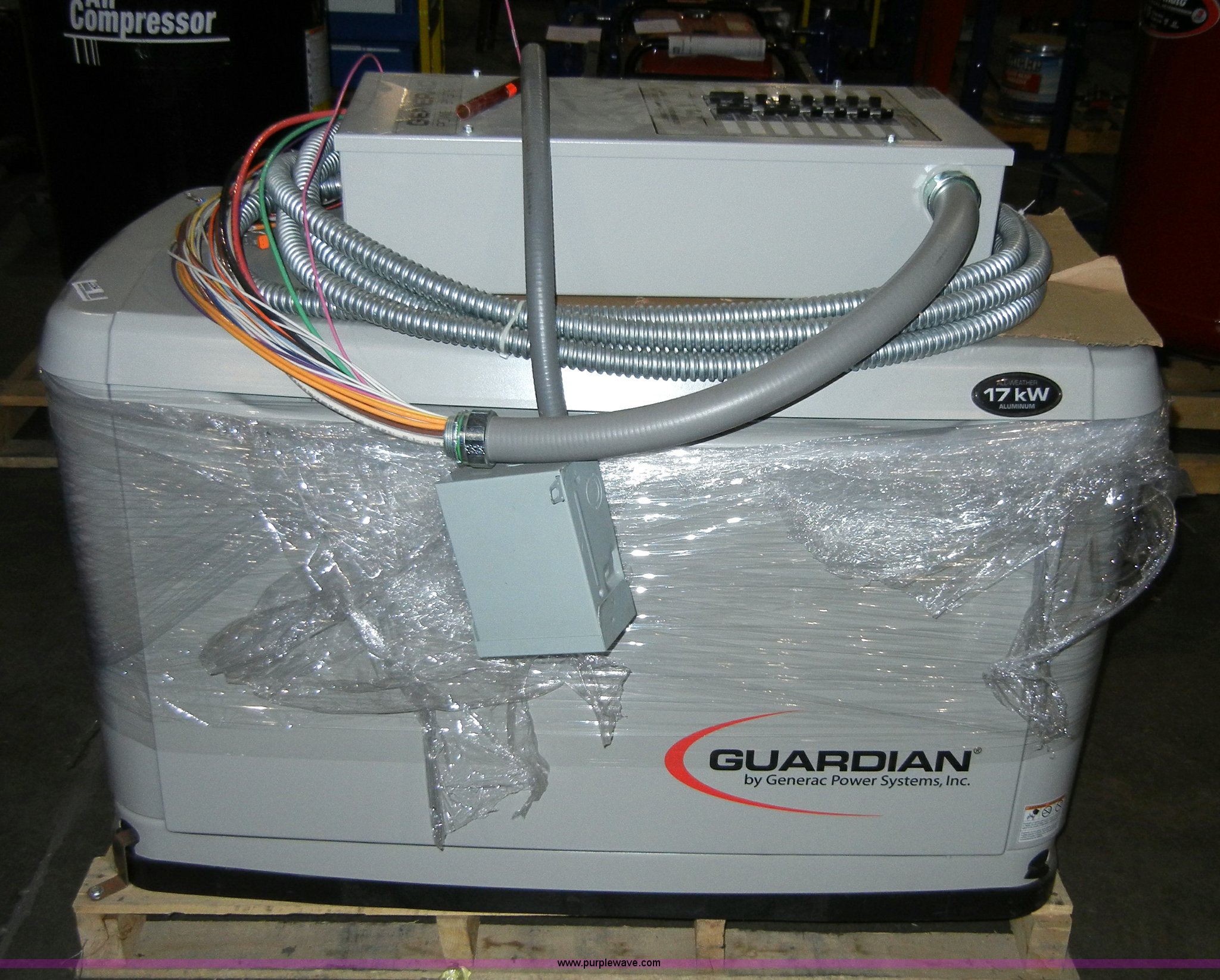 Purple Wave is selling a used Generator Set in Kansas. This item is a Guardian back up generator with the following: 17 kW, LP or natural gas, Breaker box