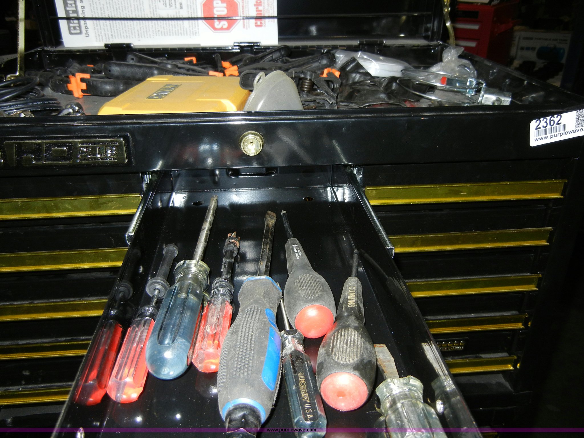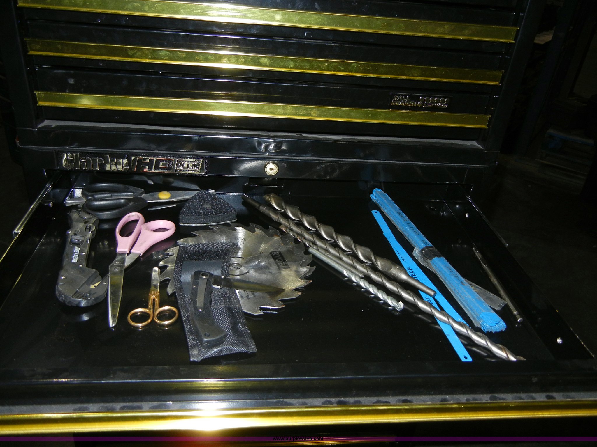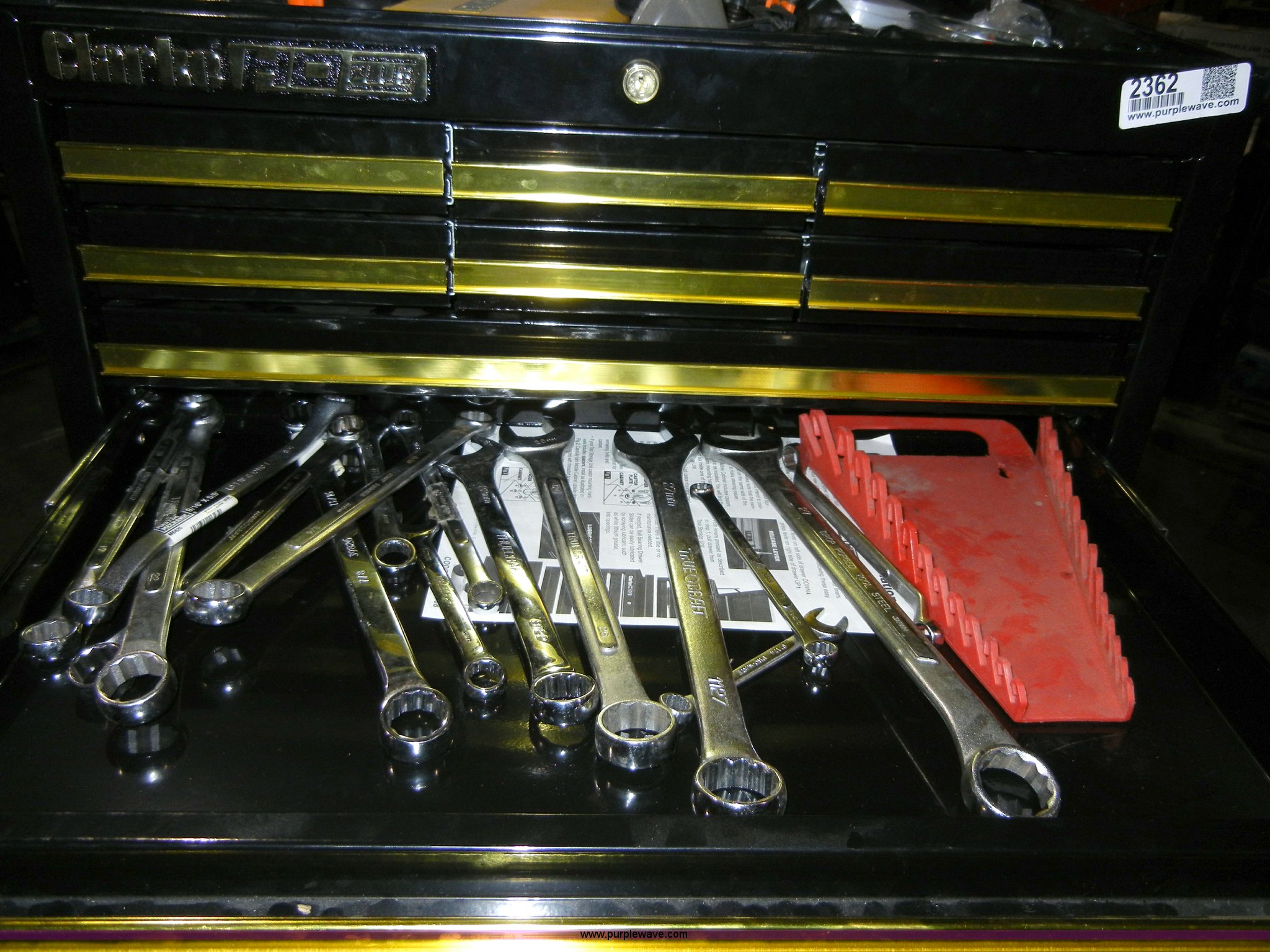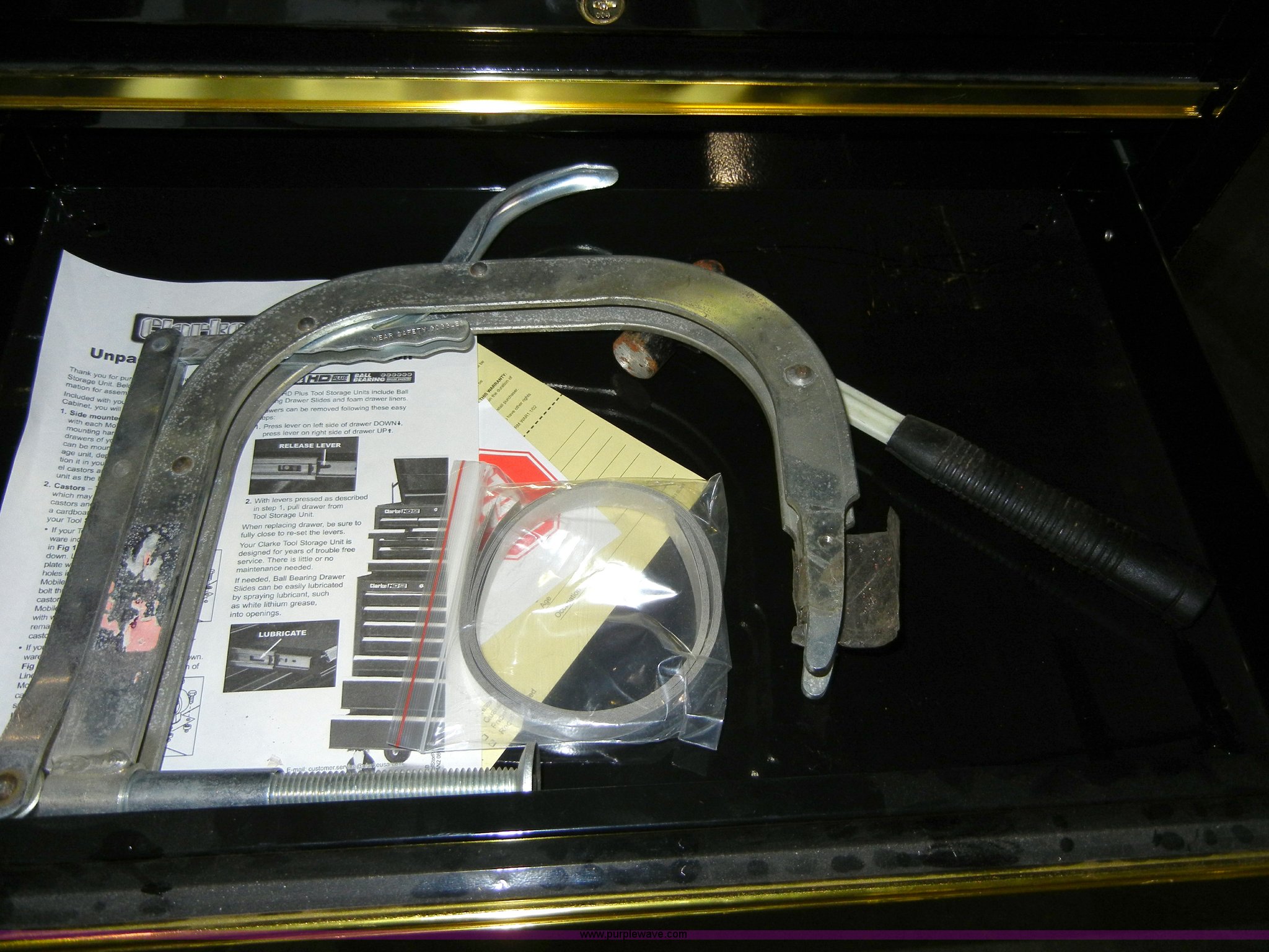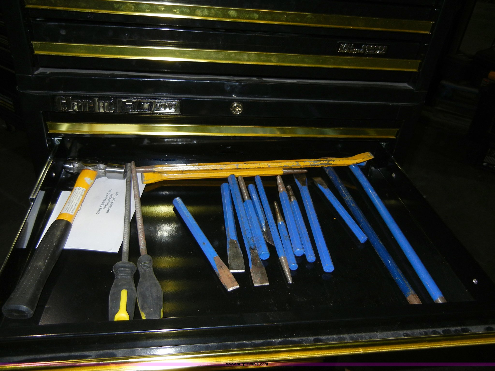 Purple Wave is selling a used Tools in Kansas. This item is a Assorted tools with the following: Clarke HD plus 19 drawer toolbox, Ball bearing roller drawers, 27 x 18 x 62, 5" casters, 13 piece Husky 1/2" drive socket set with ratchet, 18 piece clamp set, Three piece all purpose paint brush set, 10 piece Dewalt drill bit set with counter set bits, Nine piece screwdriver set, 14 piece plier set, 11 piece torx socket set, 66 piece sockets 1/4", 3/8", 1/2" drives with ratchets, 17 piece combo wrench set metric/SAE, 15 piece chisel set, Two piece rat tail file set, 10 piece T-handle hex set, 23 piece jumbo socket set 3/4" drive, Four piece pipe wrench set, 12 volt air compressor