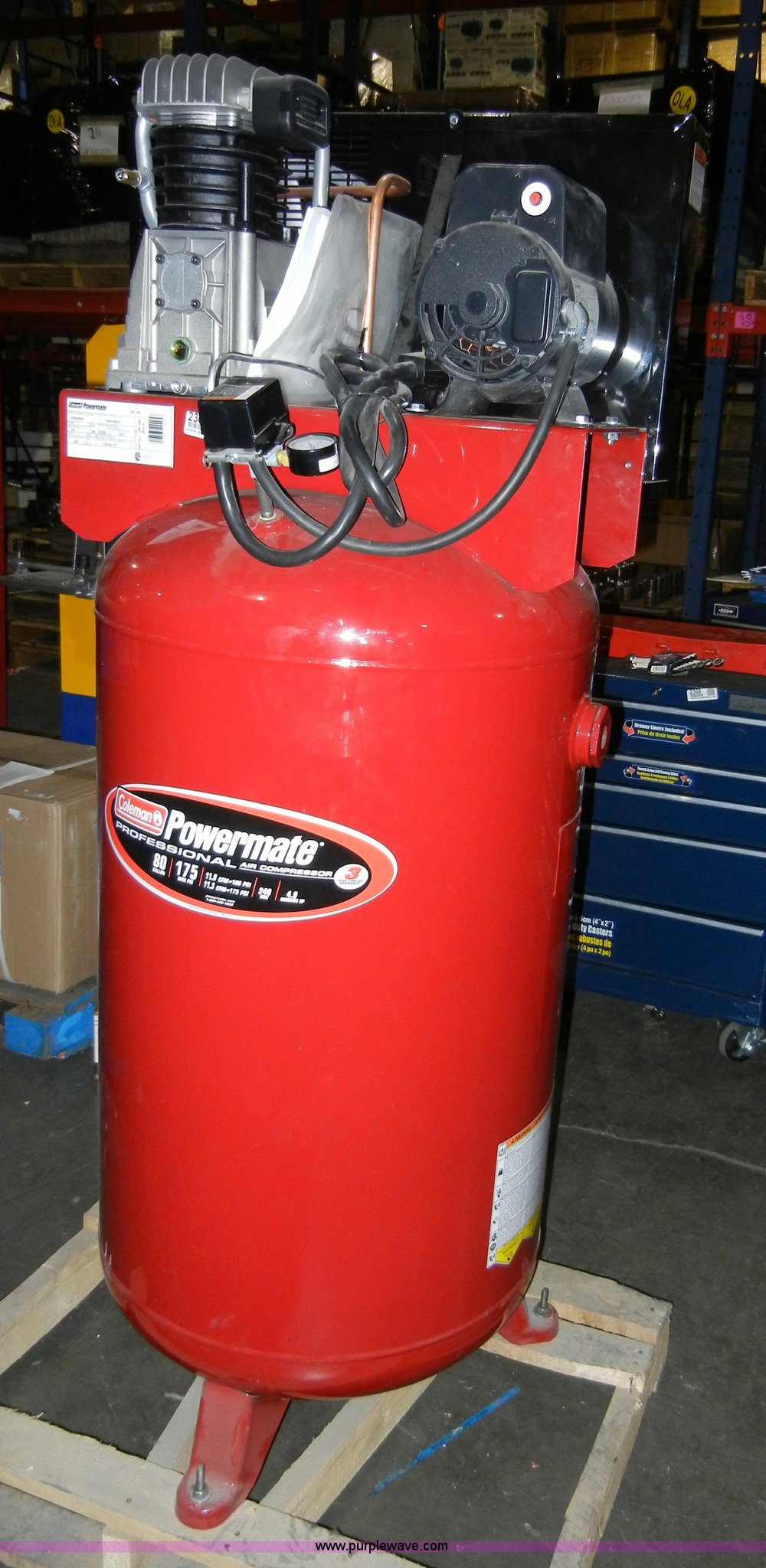 Purple Wave is selling a used Air Compressor in Kansas. This item is a Coleman Powermate with the following: 80 gallon air compressor, 11.9 CFM at 100 psi, 11.3 CFM at 175 psi, 240 volt, Two stage, Aluminum pump, Single phase 4.9 HP motor