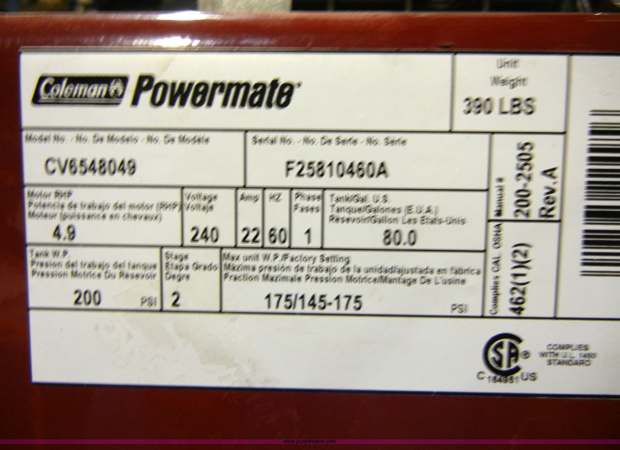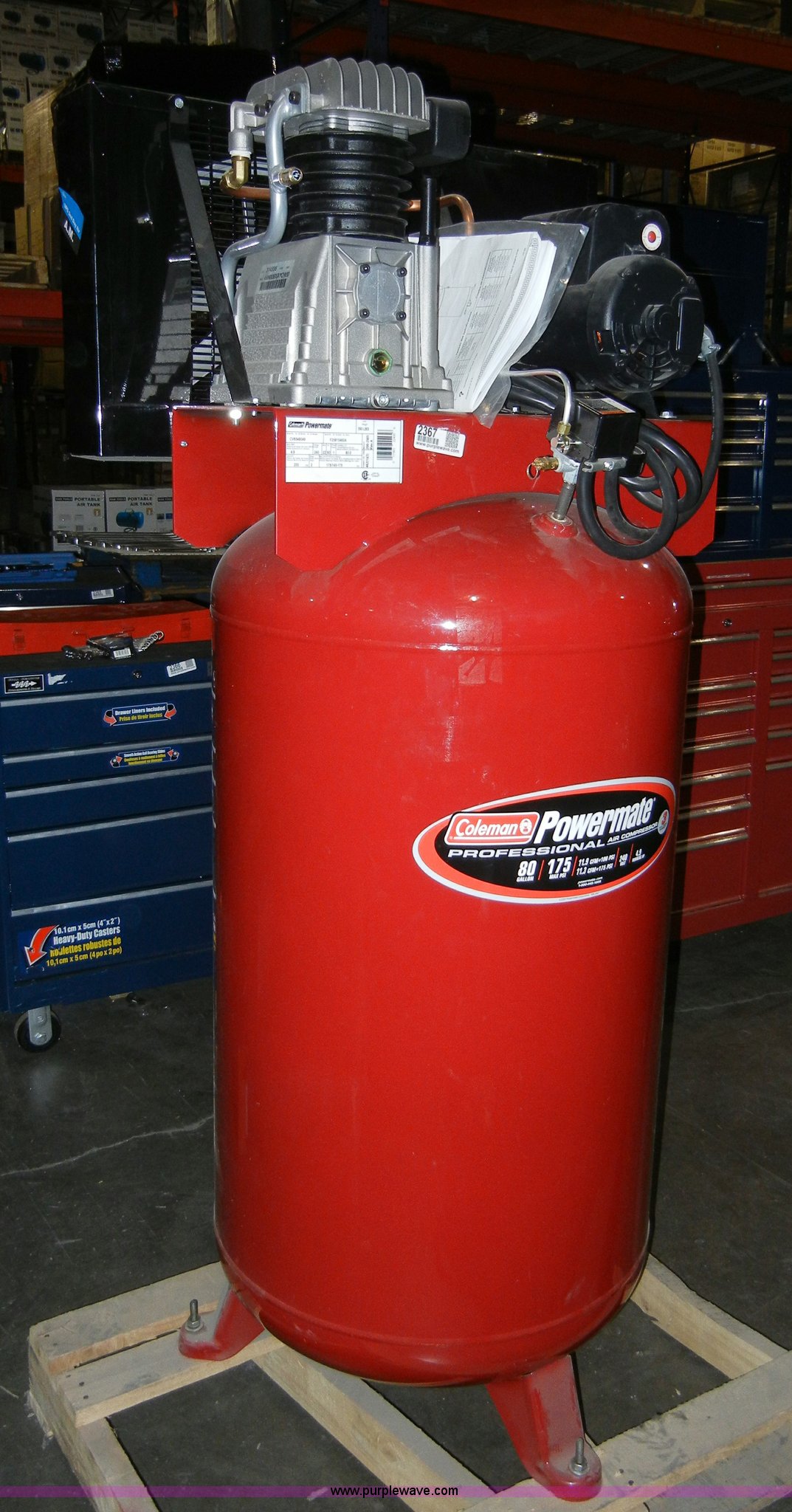 Coleman Powermate. 80 gallon air compressor, 11.9 CFM at 100 psi, 11.3 CFM at 175 psi, 240 volt, Two stage, Aluminum pump, Single phase 4.9 HP motor. Shipping quotes available. TAP Enterprises, Inc.. 650 North Lincoln St.. Spring Hill, KS 66083