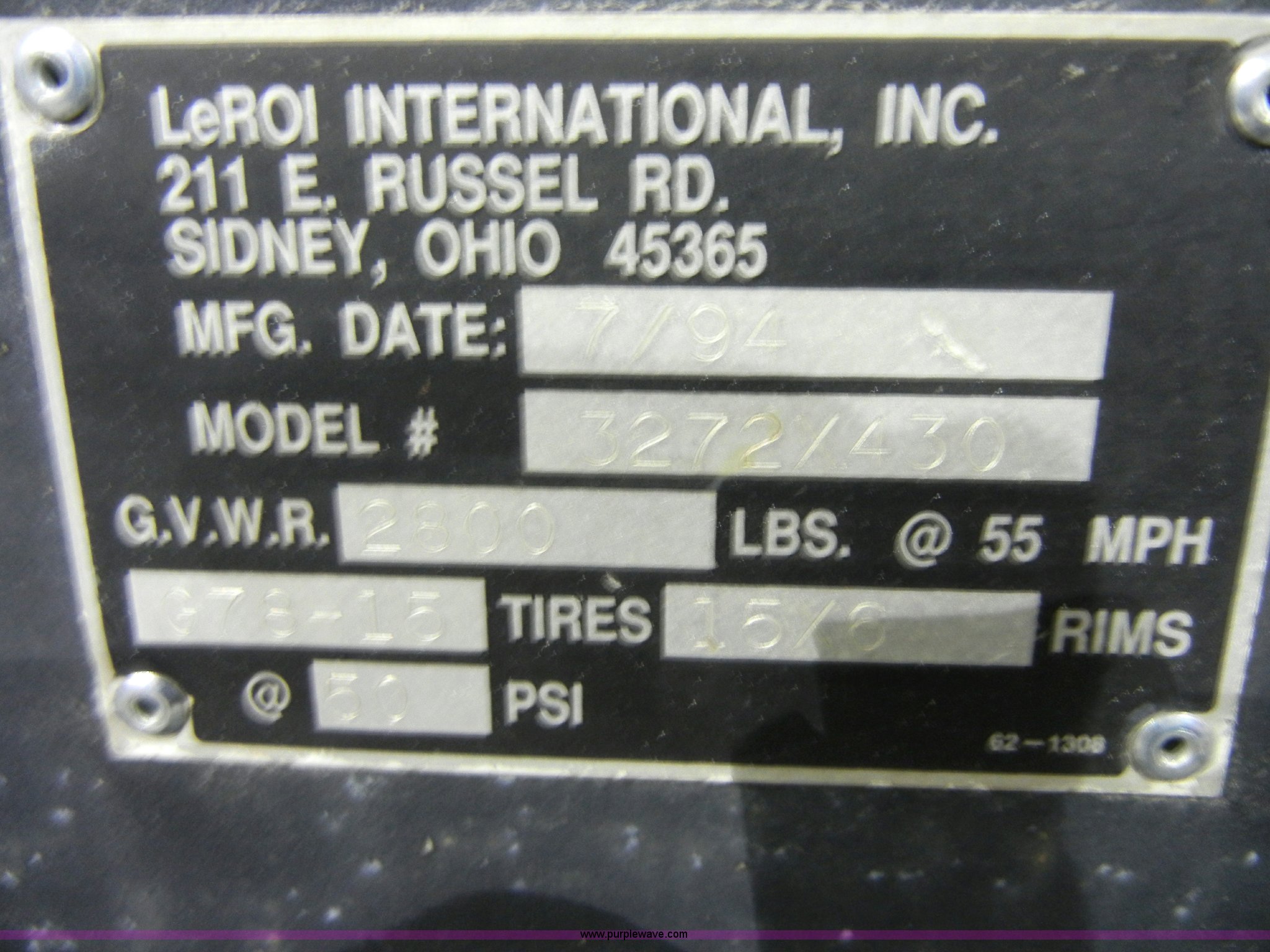 Purple Wave is selling a used Air Compressor in Kansas. This item is a 1994 LeRoi air compressor with the following: Model 3272/430, Four cylinder JD diesel engine, 722 hours, Atlas compressor, 750 CFM at 125 psi, 610 CFM at 150 psi, 507 CFM at 175 psi, 2" ball hitch