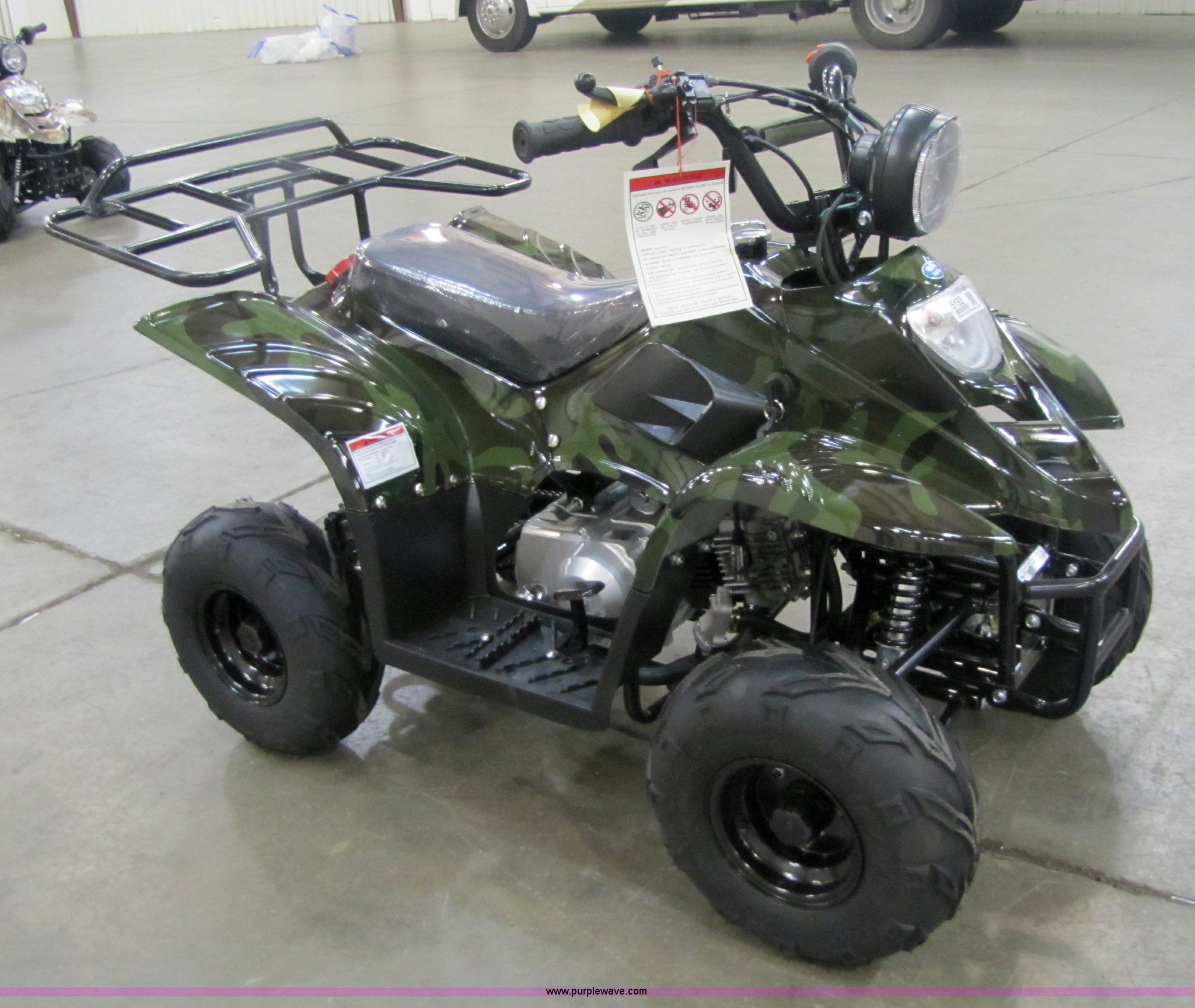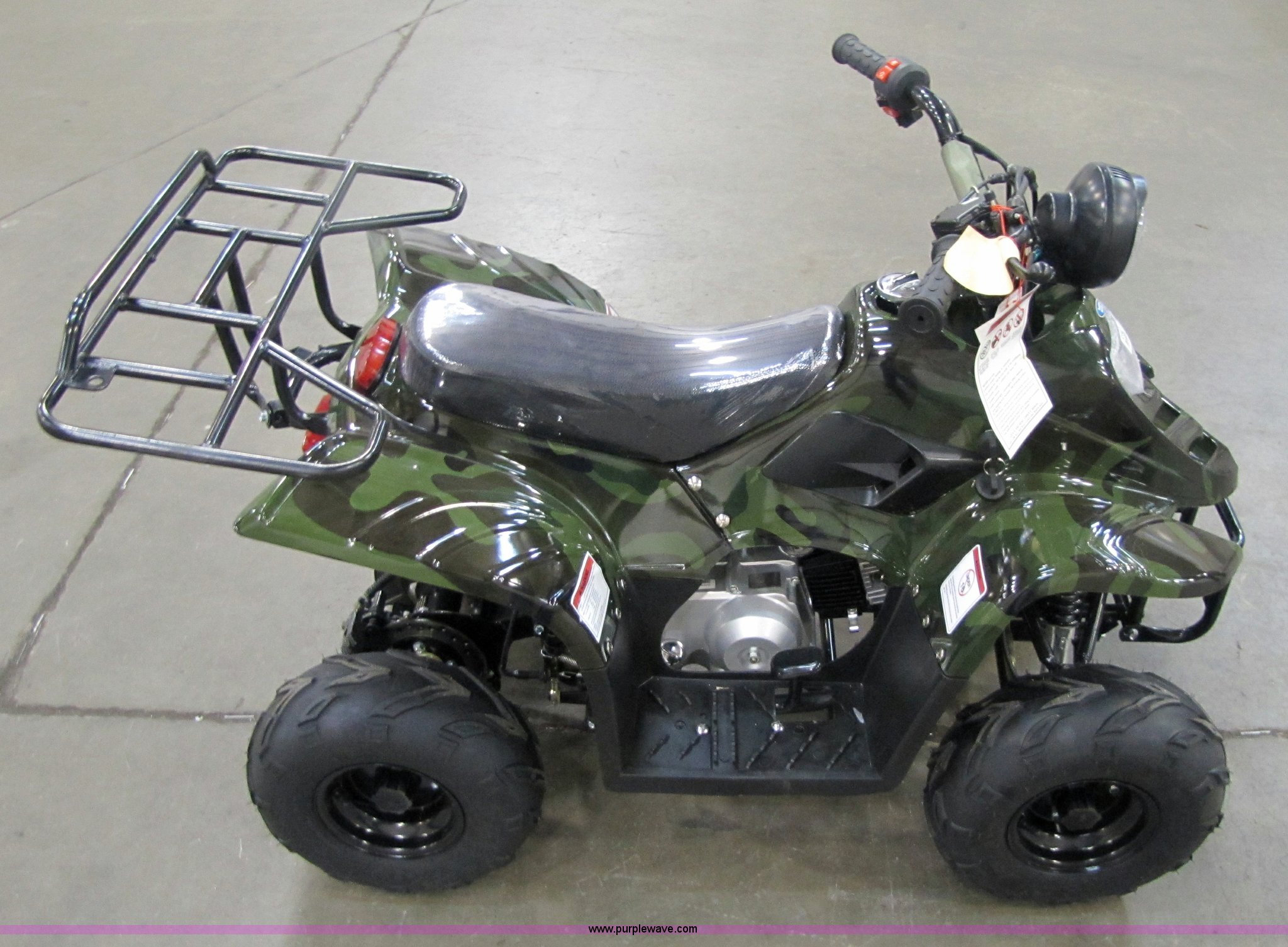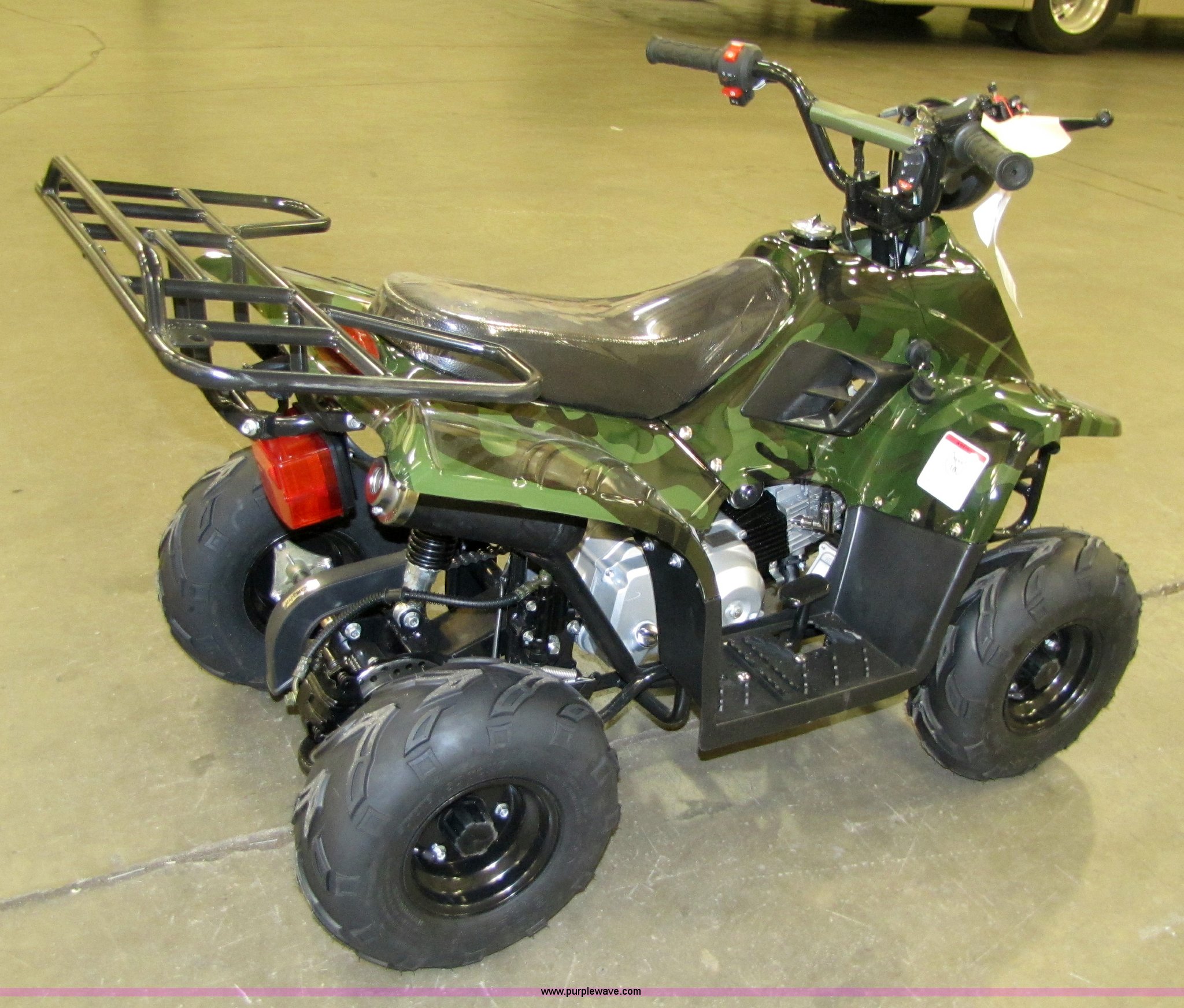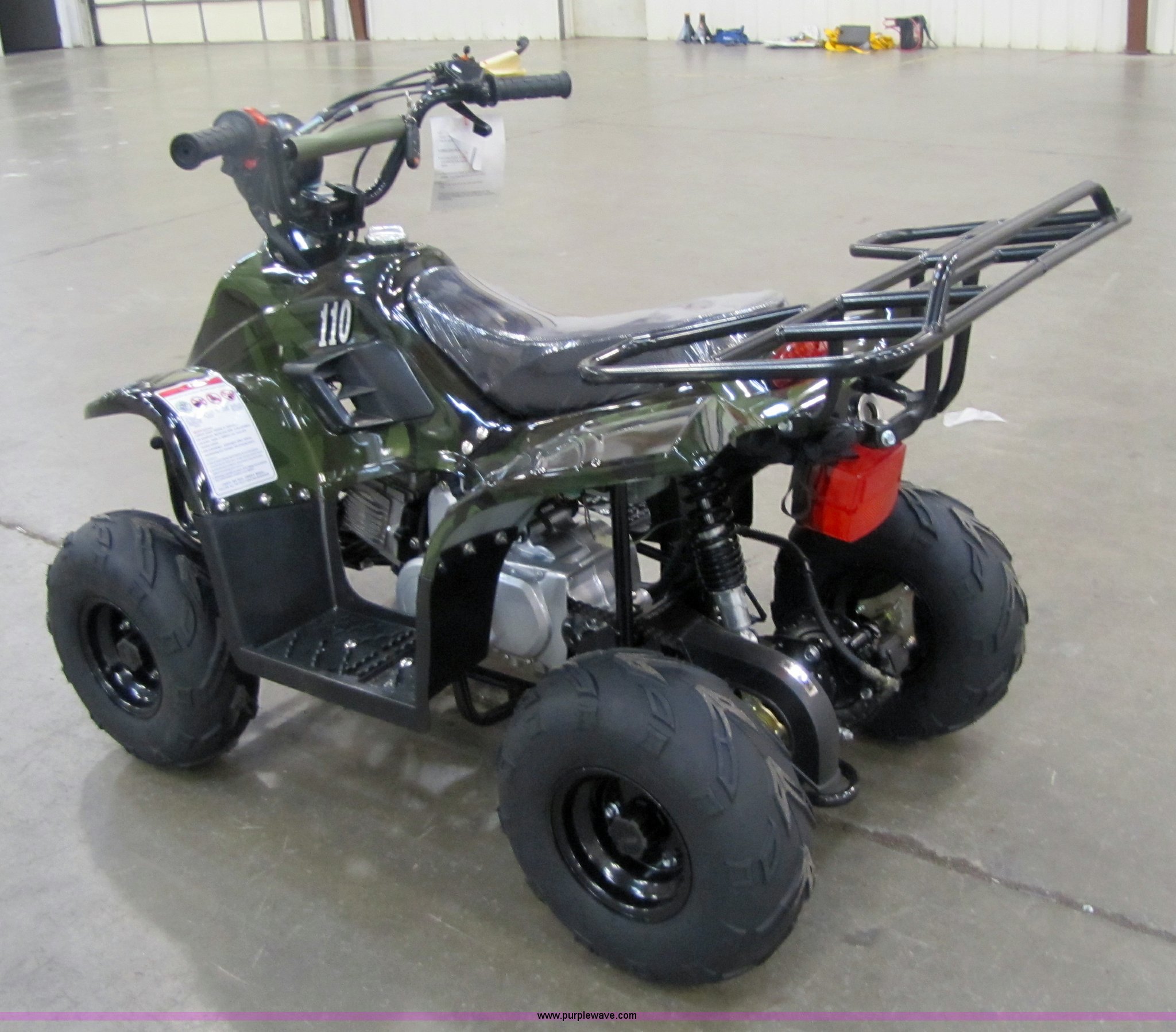 Purple Wave is selling a used ATV in Kansas. This item is a Tao Tao ATA110-B ATV with the following: 107cc four-stroke engine, Automatic transmission, Electric start, Remote control starter and kill switch, Air cooled, Gross weight 242 lbs, Overall size 45.7" x 28" x 33.3", Manufactured 2010-07, Green camo, Unit assembled but needs professional inspection before use, Seized