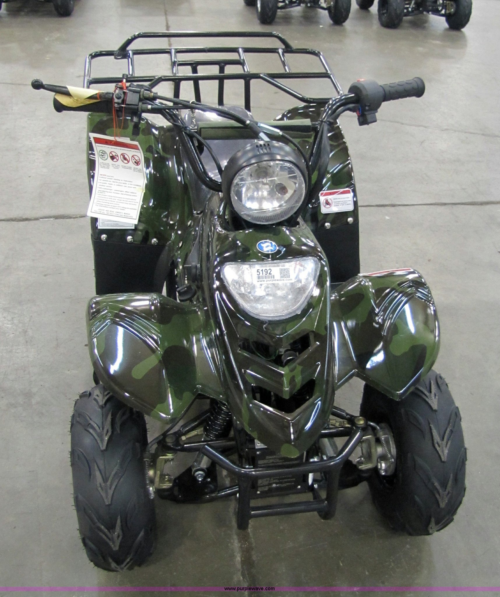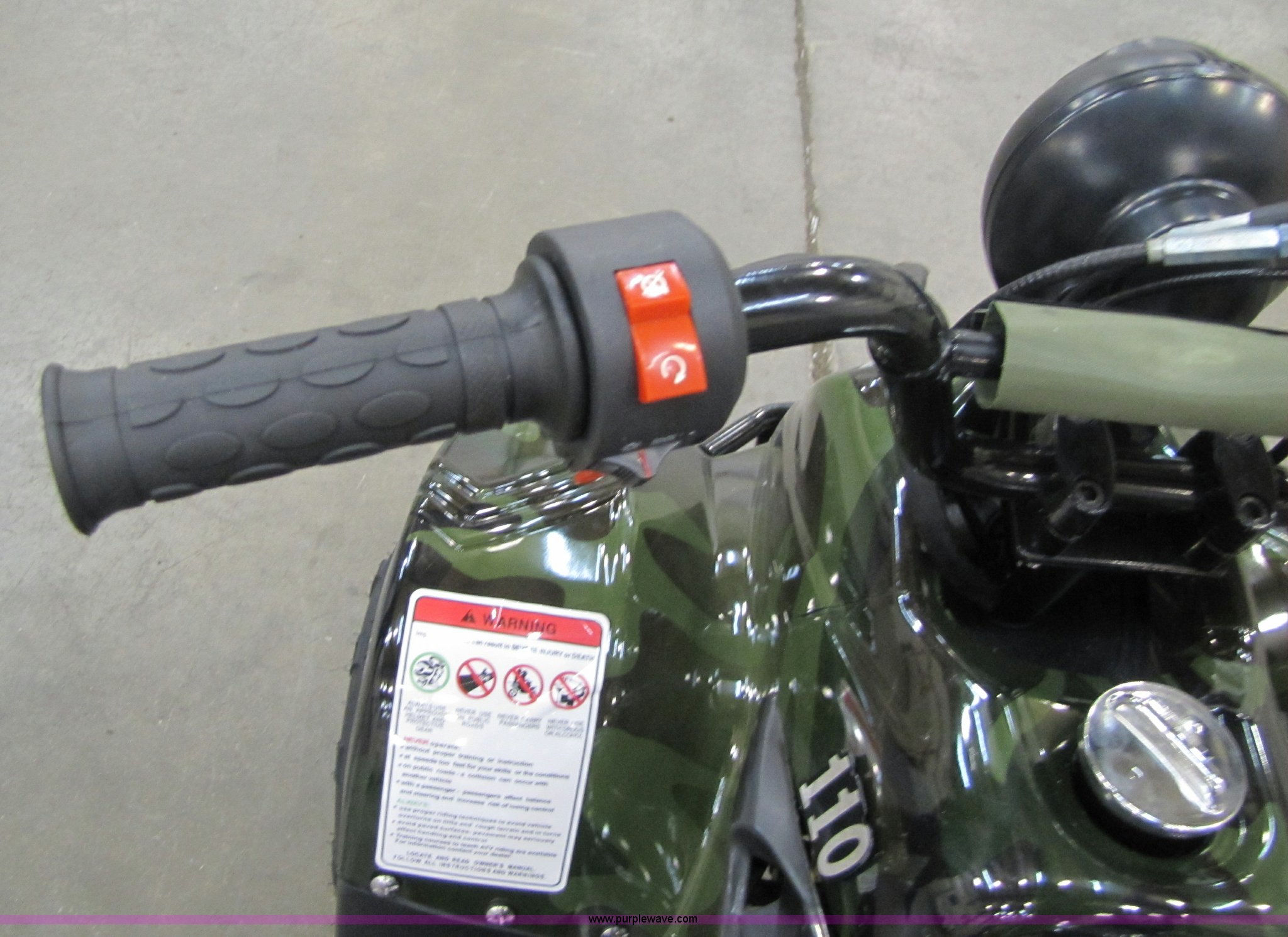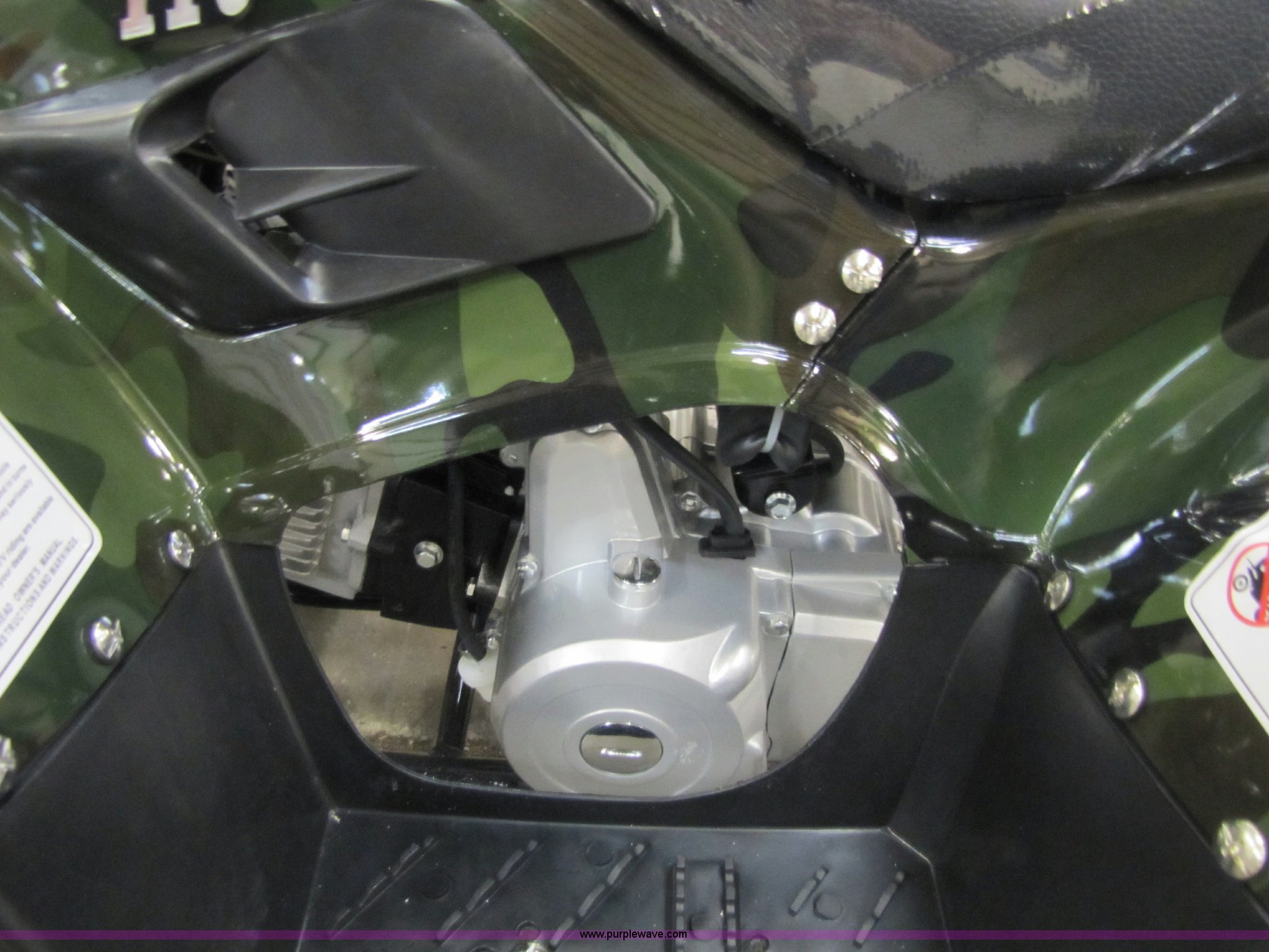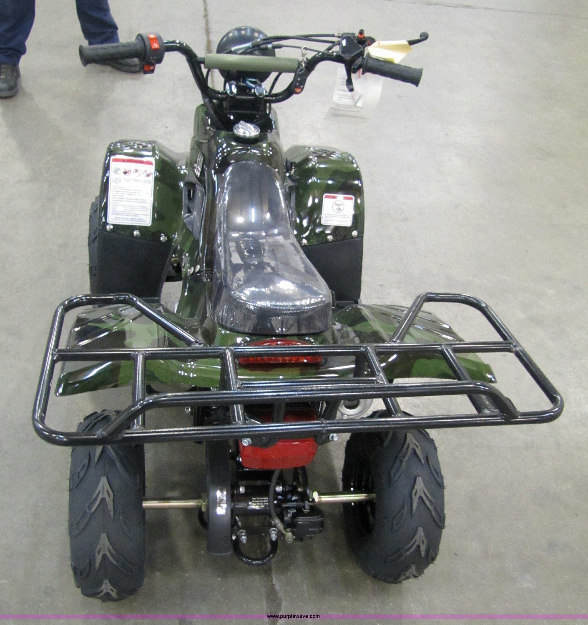 Purple Wave is selling a used ATV in Kansas. This item is a Tao Tao ATA110-B ATV with the following: 107cc four-stroke engine, Automatic transmission, Electric start, Remote control starter and kill switch, Air cooled, Gross weight 242 lbs, Overall size 45.7" x 28" x 33.3", Manufactured 2010-07, Green camo, Unit assembled but needs professional inspection before use, Seized