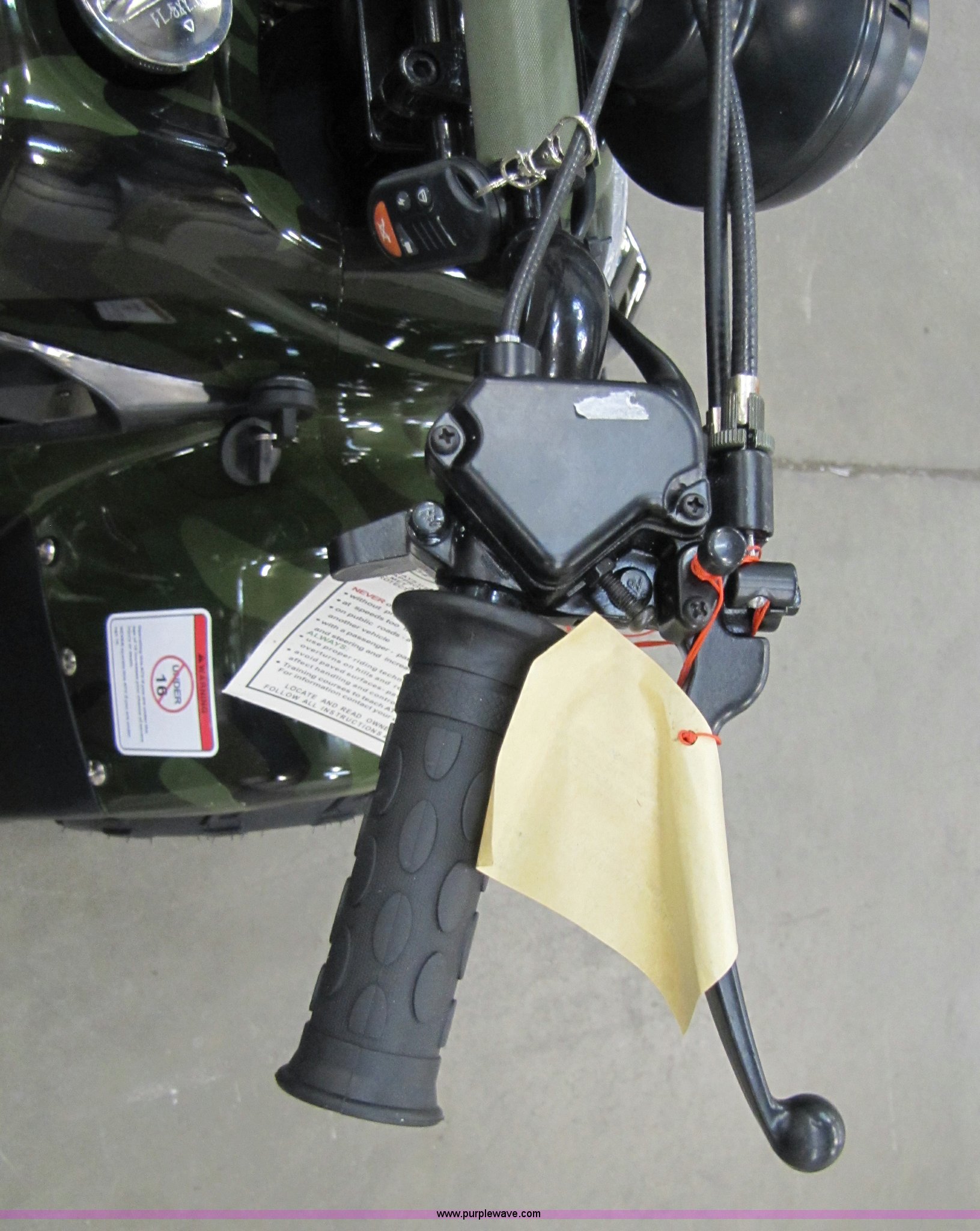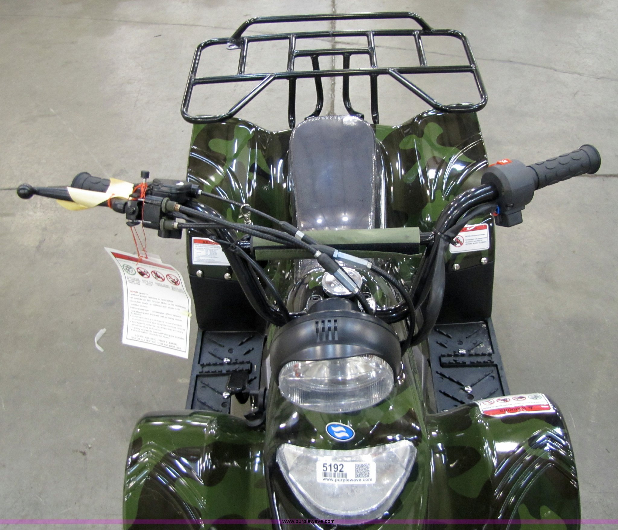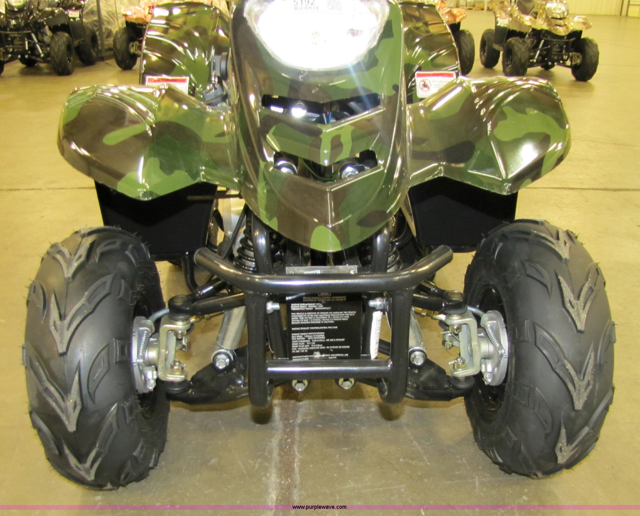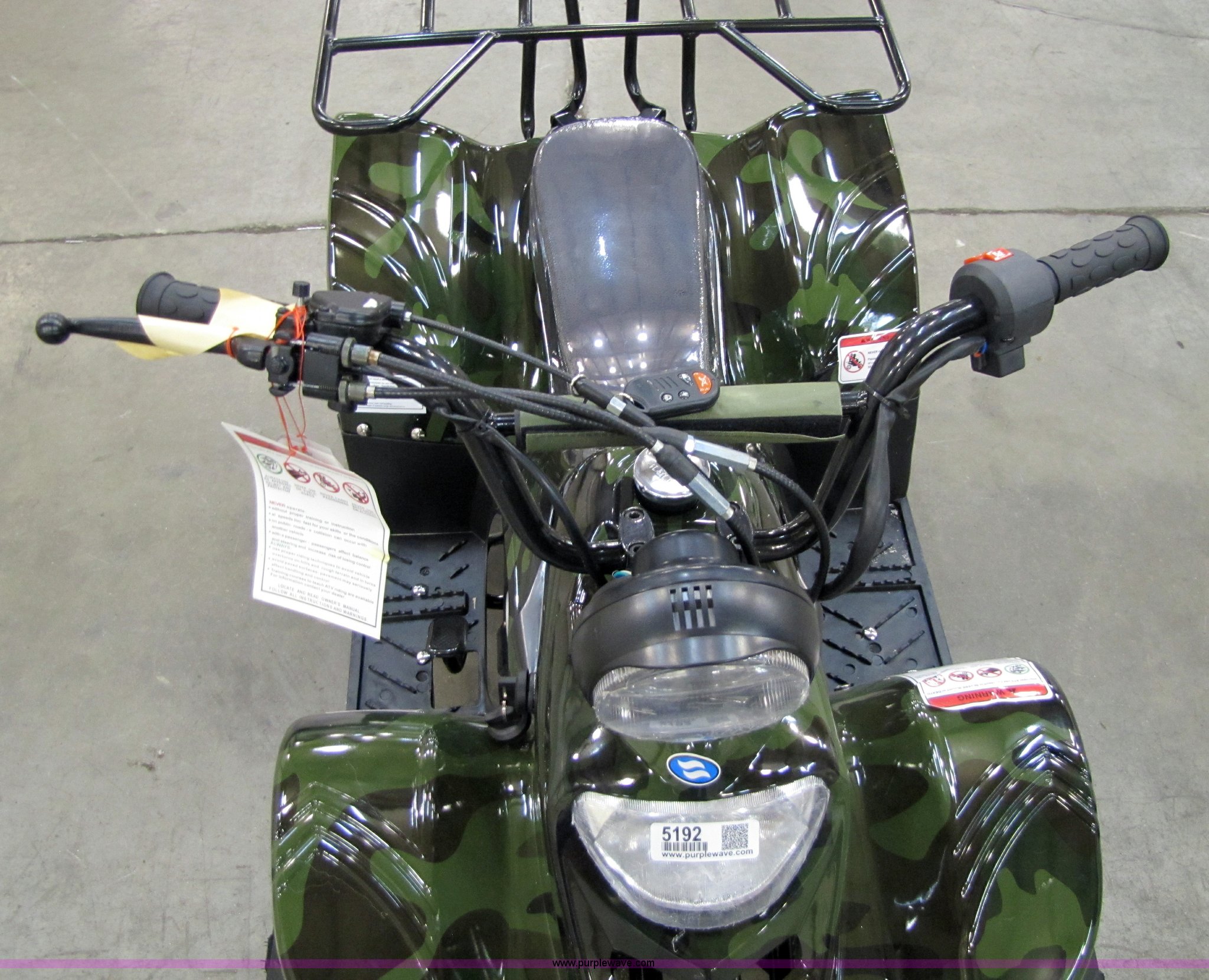 Purple Wave is selling a used ATV in Kansas. This item is a Tao Tao ATA110-B ATV with the following: 107cc four-stroke engine, Automatic transmission, Electric start, Remote control starter and kill switch, Air cooled, Gross weight 242 lbs, Overall size 45.7" x 28" x 33.3", Manufactured 2010-07, Green camo, Unit assembled but needs professional inspection before use, Seized