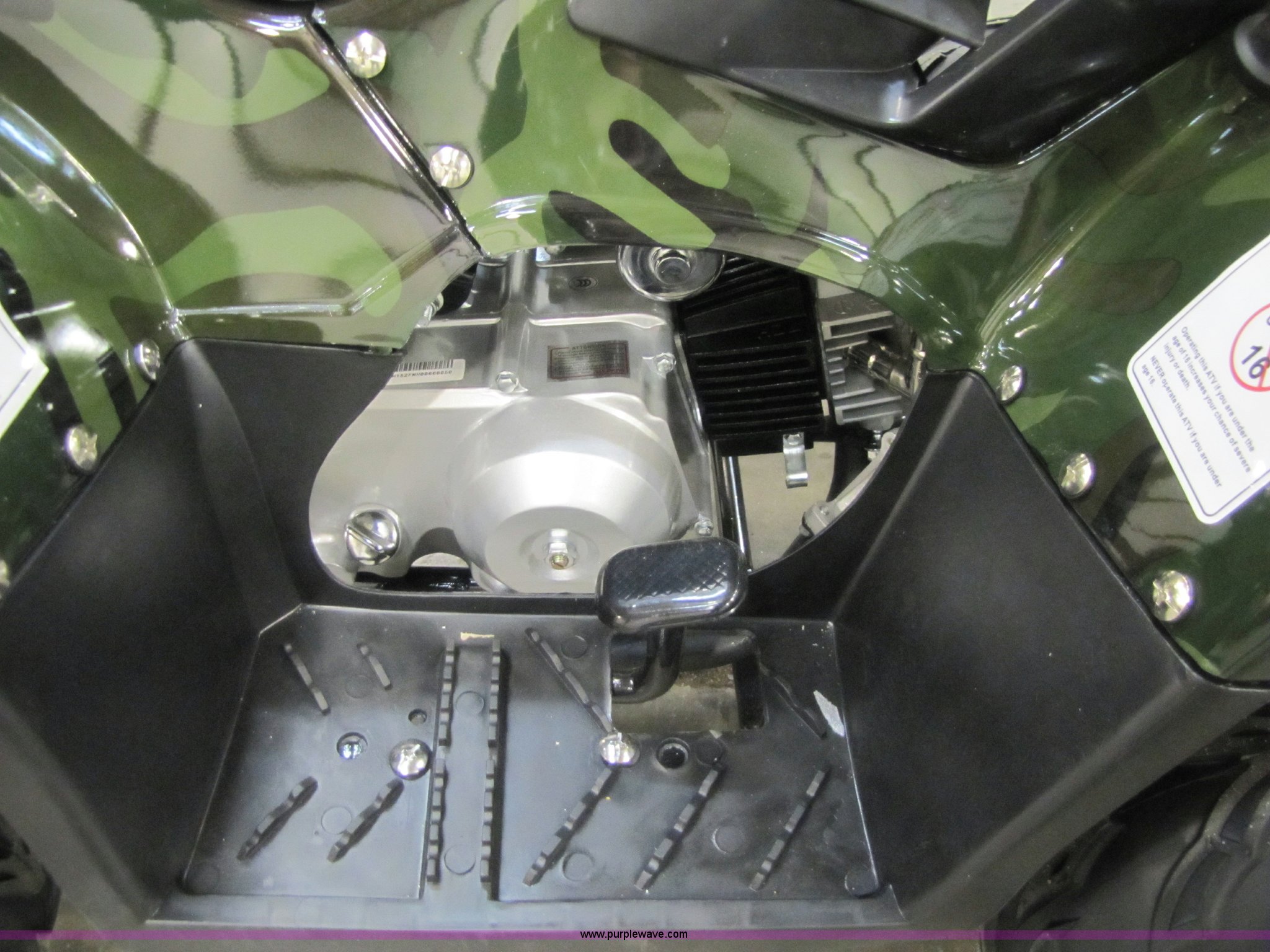 Purple Wave is selling a used ATV in Kansas. This item is a Tao Tao ATA110-B ATV with the following: 107cc four-stroke engine, Automatic transmission, Electric start, Remote control starter and kill switch, Air cooled, Gross weight 242 lbs, Overall size 45.7" x 28" x 33.3", Manufactured 2010-07, Green camo, Unit in crate, Seized