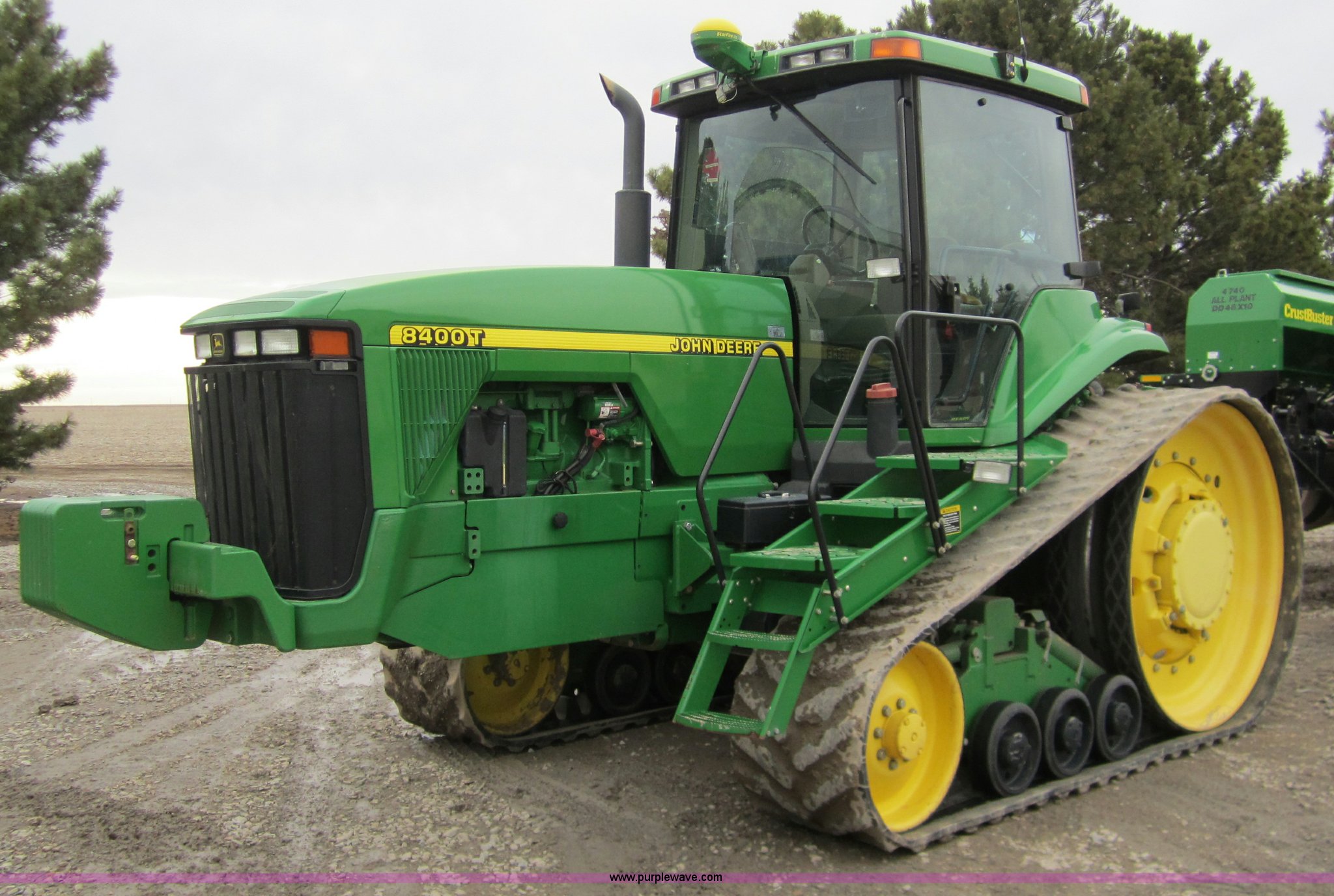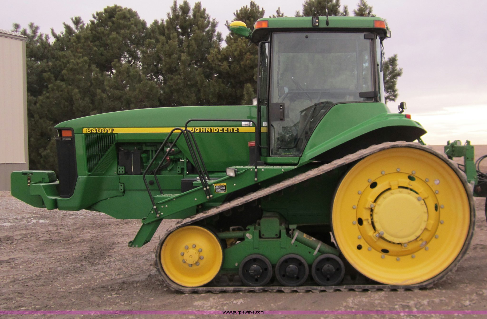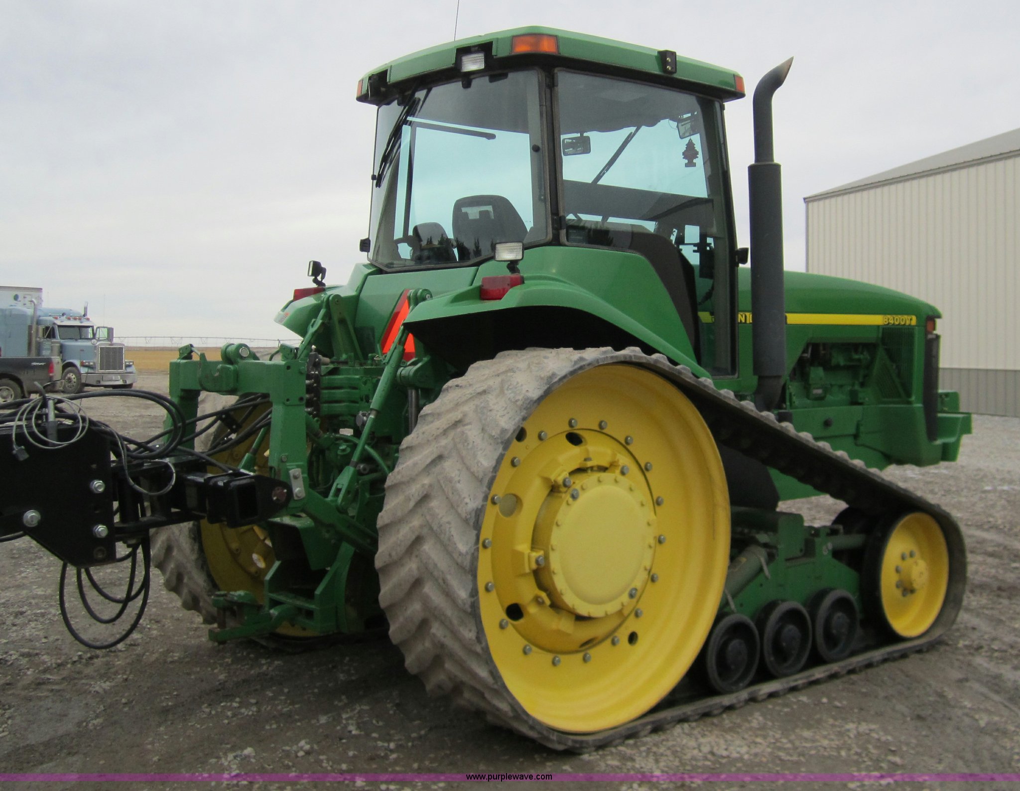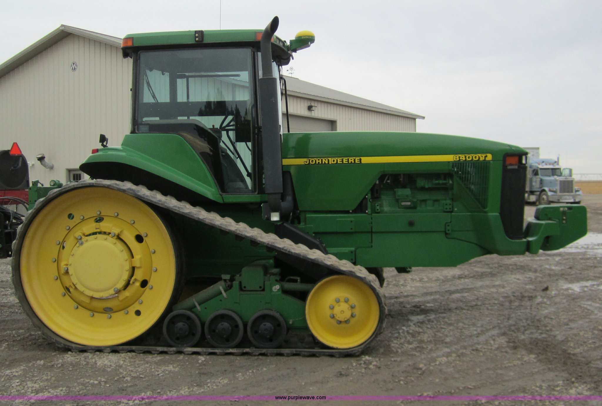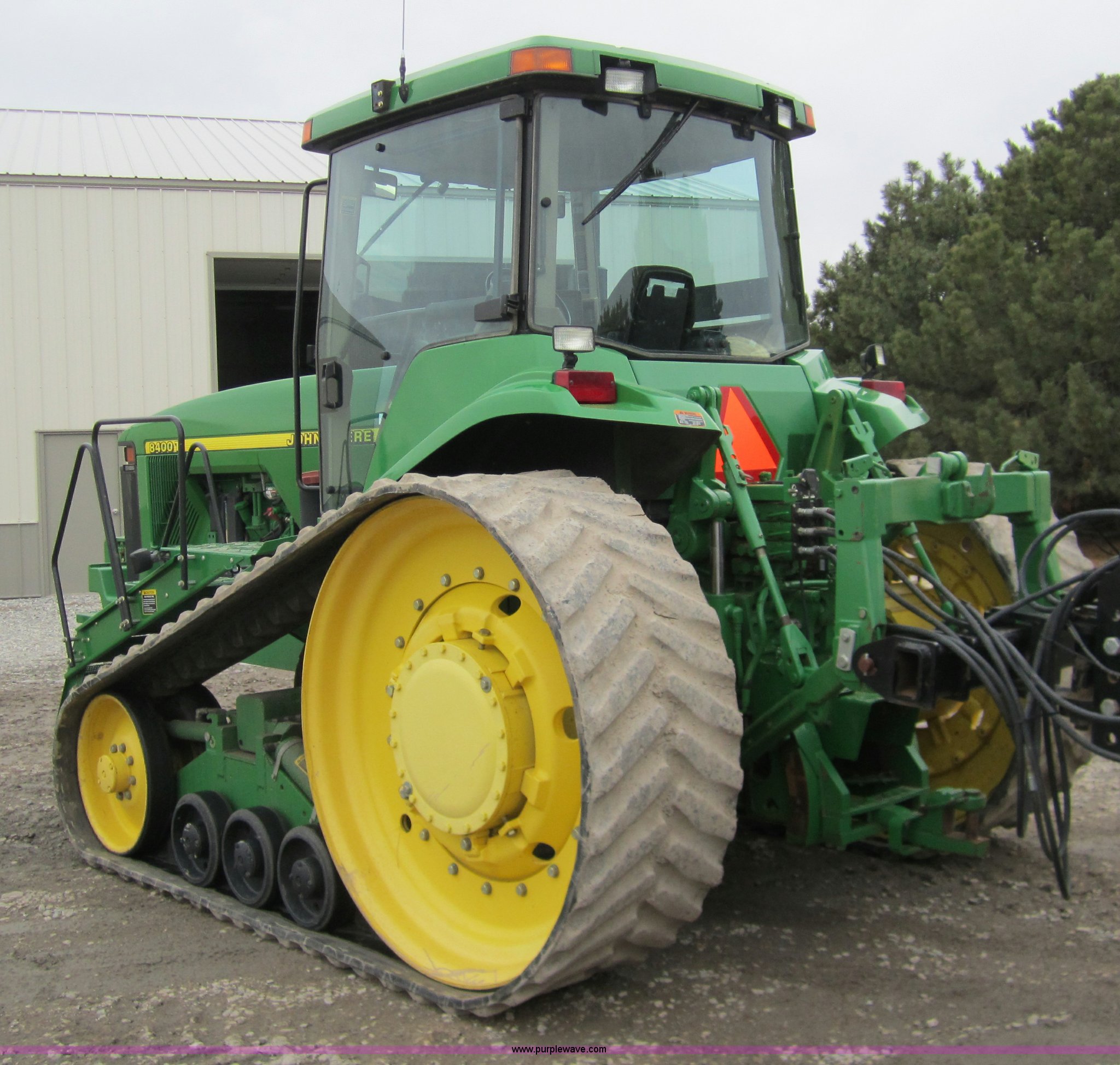 Purple Wave is selling a used Track Tractor in Kansas. This item is a 1997 John Deere 8400T track tractor with the following: 4,123 hours on meter, Six cylinder (496 CID) 360hp engine, Model 6081HRW03, Serial RG6081H41437, Powershift transmission, Air conditioning and heat, AM/FM radio, Instructors seat, Tilt steering wheel, Greenstar guidance system with Starfire iTC reciever, Three point with quick hitch, Drawbar, Large 1000 PTO, Three rear hydraulic remotes, Seven front suitcase weights, 24" wide tracks, 87" center to center track base, New Batteries, Serial ROAG8BT001260
