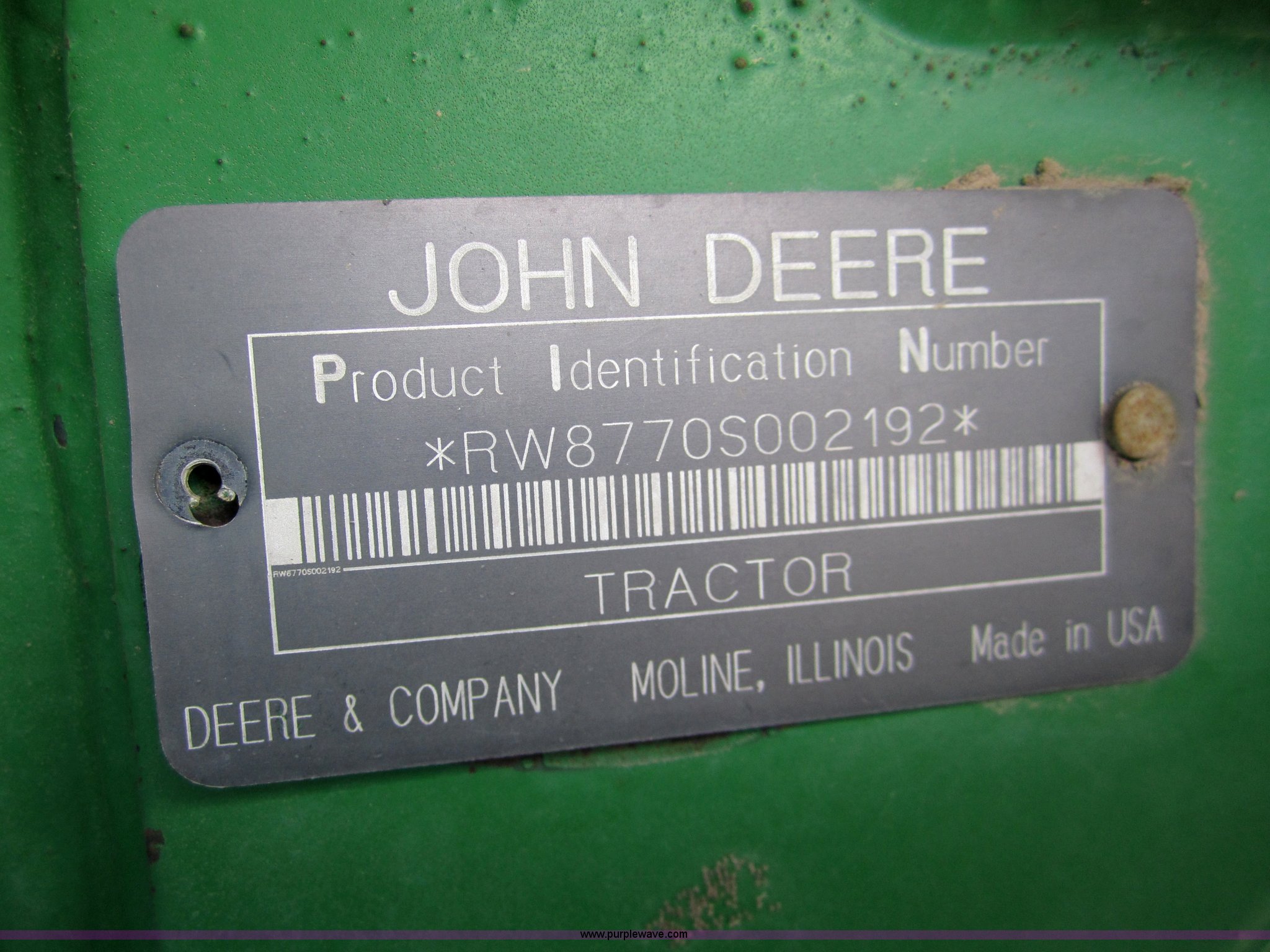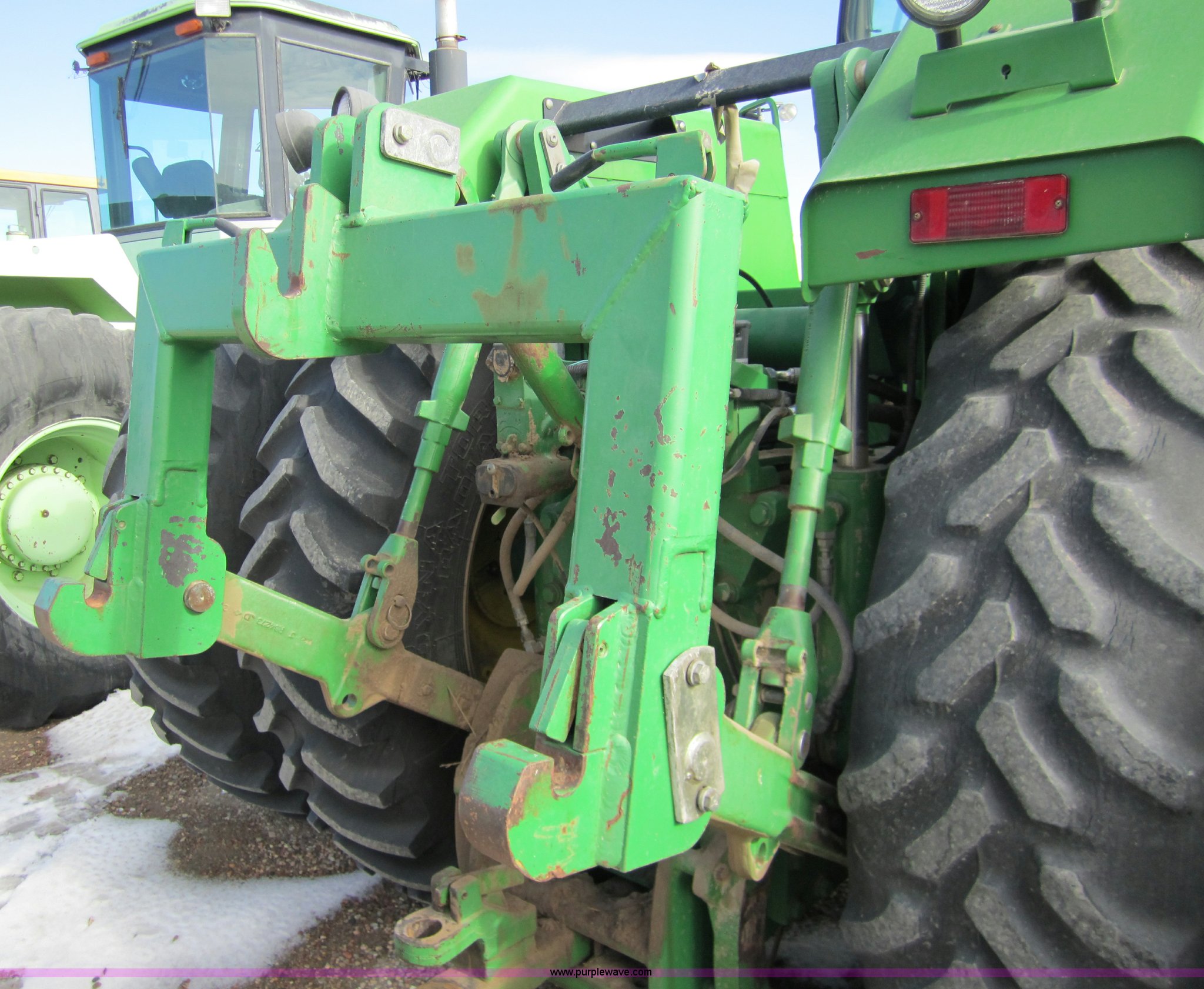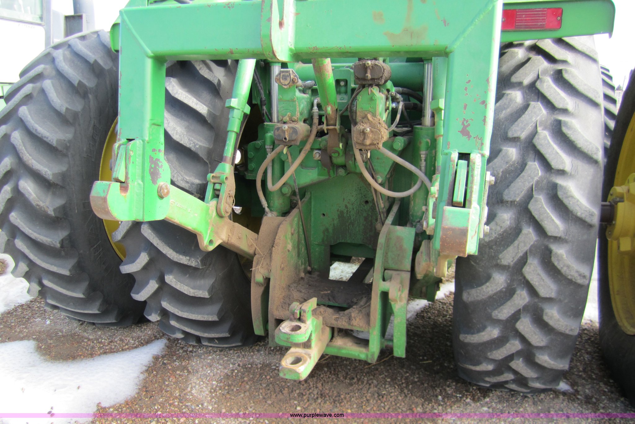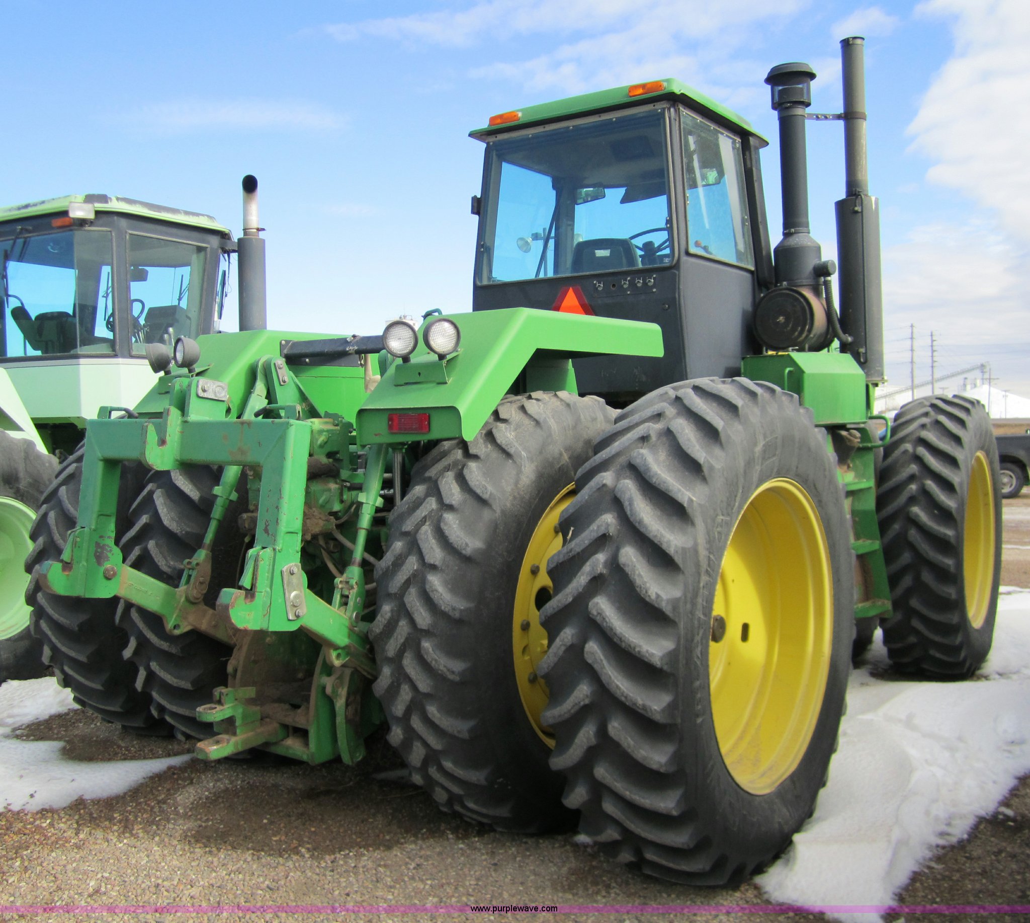 Purple Wave is selling a used Articulated 4-Wheel Drive Tractor in Kansas. This item is a 1994 John Deere 8770 tractor with the following: 9,107 hours on meter, Six cylinder 10.1L 350hp diesel engine, Synchro range 12 speed transmission, AC and heat, Tilt steering wheel, AM/FM, Visor, Ground radar, Three point with quick attach, Draw bar, (4) rear hydraulic remotes, 18.4R42 dual tires, Serial RW8770S002192