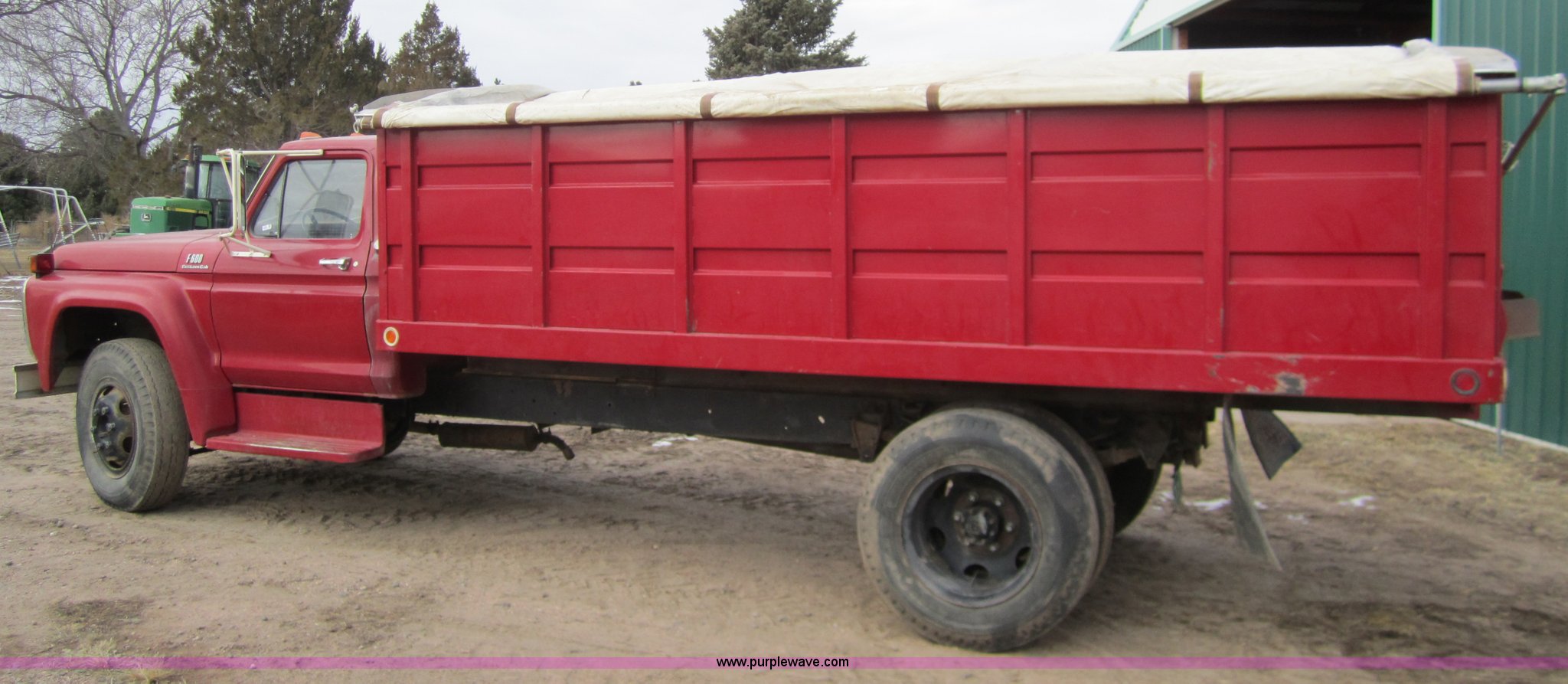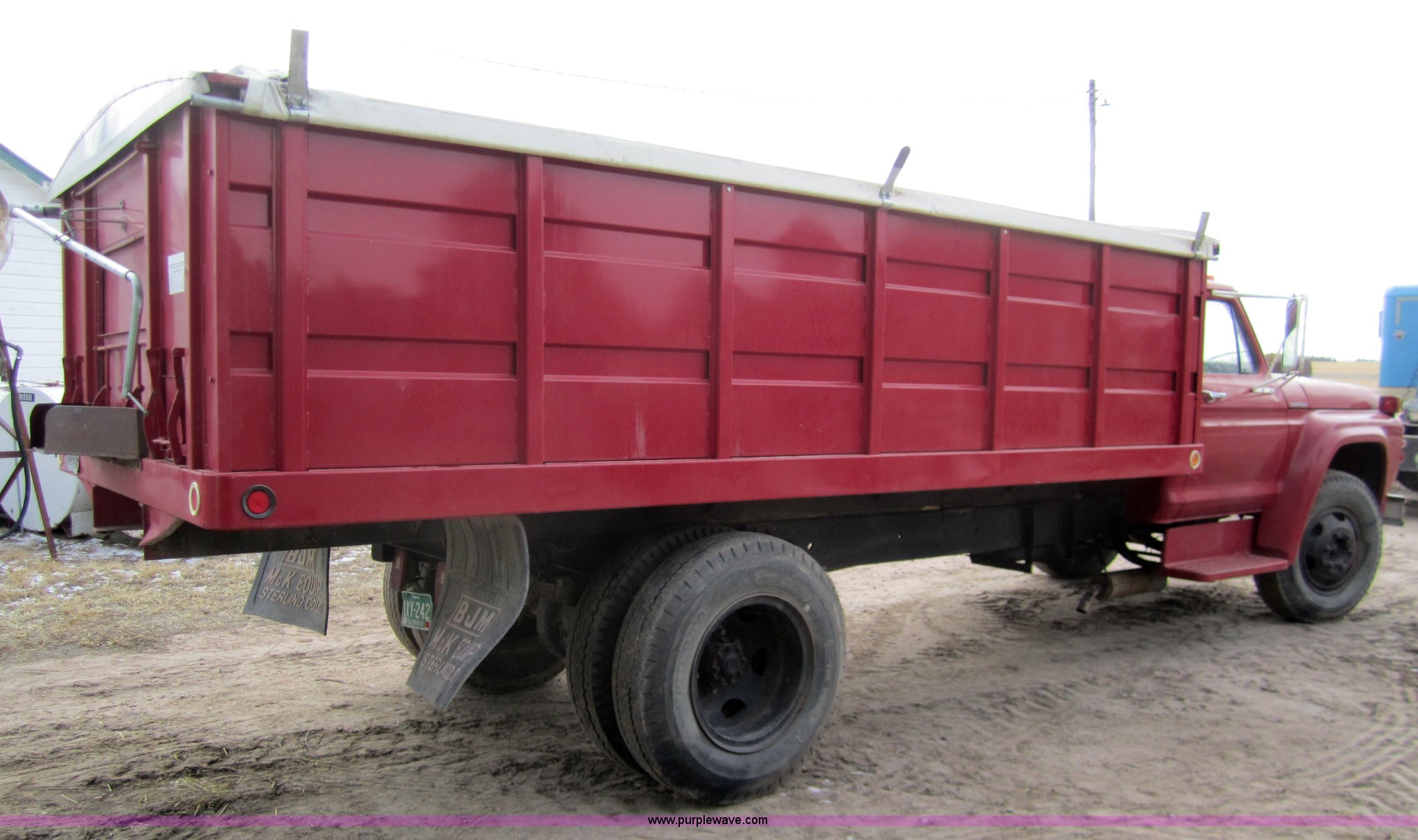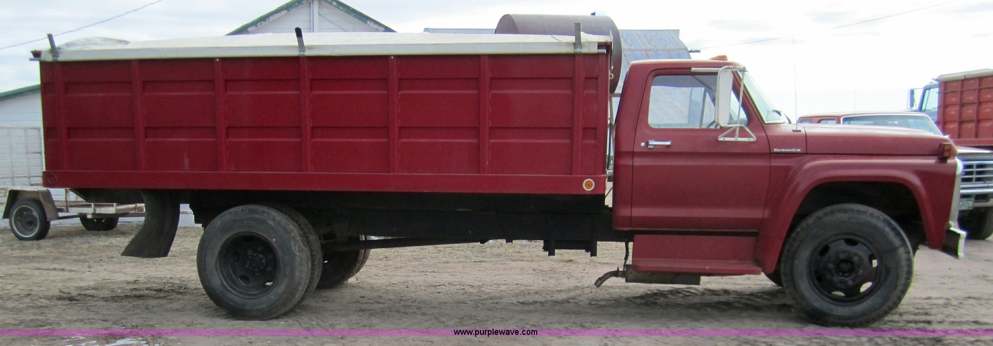Purple Wave is selling a used Grain Truck in Colorado. This item is a 1974 Ford F600 grain truck with the following: 53,936 miles on odometer, Ford 361 gas engine, Five speed manual transmission with Hi-Low axle, 16' bed, Roll over tarp, Wood floor, Single axle, 9.00 - 20 tires