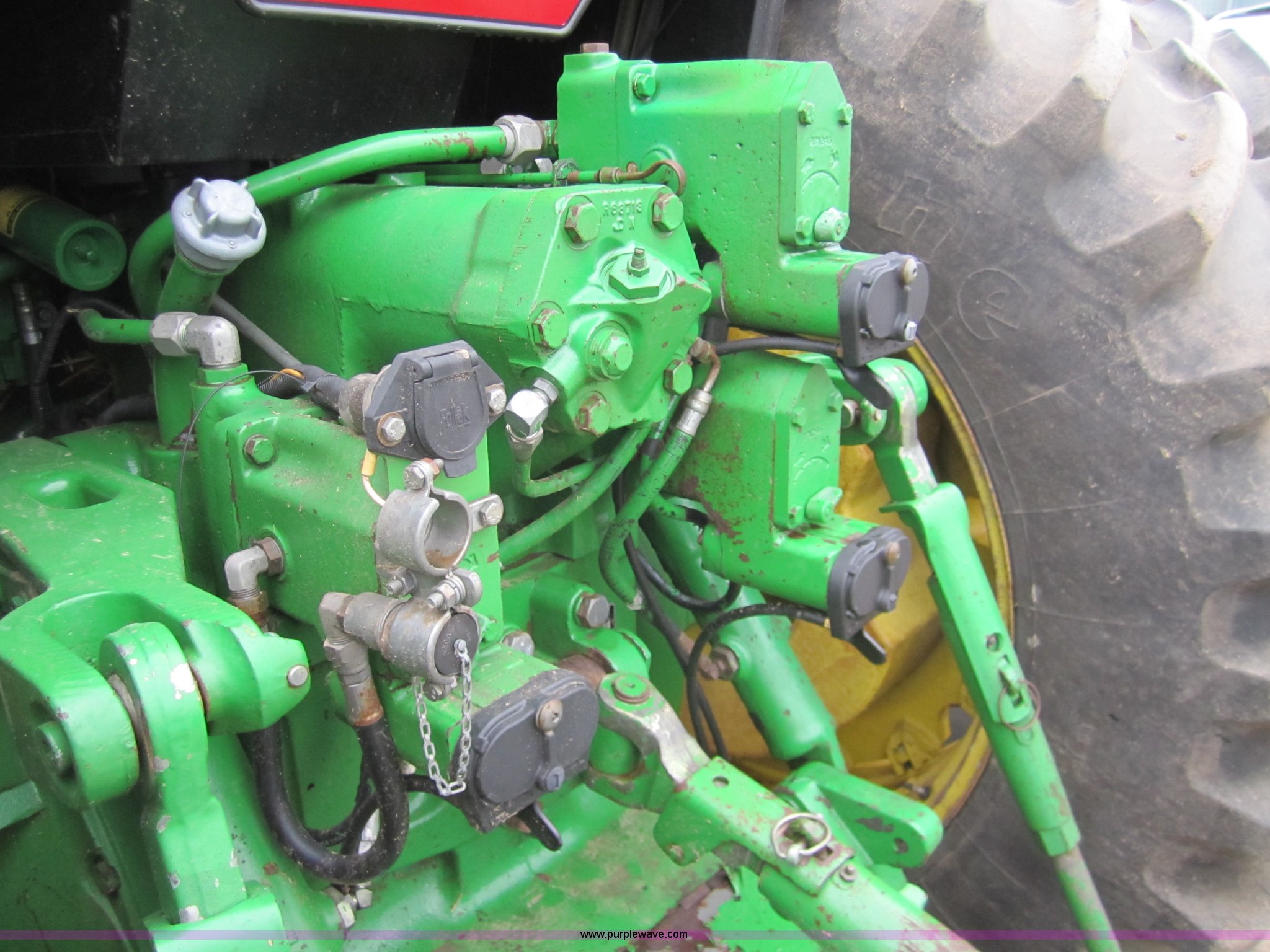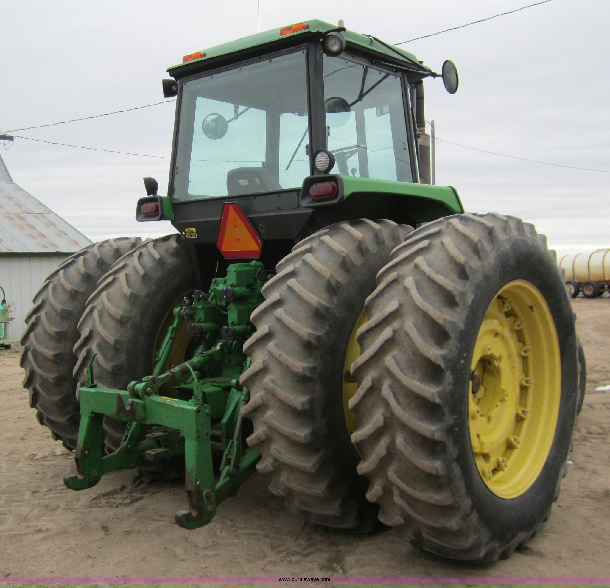 Purple Wave is selling a used Tractor in Colorado. This item is a 1988 John Deere 4850 tractor with the following: 8,510 hours on meter, John Deere six cylinder diesel engine, Model 6466AR-17, Serial RG6466A346369, Powershift transmission, 15 forward and four reverse gears, AC and heat, Tilt, Three point quick attach, Draw bar, Large 1000 PTO, Three rear hydraulic remotes, Power beyond, 11.00 - 16 front tires, 18.4R42 dual rear tires, Wheel weights, (20) suitcase weights, Serial RW4850P014221