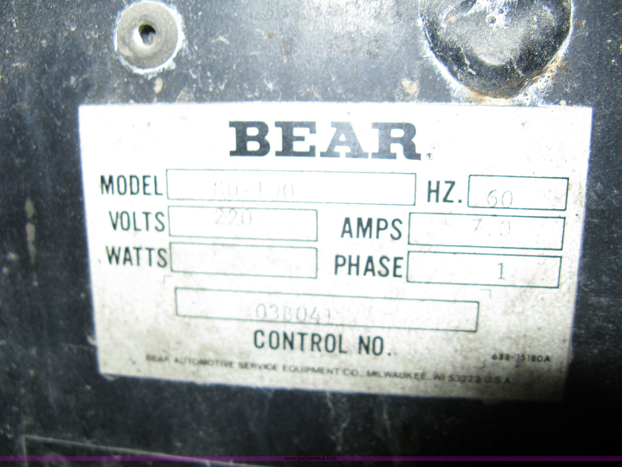 Purple Wave is selling a used Tools in Kansas. This item is a Bear Microprocessor wheel balancer with the following: Model 80-100, 220 volt, Seven amp, Single phase, Manual included