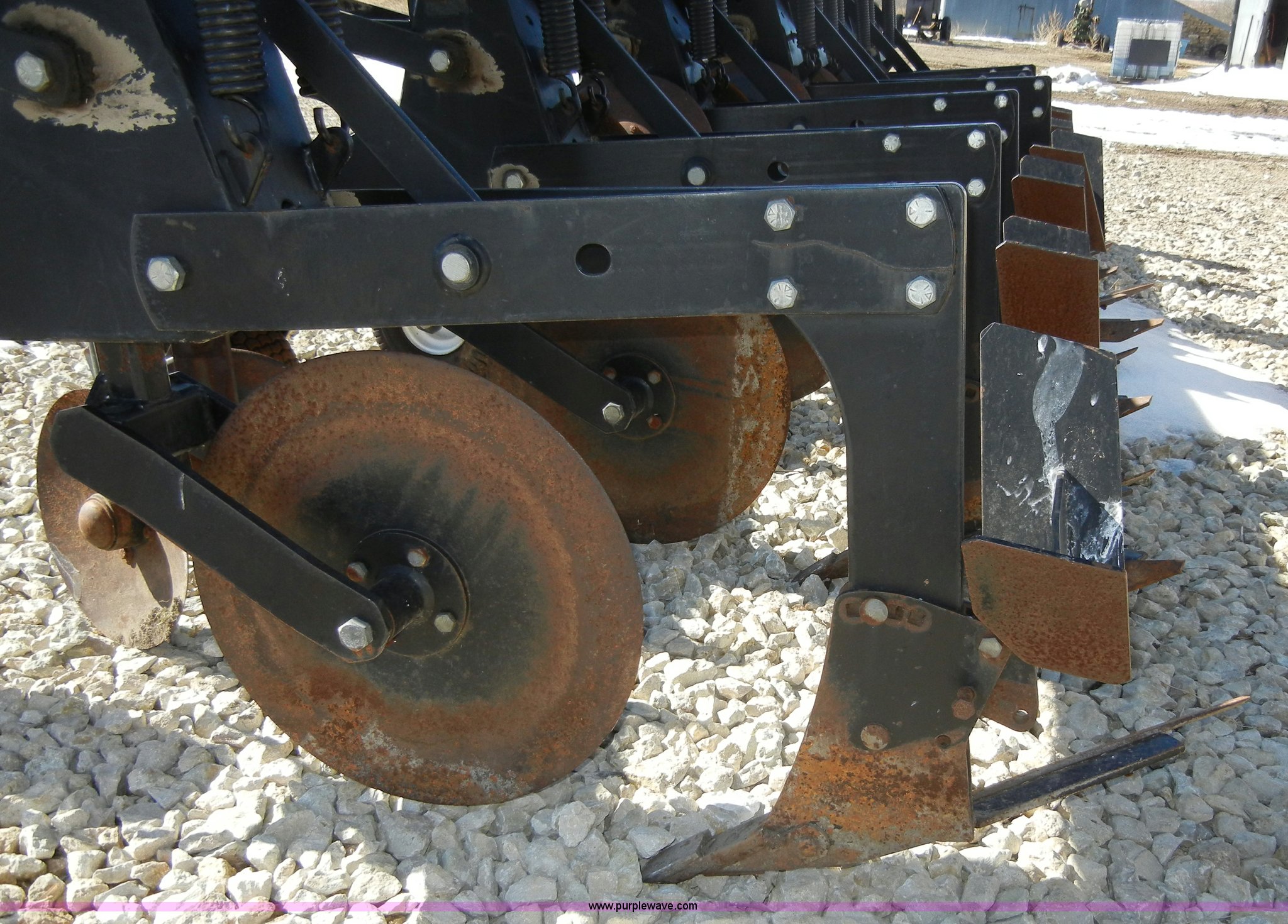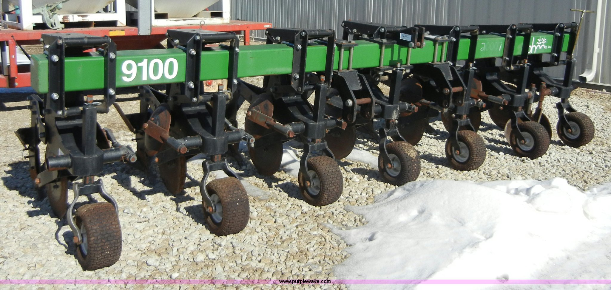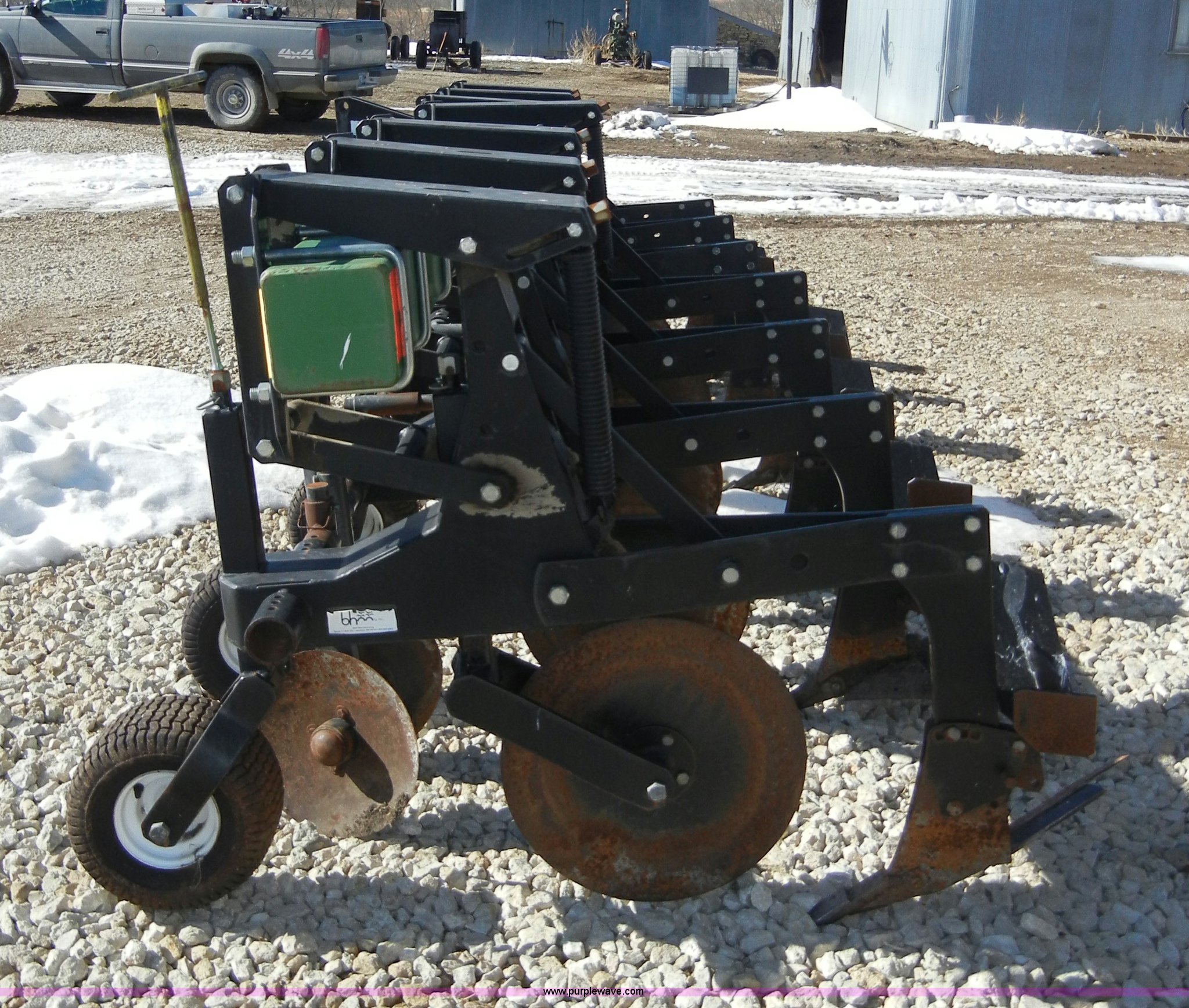 Purple Wave is selling a used Row Crop Cultivator in Kansas. This item is a B & H 9100 six row cultivator with the following: 30" row width, 20" rear disks, 14" front disks, Three point, 13x6.50-6 tires, No-till ridging wings