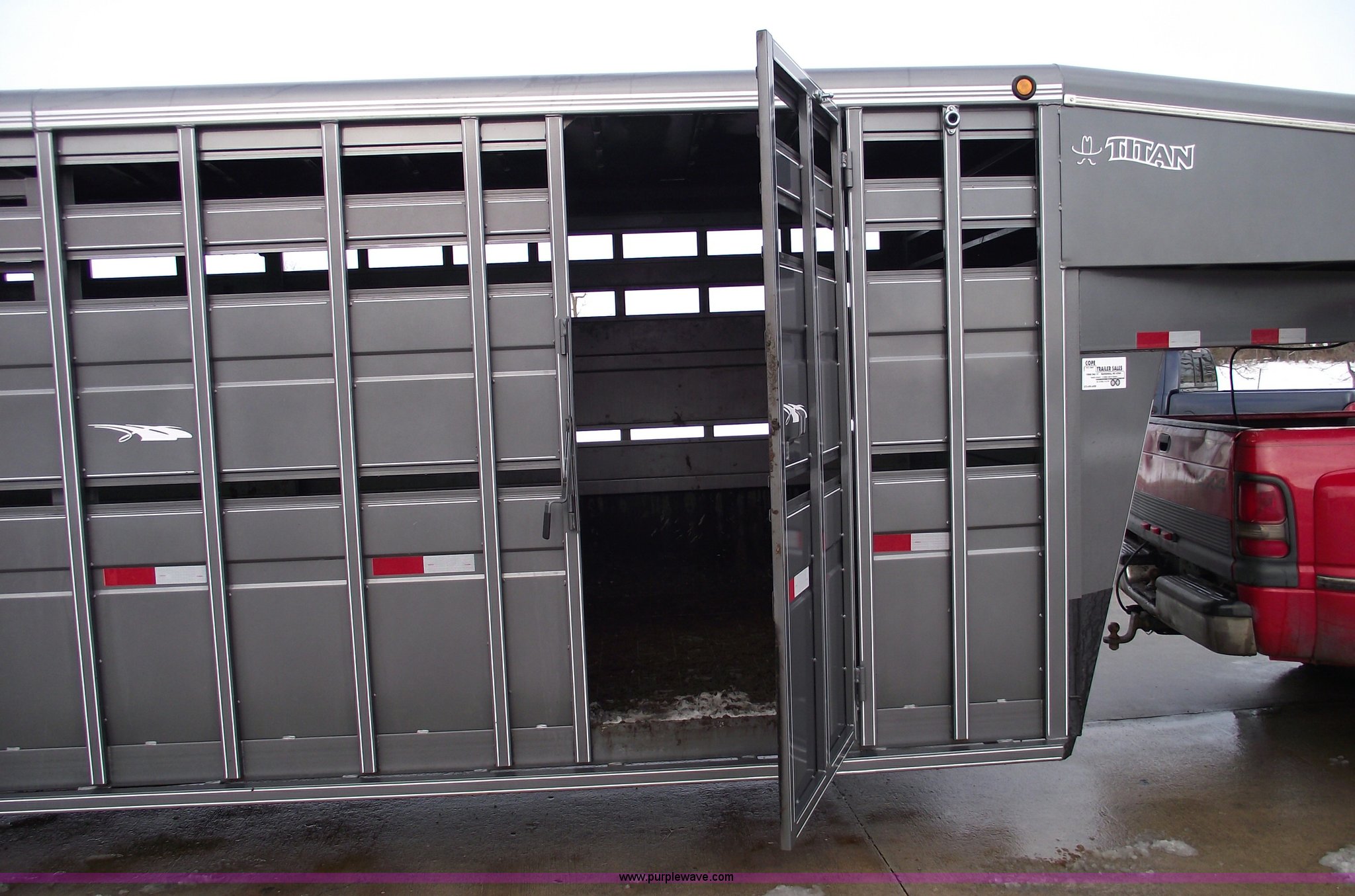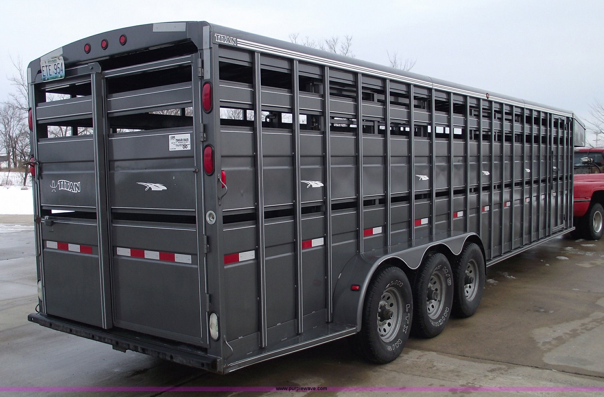 Purple Wave is selling a used Livestock Trailer in Missouri. This item is a 2007 Titan triple axle stock trailer with the following: 38' length, 30' box, 8' tongue, Three bay, Three swing, glide doors, Storage above goose neck, Interior lighting, Side escape door, Three oil bath axles, Electric brakes, Spring loaded jacks, Adjustable goose neck hitch, Emergency break-away system, Safety chains, Interior undercoated on lower half, 265-75-16 tires
