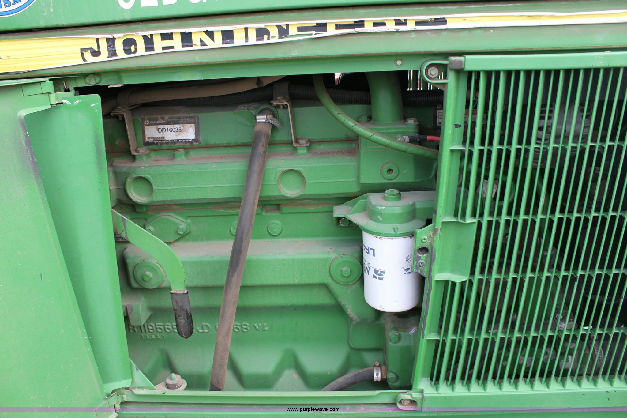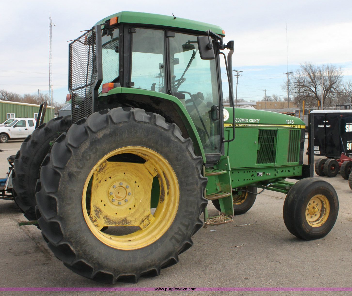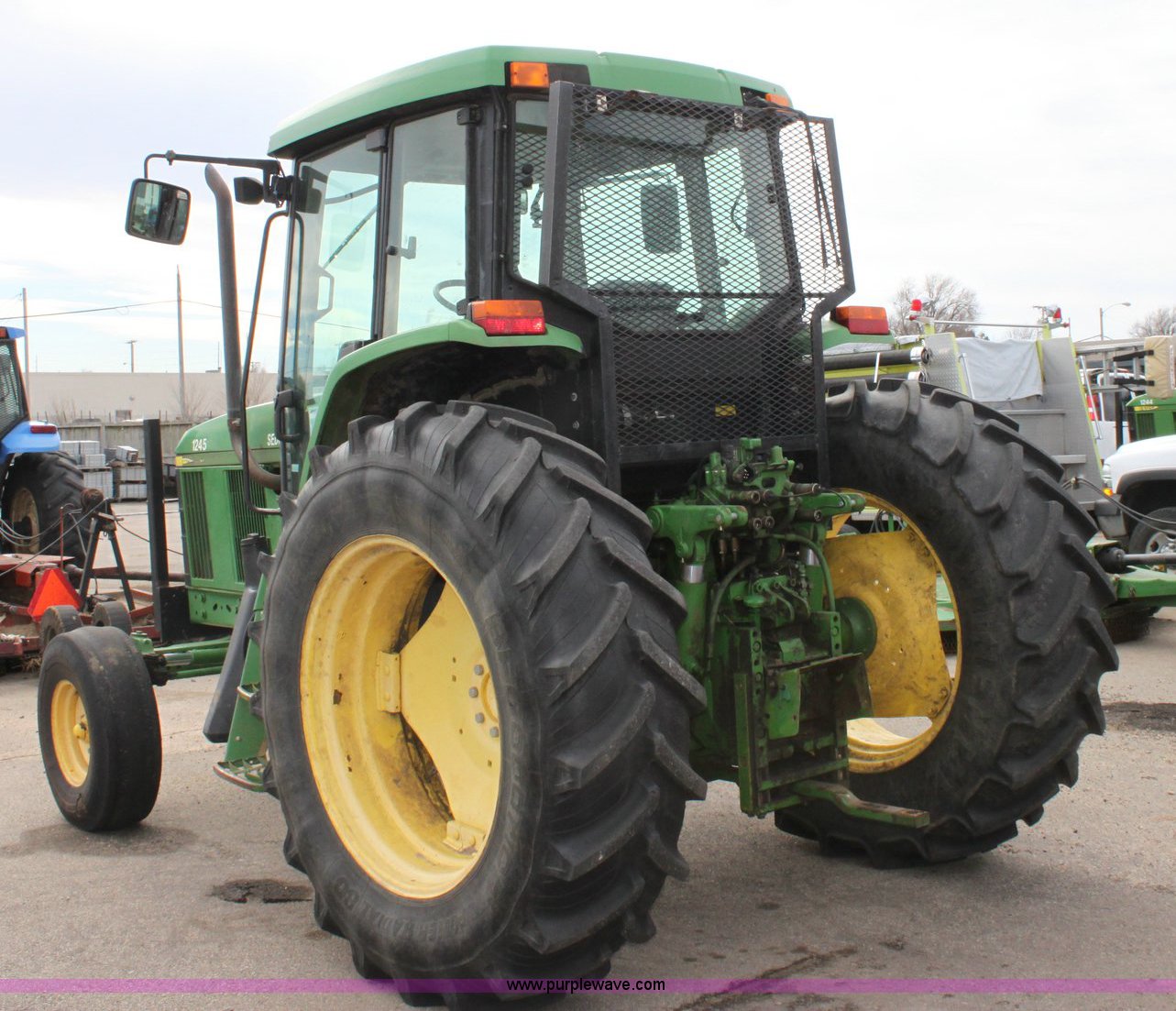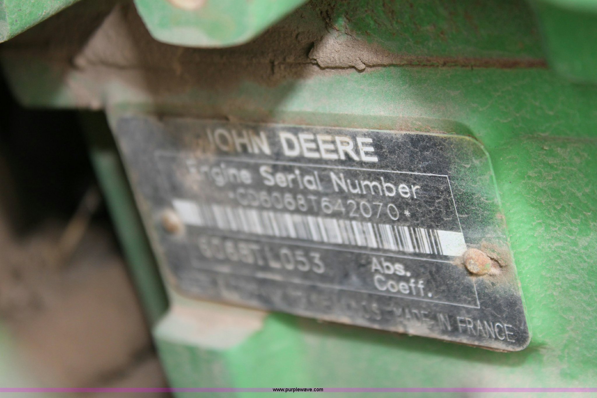 Purple Wave is selling a used Tractor in Kansas. This item is a John Deere 6605 tractor with the following: 1,065 hours on meter, Six cylinder diesel engine, CD6068T642070, Transmission, 12 forward and four reverse gears, AC and heat, AM/FM, Suspension seat, Windshield wiper, Front work lights, (3) sets of hydraulic remotes, PTO shaft is broken, 10.00-16 front tires, 18.4R38 rear tires, Serial L06605A310226, Equipment# 1245