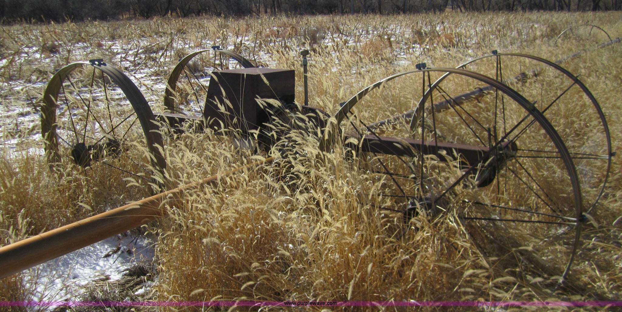 Purple Wave is selling a used Irrigation Equip. Attach. in Nebraska. This item is a 1/4 mile side roll irrigation system with the following: 5" aluminum pipe, 5' wheels, Wheels 30' apart, Sprinkler heads 30' apart, Hydraulic pump with Briggs & Stratton 7 HP engine, Engine locked up, Buyer responsible for disassembly and removal