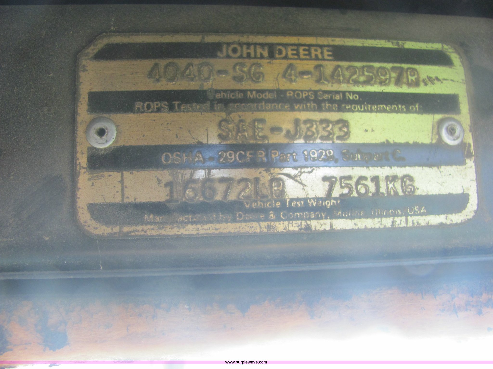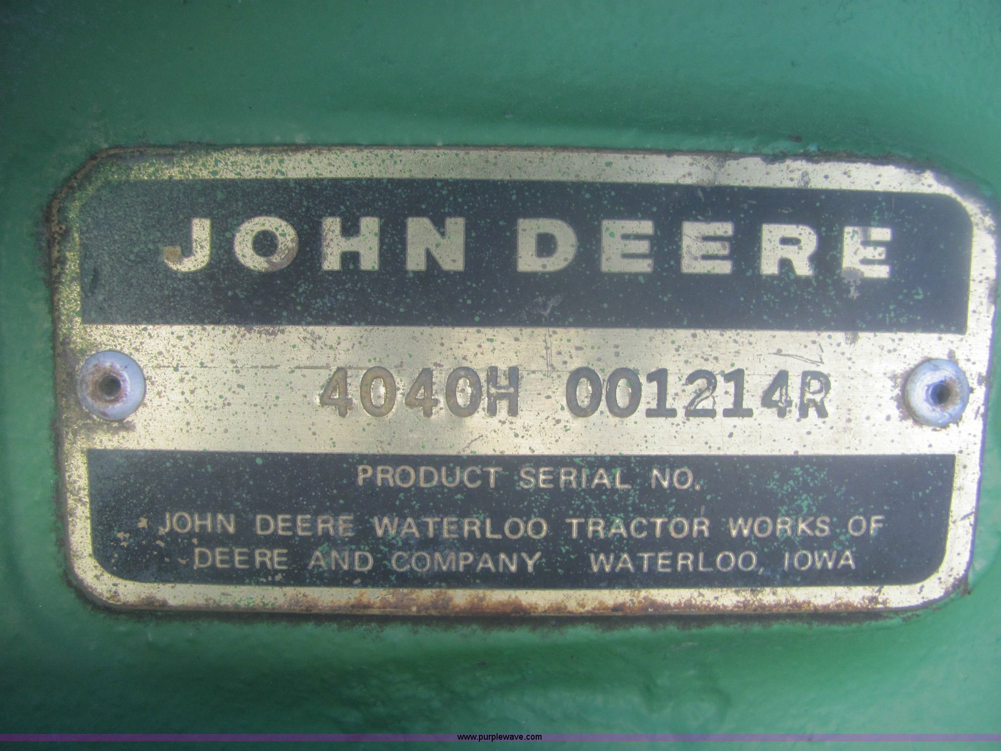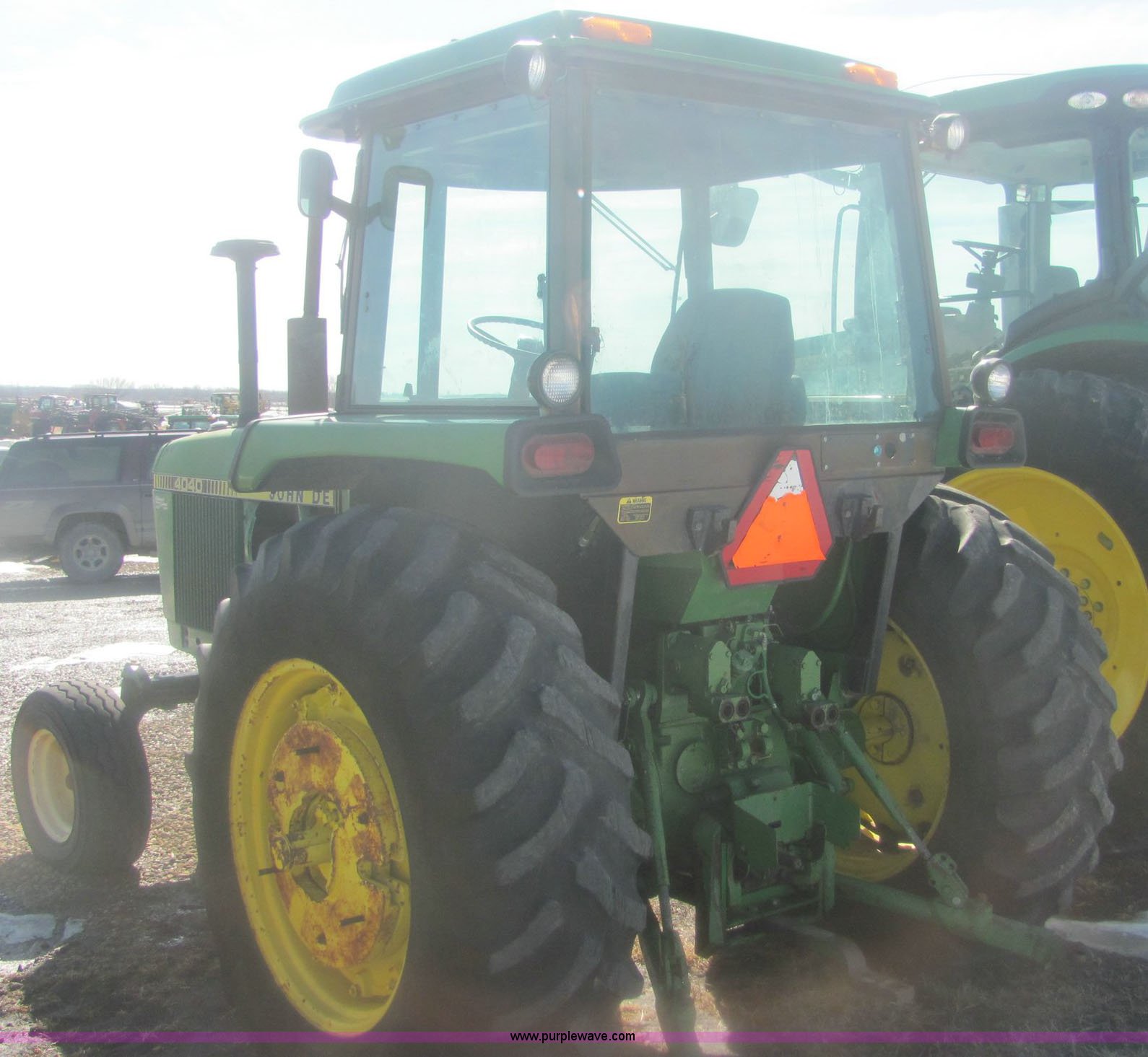 Purple Wave is selling a used Tractor in Kansas. This item is a 1978 John Deere 4040 tractor with the following: 7,752 hours on meter, John Deere six cylinder diesel engine, 90 HP, 540/1000 PTO, Three point, (2) hydraulic remotes, Cab serial 4040-SG 4-142597R, 18.4-34 rear tires, 11L-16 front tires, Serial 4040H 001214R