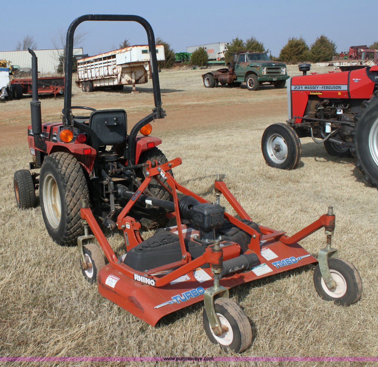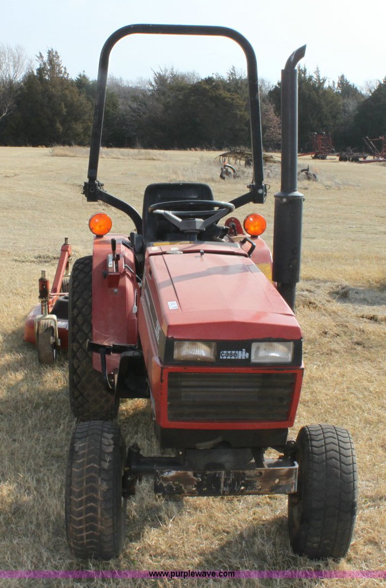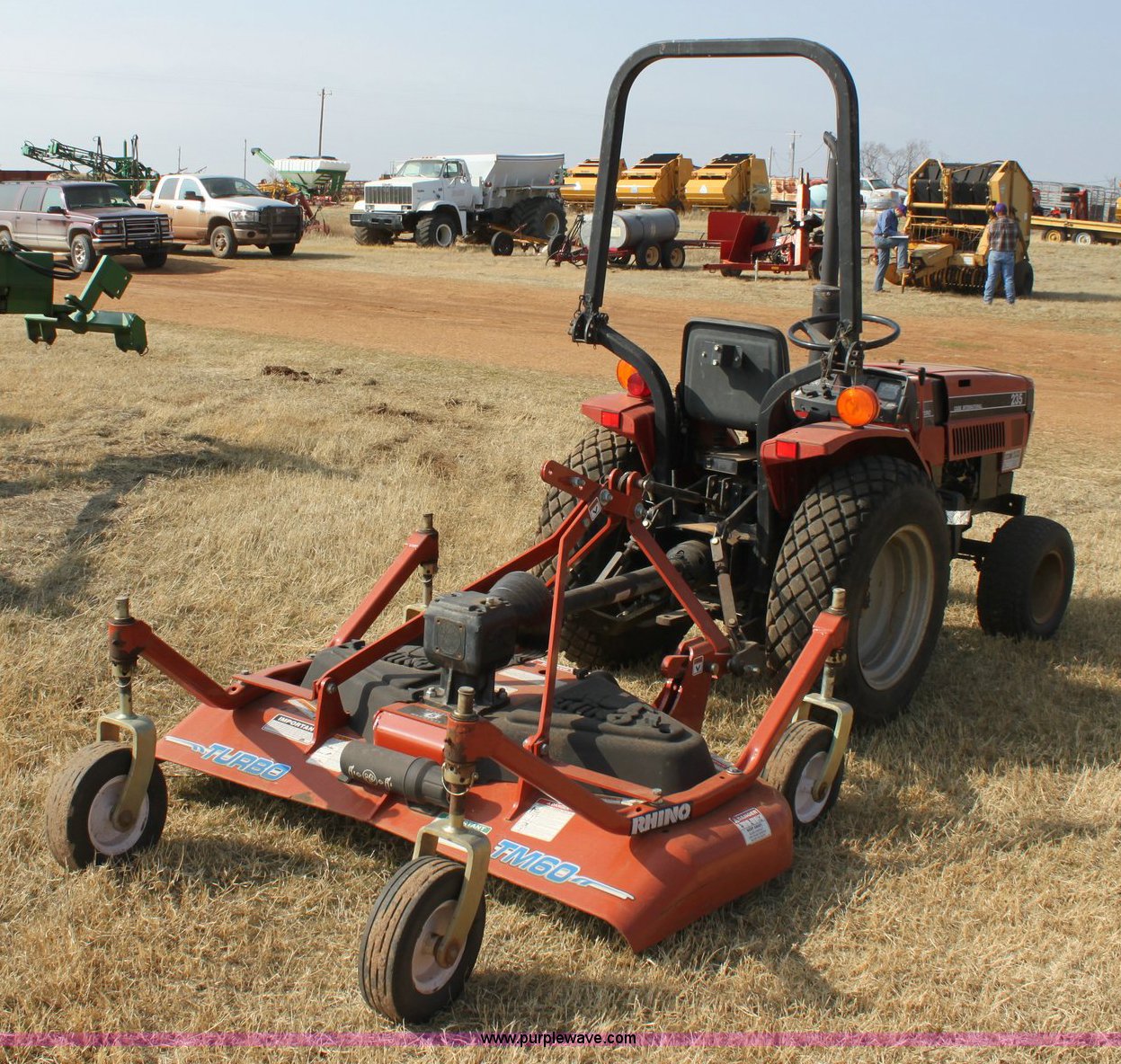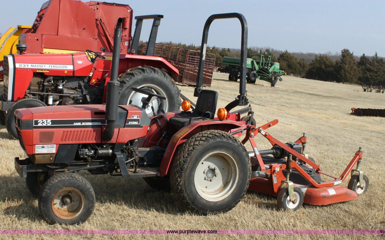 Purple Wave is selling a used Tractor in Oklahoma. This item is a Case IH 235 tractor with the following: 573 hours on meter, Mitsubishi three cylinder diesel engine, 18 HP, Four speed transmission with Hi/Lo, 540 PTO, Three point, 9.5-18 rear turf tires, 20x8.00-10 front turf tires, 2010 Rhino turbo finish mower, Model TM60, New, Five year gearbox warranty