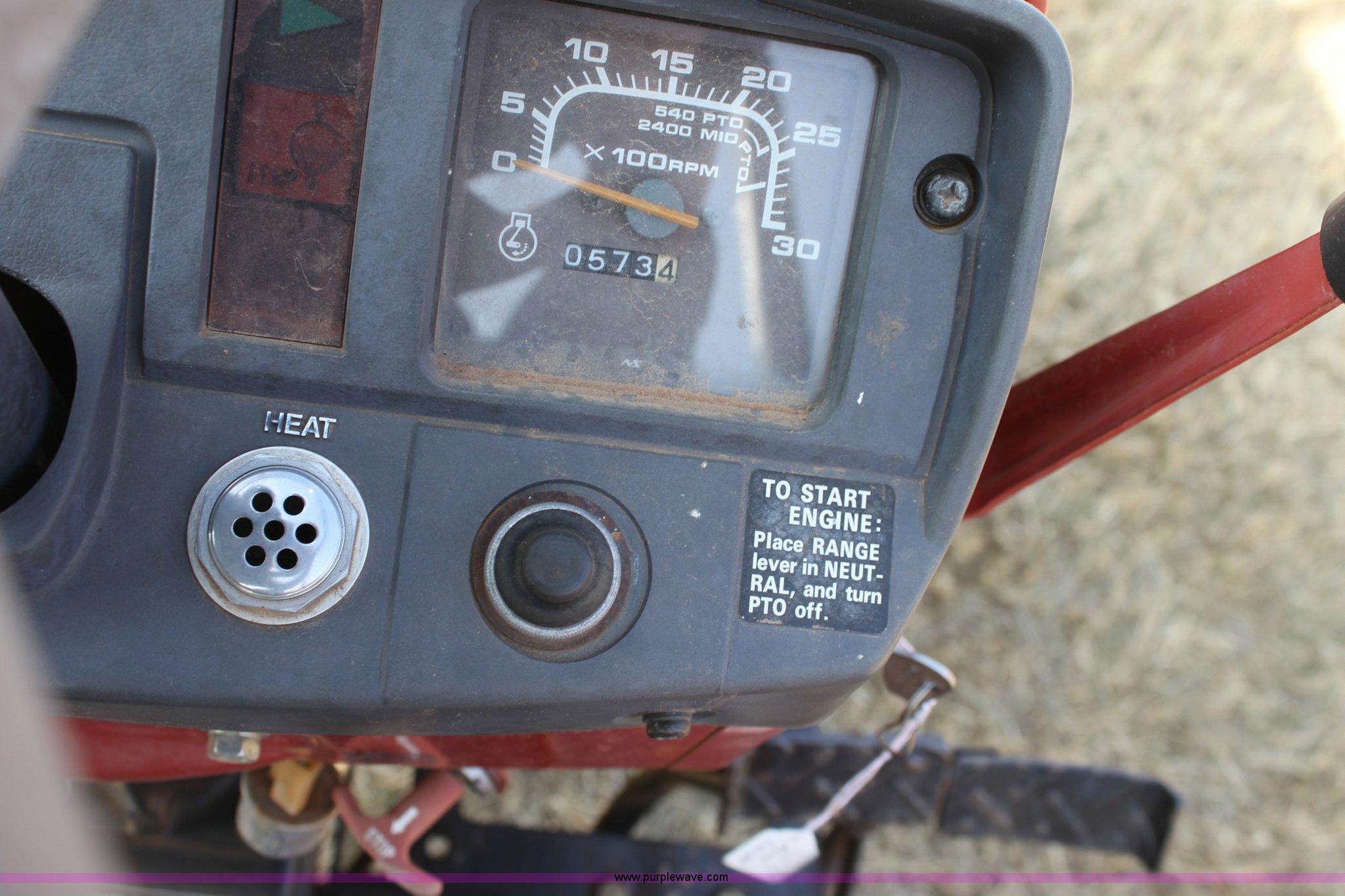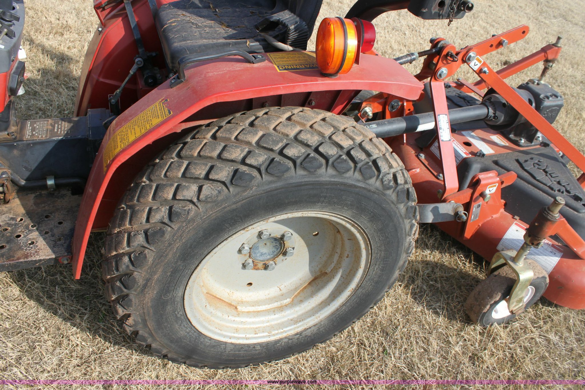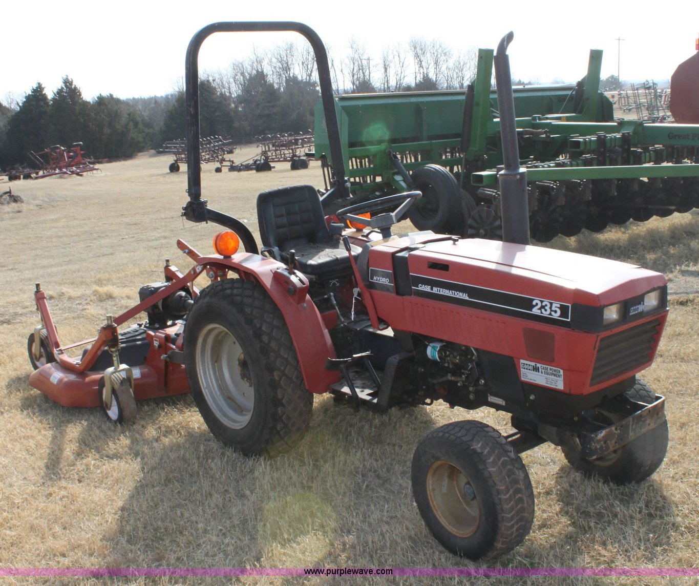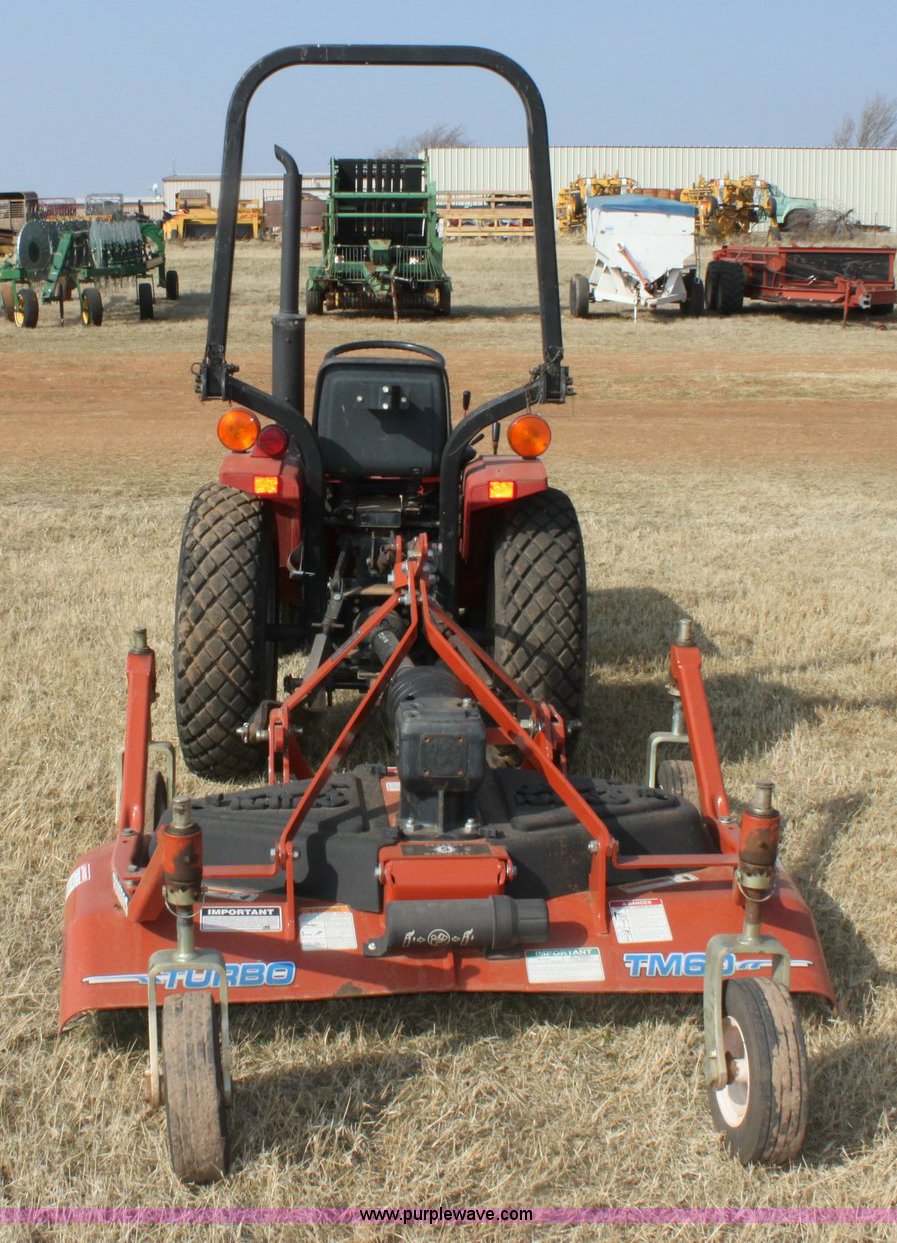 Purple Wave is selling a used Tractor in Oklahoma. This item is a Case IH 235 tractor with the following: 573 hours on meter, Mitsubishi three cylinder diesel engine, 18 HP, Four speed transmission with Hi/Lo, 540 PTO, Three point, 9.5-18 rear turf tires, 20x8.00-10 front turf tires, 2010 Rhino turbo finish mower, Model TM60, New, Five year gearbox warranty