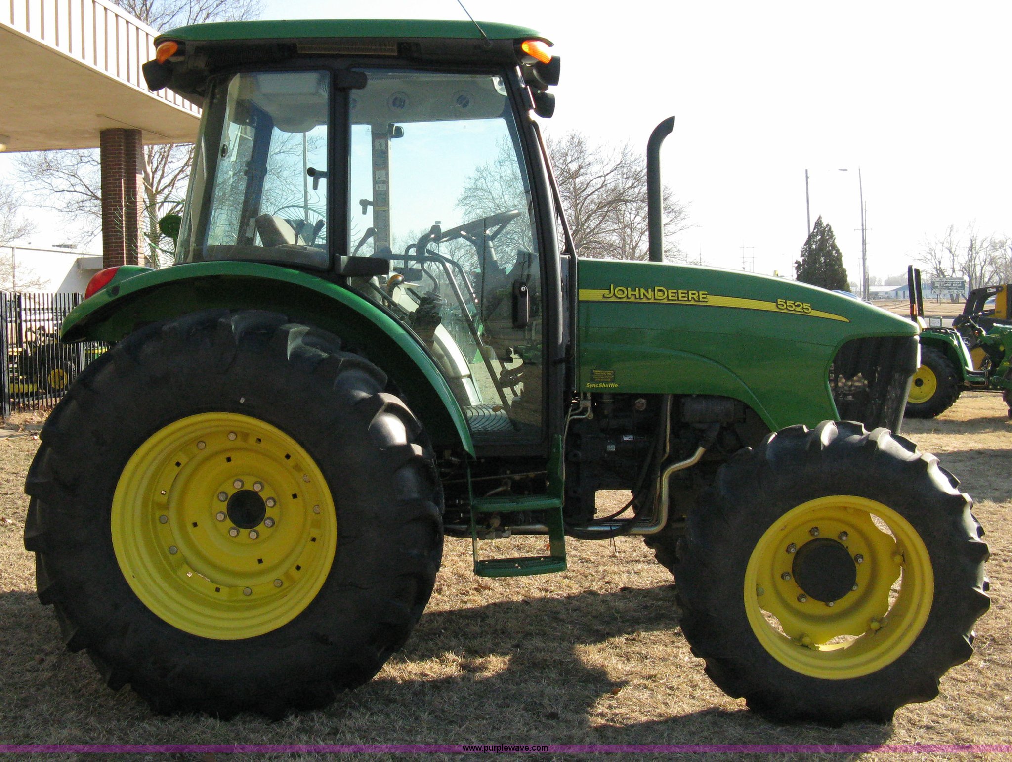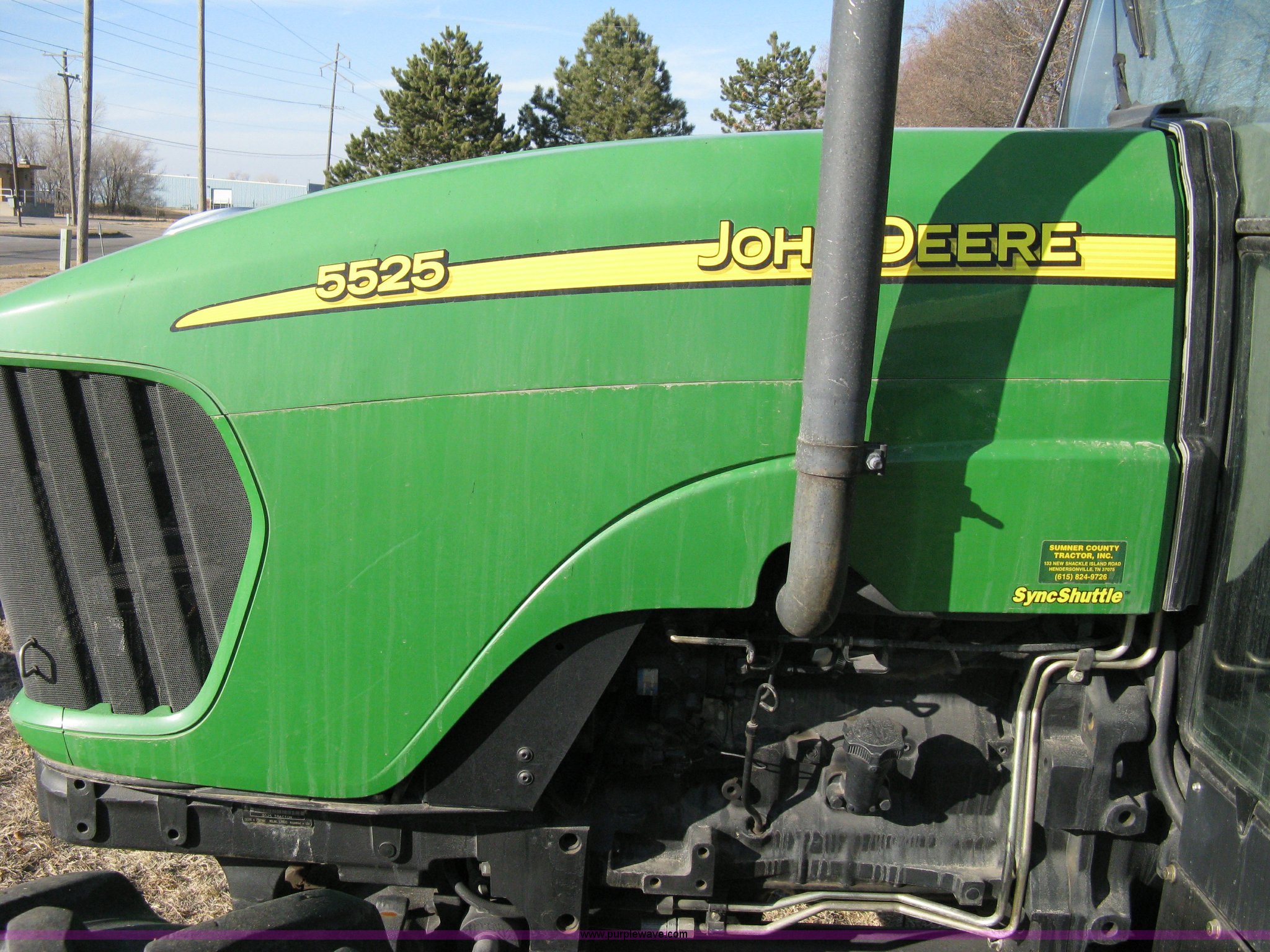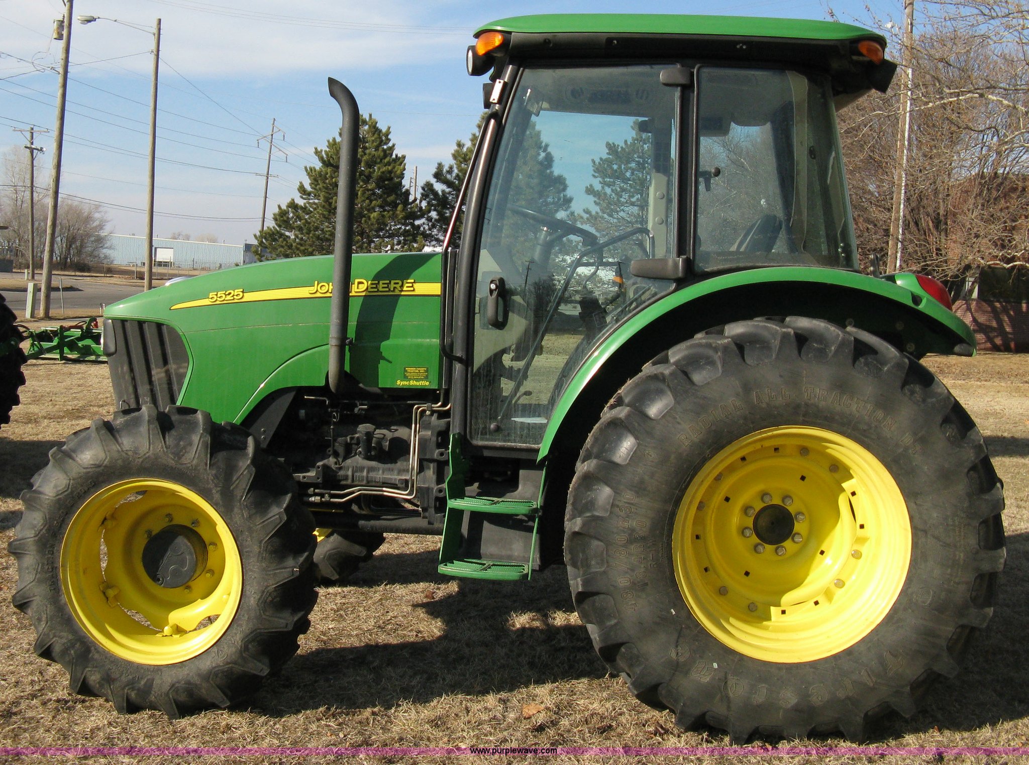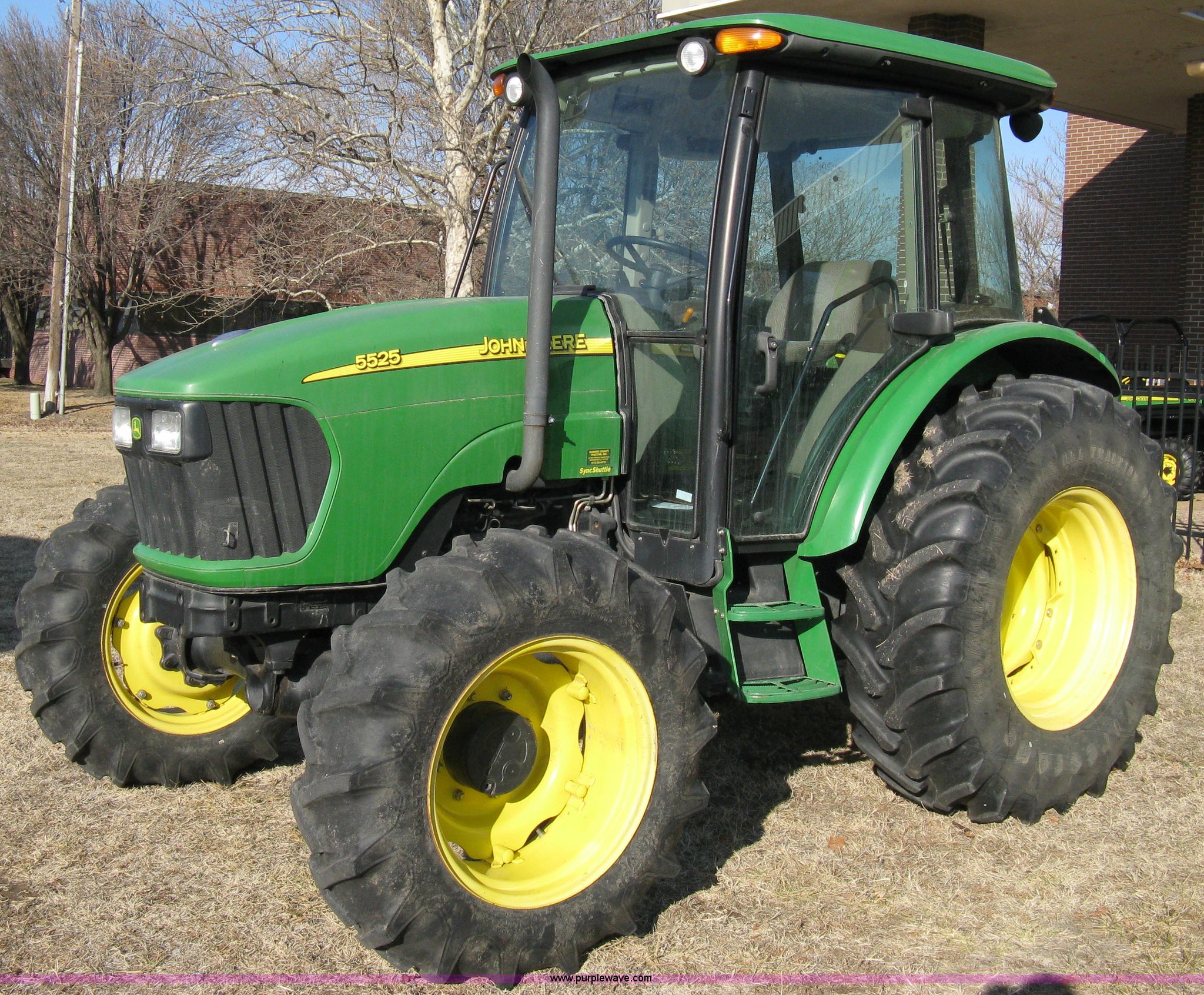Purple Wave is selling a used Tractor in Kansas. This item is a 2005 John Deere 5525 MFWA tractor with the following: 795.5 hours on meter, Four cylinder 91 HP diesel engine, Sync Shuttle transmission, Front wheel assist, Enclosed cab with AC and heat, AM/FM/CD, Tilt steering wheel, Air ride seat, Tip out windows, Work lights, Turn signals, (2) hydraulic remotes, Auxiliary hydraulics under cab for loader, Three point, 540 PTO, 1000 PTO shaft insert, in cab, 12.4-24 front tires, 480/80R30 (18.4R30) rear tires, Serial LV5525S150213