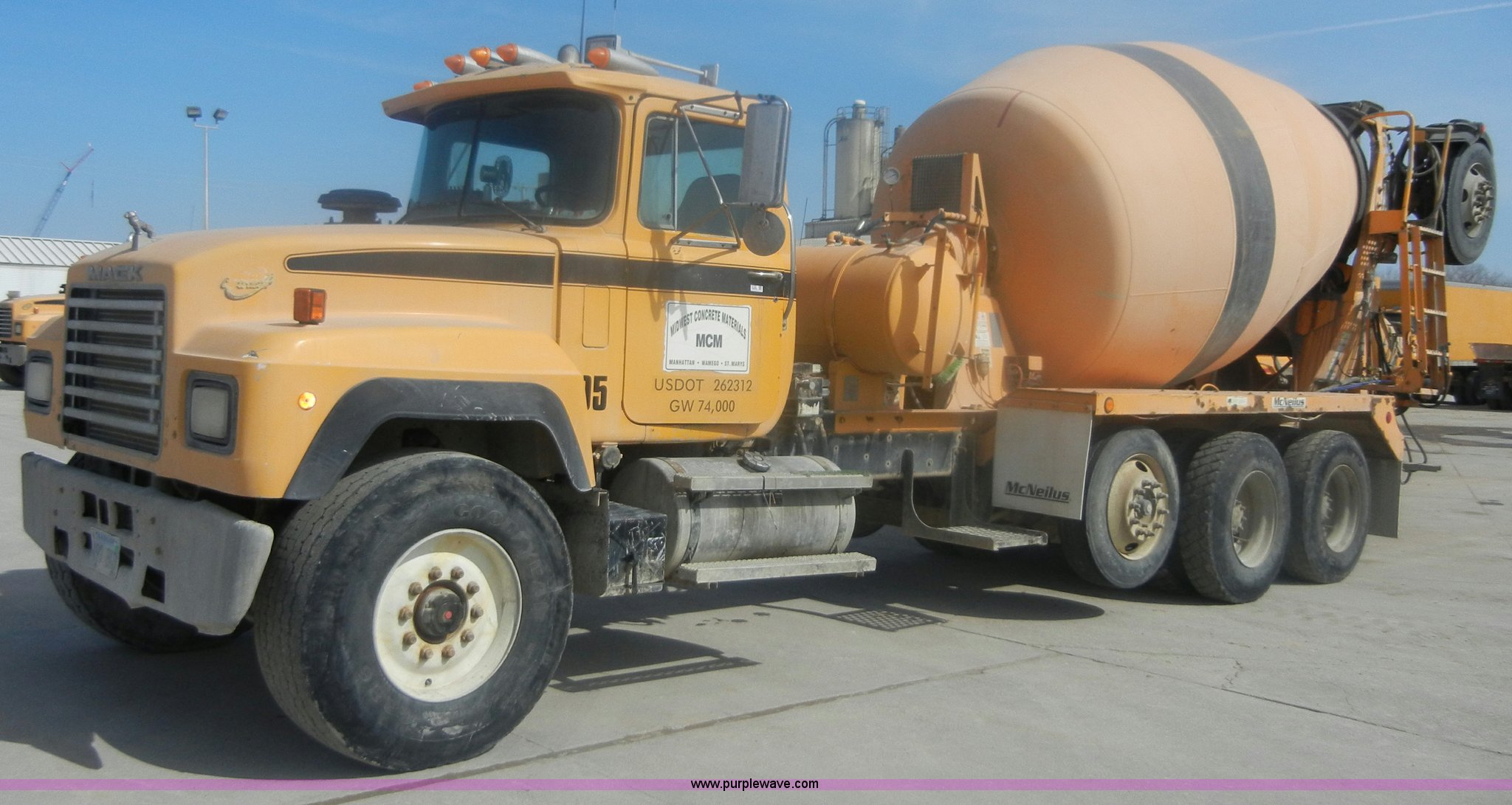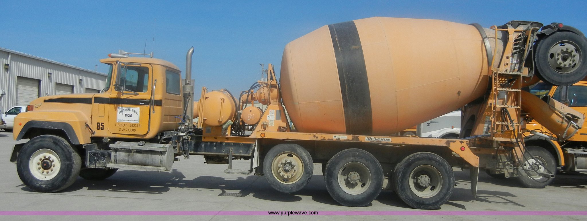 Purple Wave is selling a used Ready Mix or Pump Truck in Kansas. This item is a 1995 Mack RD690S cement mixer truck with the following: 147,746 miles on odometer, 19,140 hours on meter, Mack E7 L6, 12.0L (728 CID) diesel engine, Manual transmission, AC and heat, Tilt, AM/FM, Air suspension seat, Air ride cab, Manual windows and locks, Air brakes, PTO, 2002 McNeilus 11 cu.yd. mixer, 150 gallon water tank, (3) 4' chute extensions, Single 56 gallon fuel tank, Steerable pusher axle, GVWR 74,000 lbs, 11R22.5 rear tires, 425/65R22.5 front tires, Maintenance records available, View oil sample records, GPS and backup camera system not included, Oil sample records available upon request, Unit # 95