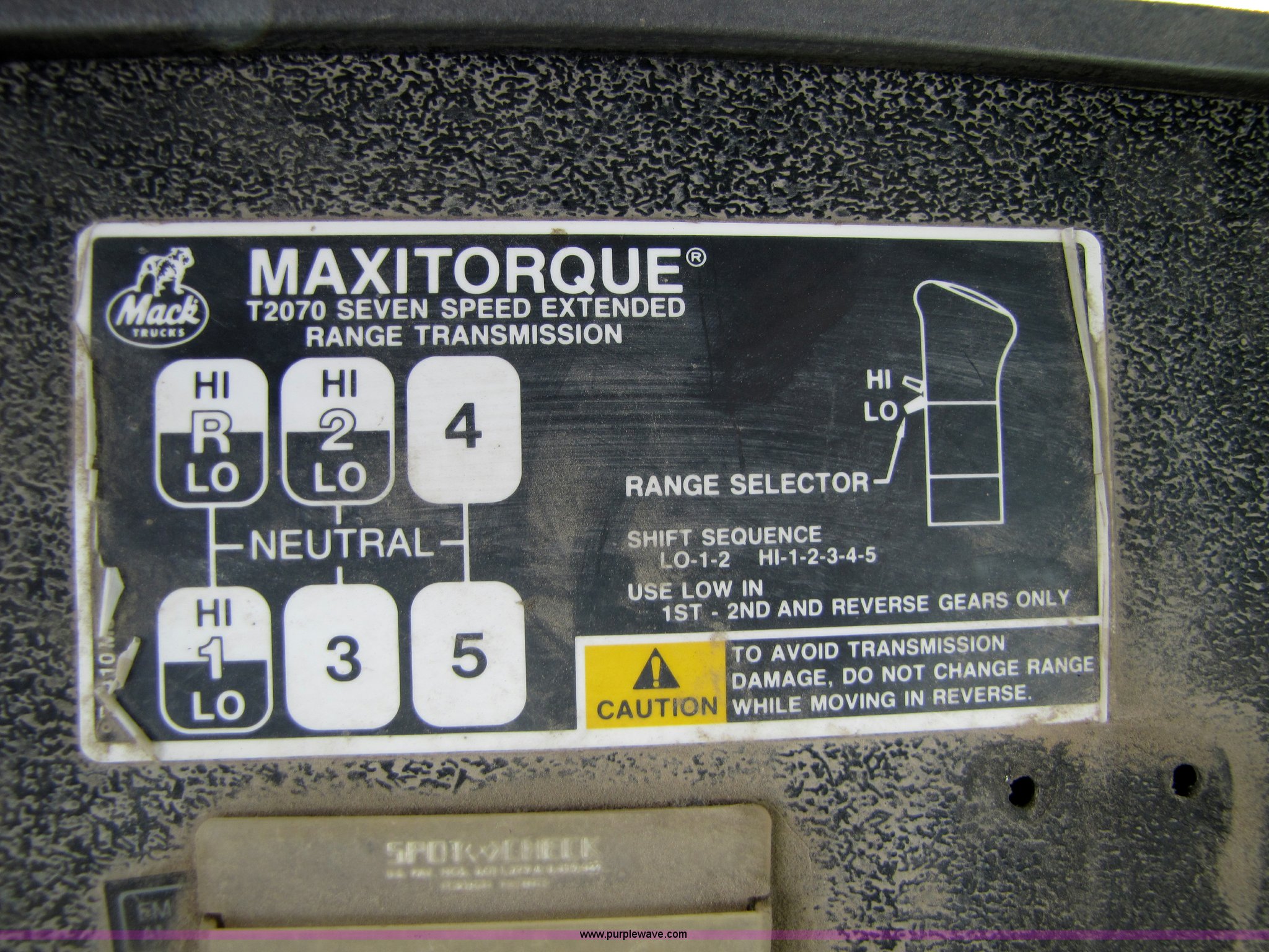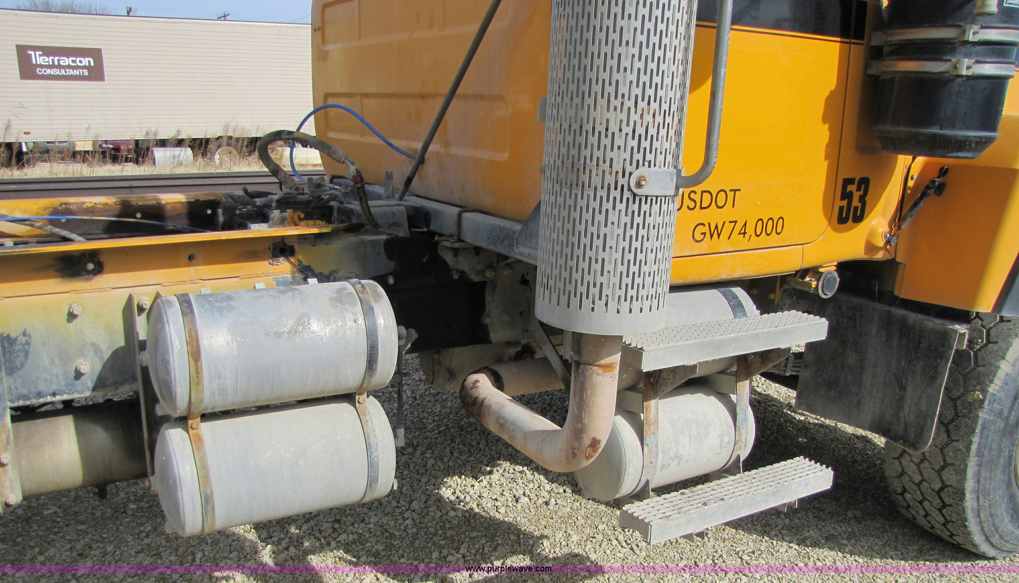 Purple Wave is selling a used Truck Tractor in Kansas. This item is a 1995 Mack RD690S cab and chassis with the following: 116,297 miles on odometer, 22,677 hours on meter, Mack EM7-300 12.0L (728 CID) diesel engine, Maxitorque T2070 seven speed extended range manual transmission, Twin screw, AC and heat, Manual windows and locks, AM/FM/CD, Heated mirrors, Spring suspension seat, Block heater, Single stack, 56 gallon fuel tank, Air brakes, Throttle stop, Power divider lock, Steerable pusher axle, 425/65R22.5 front tires, 11R22.5 rear tires, Walking beam suspension, GW 74,000, Maintenance records available, View oil sample records, Unit# 53