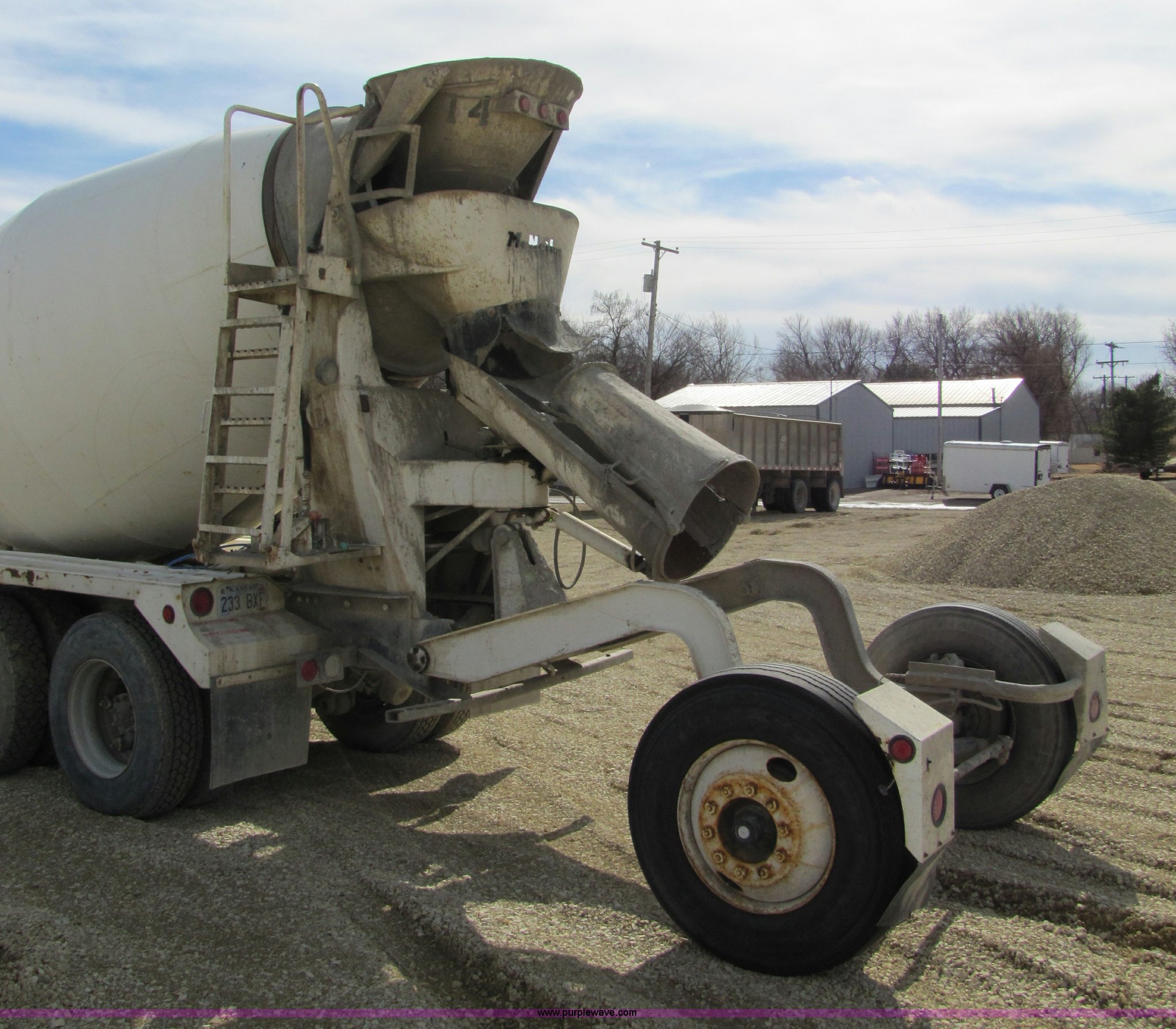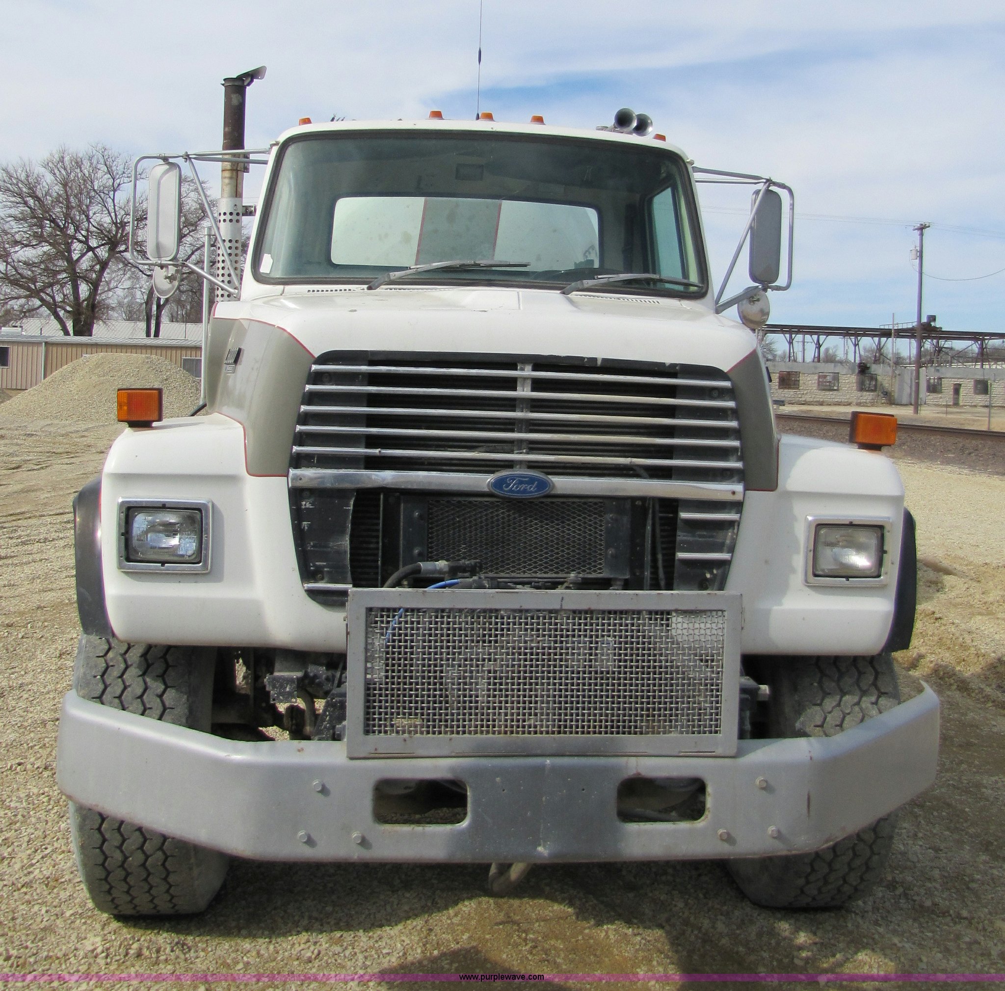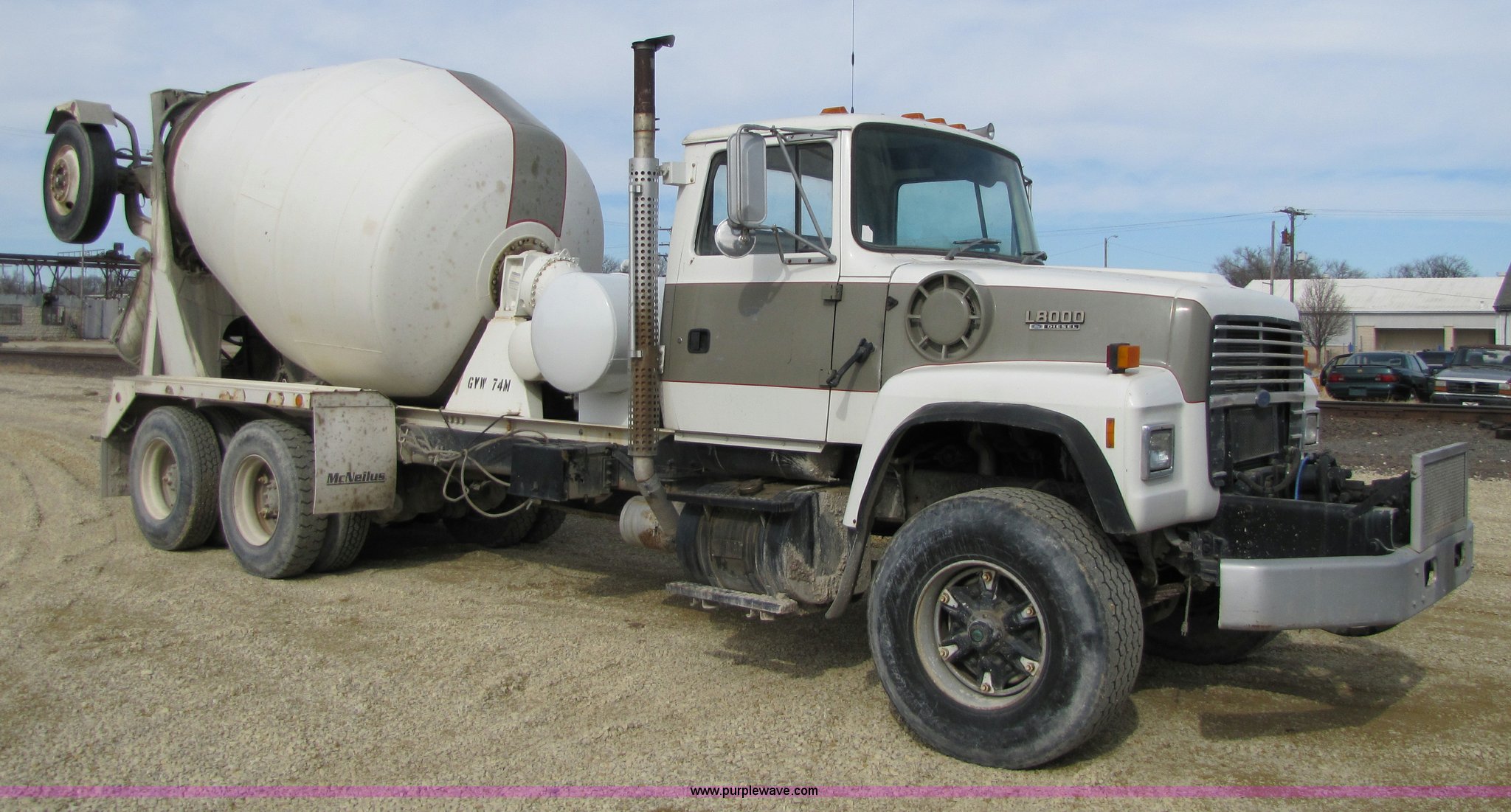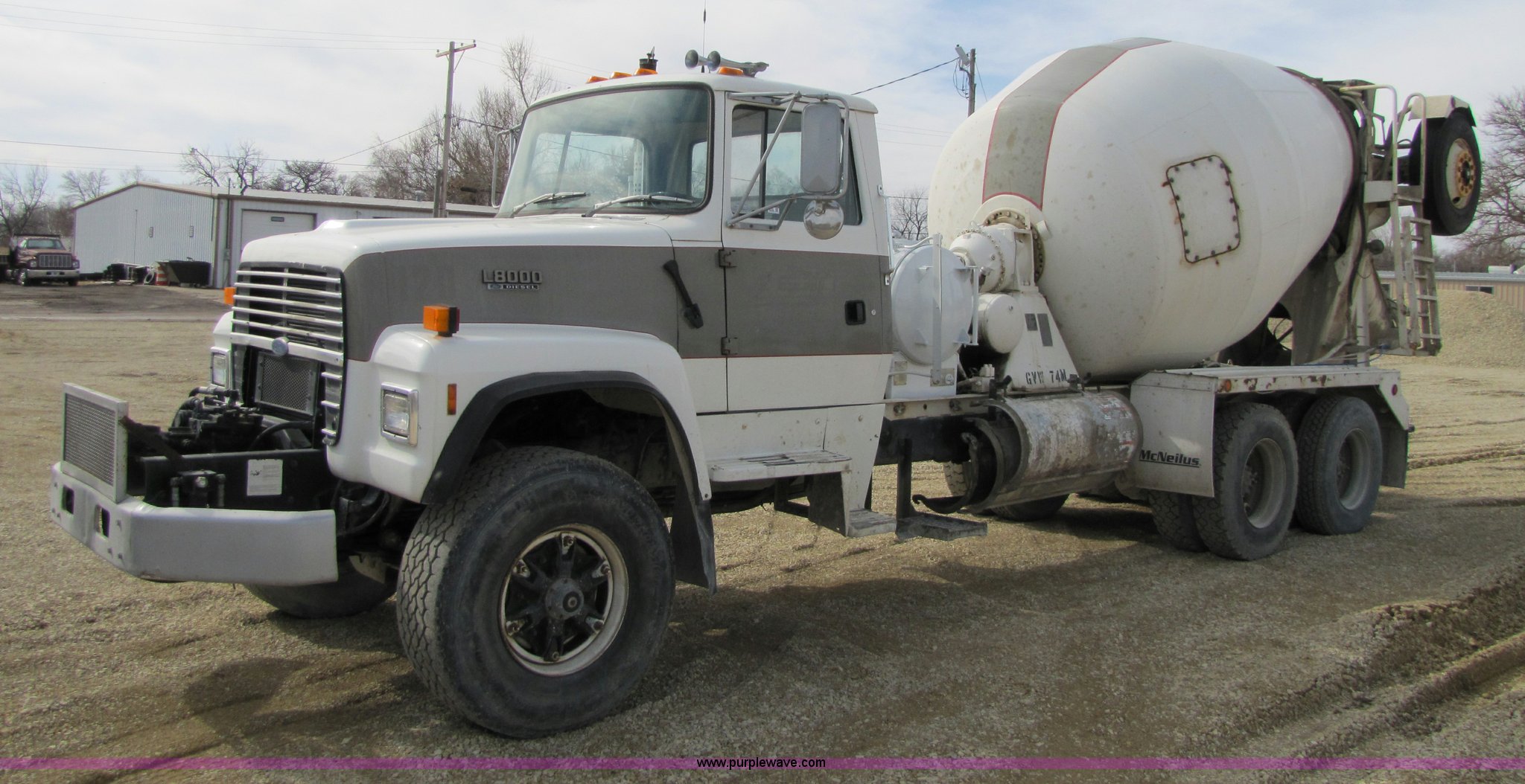Purple Wave is selling a used Ready Mix or Pump Truck in Kansas. This item is a 1993 Ford LT8000 cement mixer truck with the following: 131,534 miles on odometer, 2,195 hours on meter, Cummins 8.3L L6 diesel engine, Road Ranger eight speed manual transmission, RTO-11708LL-14708LL, Twin screw, Differential lock, Manual windows and locks, Single stack, Air brakes, McNeilus 9.5 cu. yd. mixer, Serial 31106-03958, (3) 4' chute extensions, 125 gallon water tank, Bridge Master trailer axle, 425/65R22.5 front tires, 11R22.5 rear tires, Walking beam suspension, GVW 74M, Maintenance records available, View oil sample records, Unit# MT120