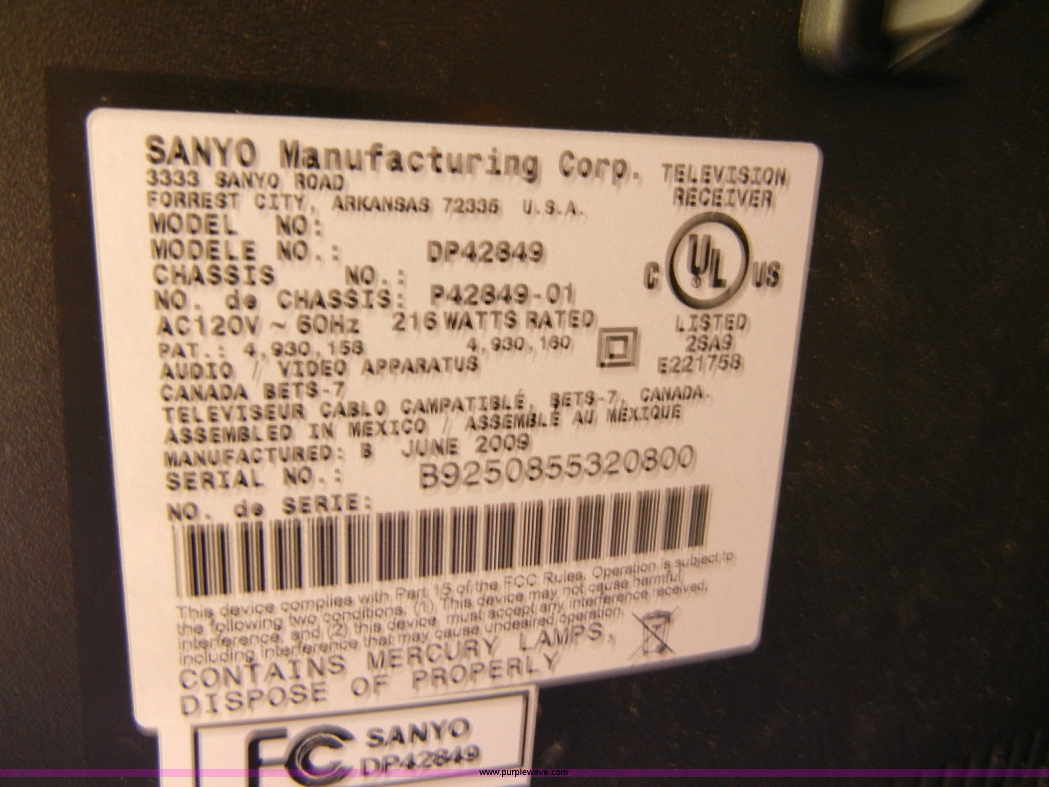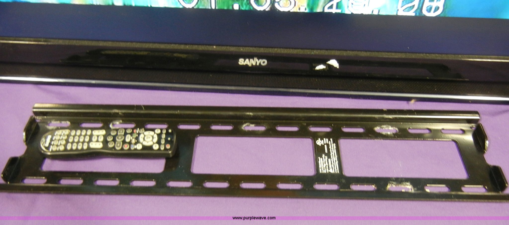 Purple Wave is selling a used Electronics in Kansas. This item is a Sanyo DP42849 42" flat screen TV with the following: Remote, Wall mount bracket, Powers on, Serial B9250855320800