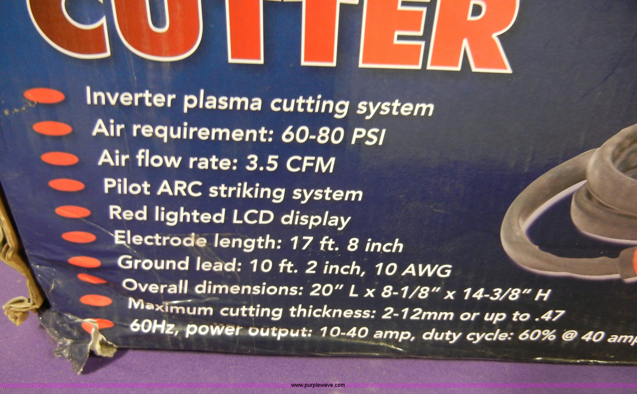 Purple Wave is selling a used Welder (Manual) in Kansas. This item is a Chicago electric inverter digital plasma cutter with the following: 40 amp, 230 volt, Item 95136