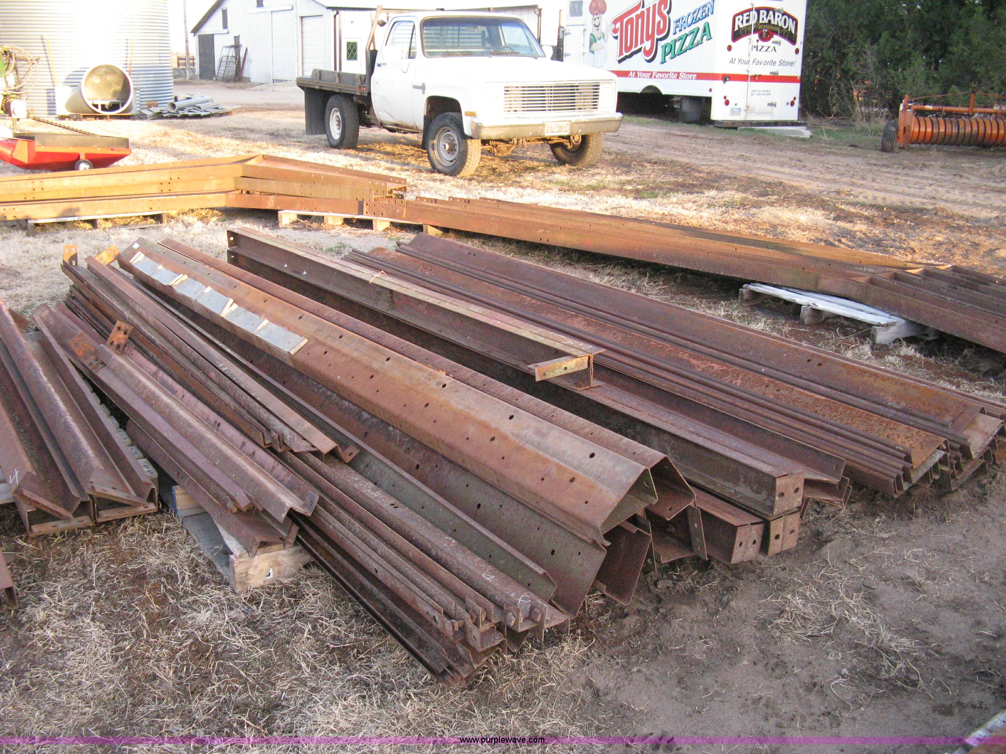Steel free span building framing. 32'W x 36'L, (4) main trusses 12' centers, 10' sidewall, (30) purlins 12'L, (8) starter/header rails 12'L, (3) 12' end wall studs, 9'4" end wall stud, (8) 12' sidewall purlins, (9) assorted length purlins, (4) corner braces, (5) 12' floor strap, Assorted iron/rail pieces. Shipping quotes available. 14715 W 61st St. N. Colwich, KS 67030