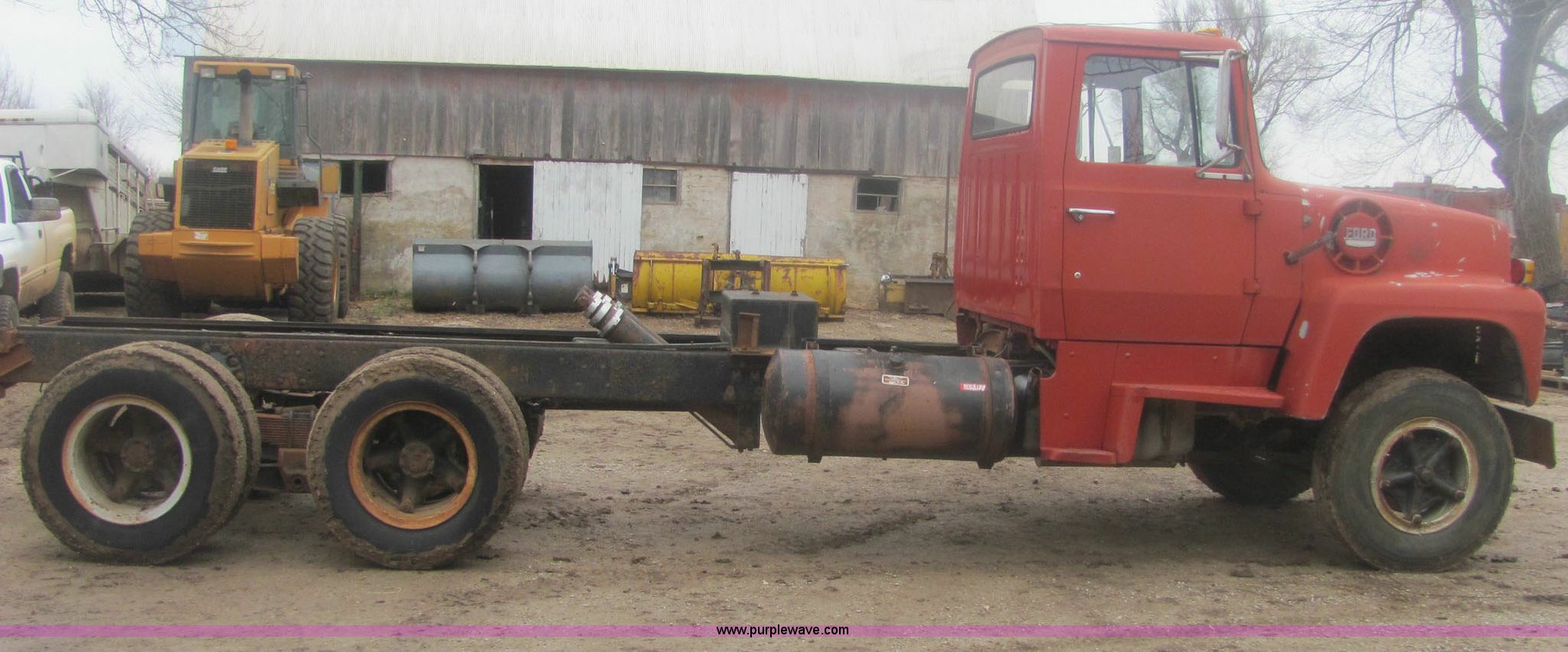 Purple Wave is selling a used Truck Chassis in Kansas. This item is a 1973 Ford LT800 cab and chassis with the following: 49,256 miles on odometer, 391 V8 gas engine, Allison MT650 automatic transmission, Twin screw, Heckinson walking beam suspension, 60 gallon fuel tank, Johnson three stage dual hoist, GVW 39,000 lbs, 9.00-R20 tires, Previously had 20' bed