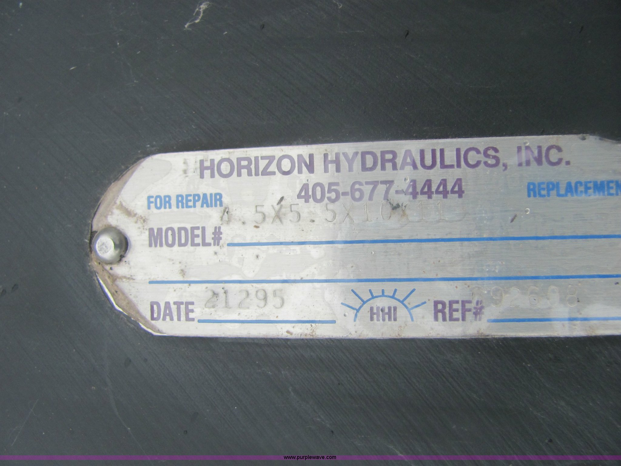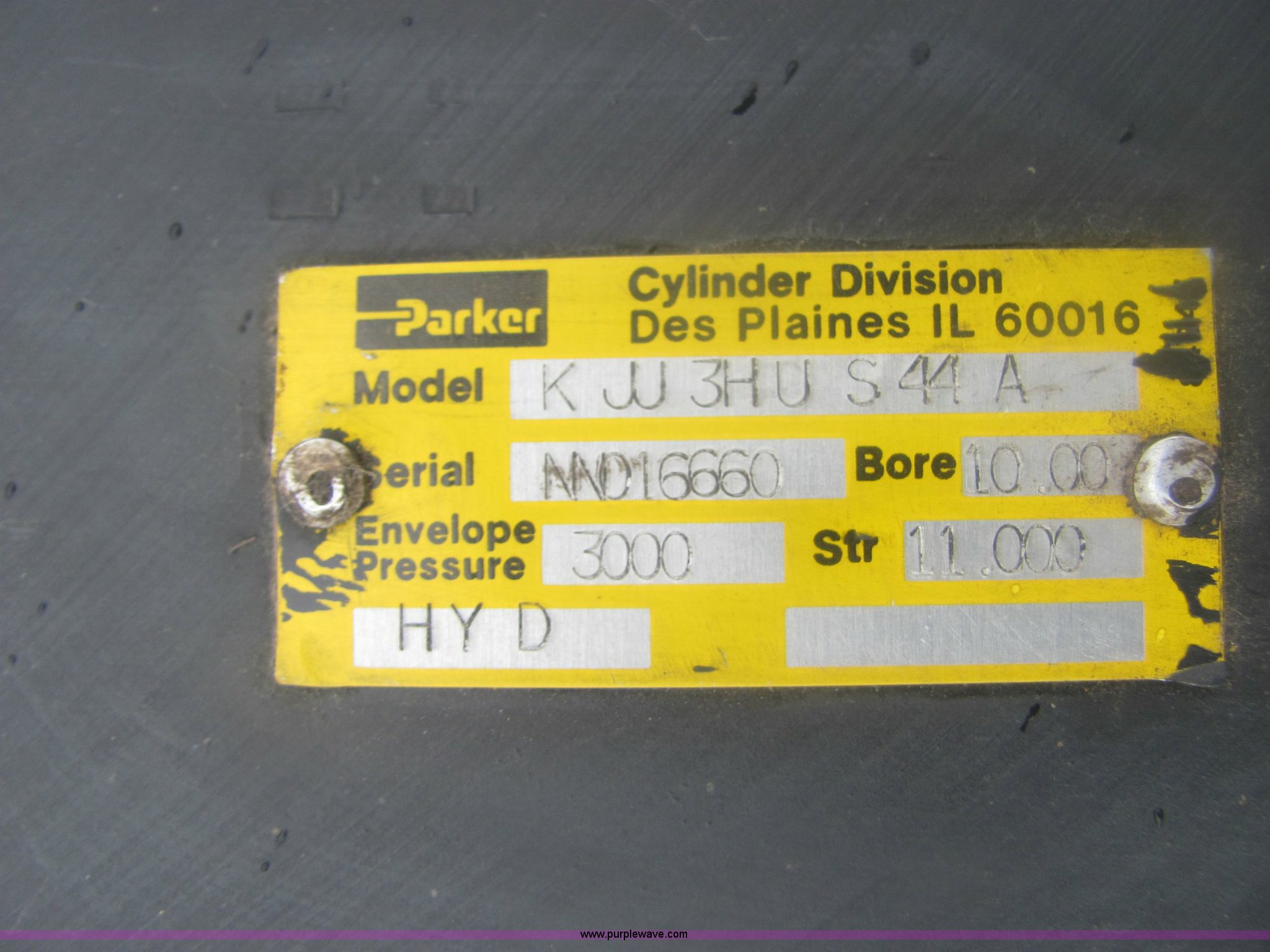 Purple Wave is selling a used Tools in Kansas. This item is a Parker double acting cylinder with the following: New, Model KJJ-3HUS44A, Serial NN-16660, Bore 10.00, Stroke 11.00, 4 1/8" and 3 3/8" ram diameter