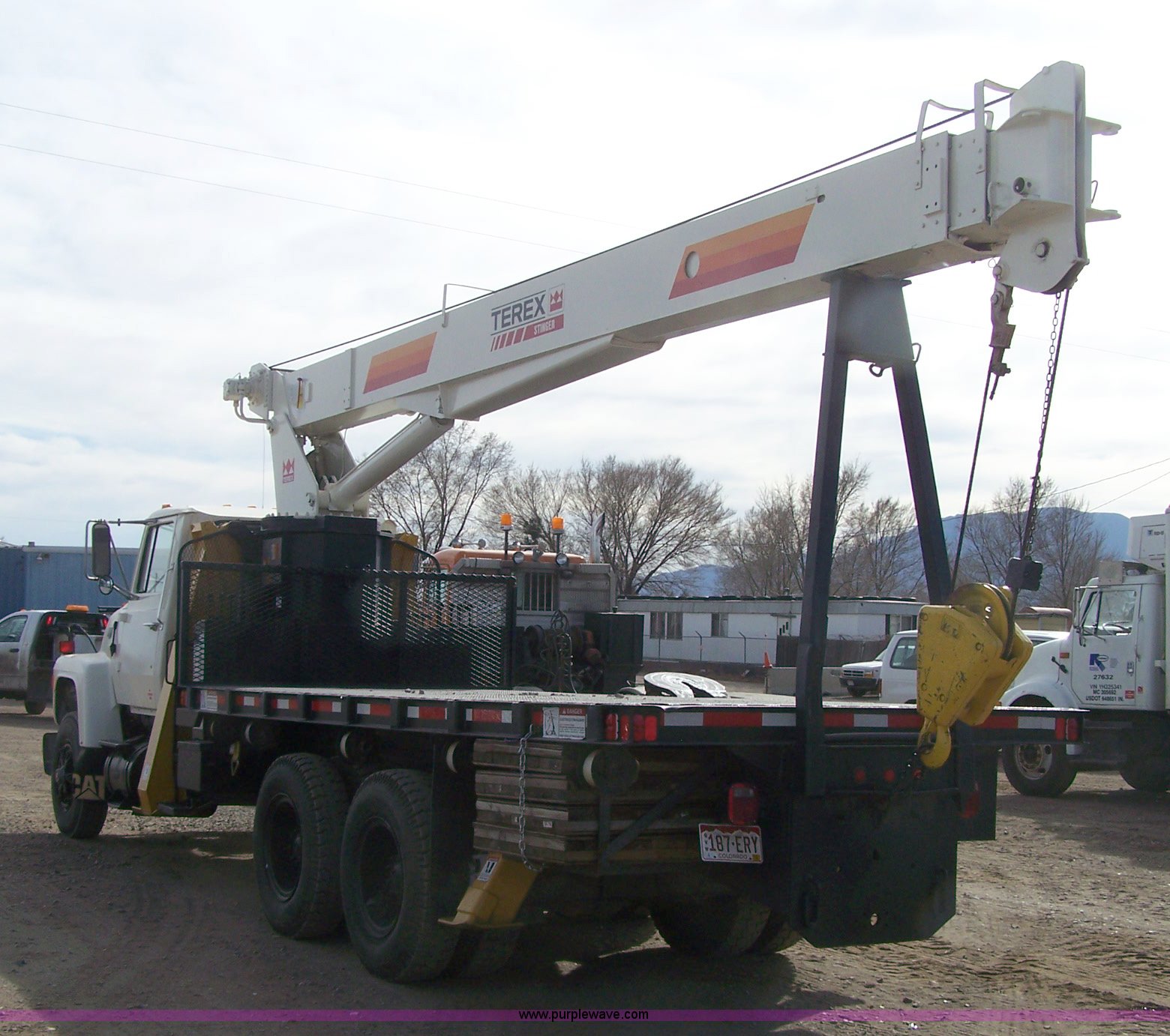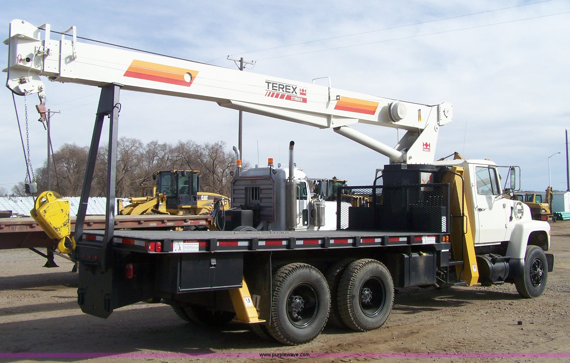 Purple Wave is selling a used Crane Truck in Colorado. This item is a 1984 Ford LT8000 semi truck with Terex RO boom with the following: 83,849 miles on odometer, Caterpillar 3208 10.4L V8 diesel engine, Road Ranger 10 speed manual transmission, Heater, Spring ride seat, AM radio, Chrome bumper, Dual fuel tanks, Single exhaust stack, Terex RO boom lift, Model TJ 28-63, 63' reach, Serial 459-0589-093, 9/16" cable, Headache ball included, 18' flatbed, PTO, Air brakes, FAWR 20,000 lbs, RAWR 40,000 lbs, 315/80R22.5 front tires, 10.00-20 rear tires, All service records on file