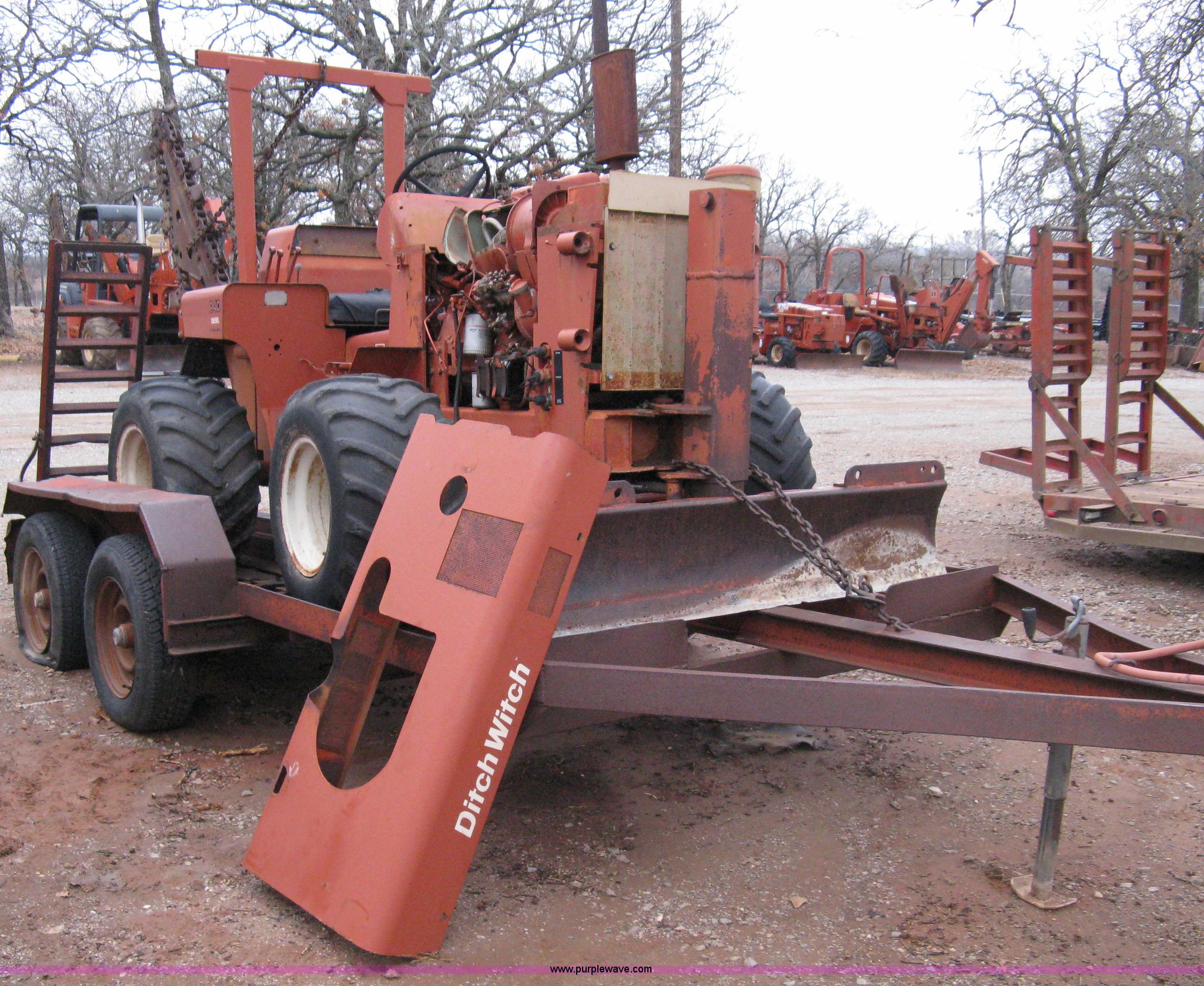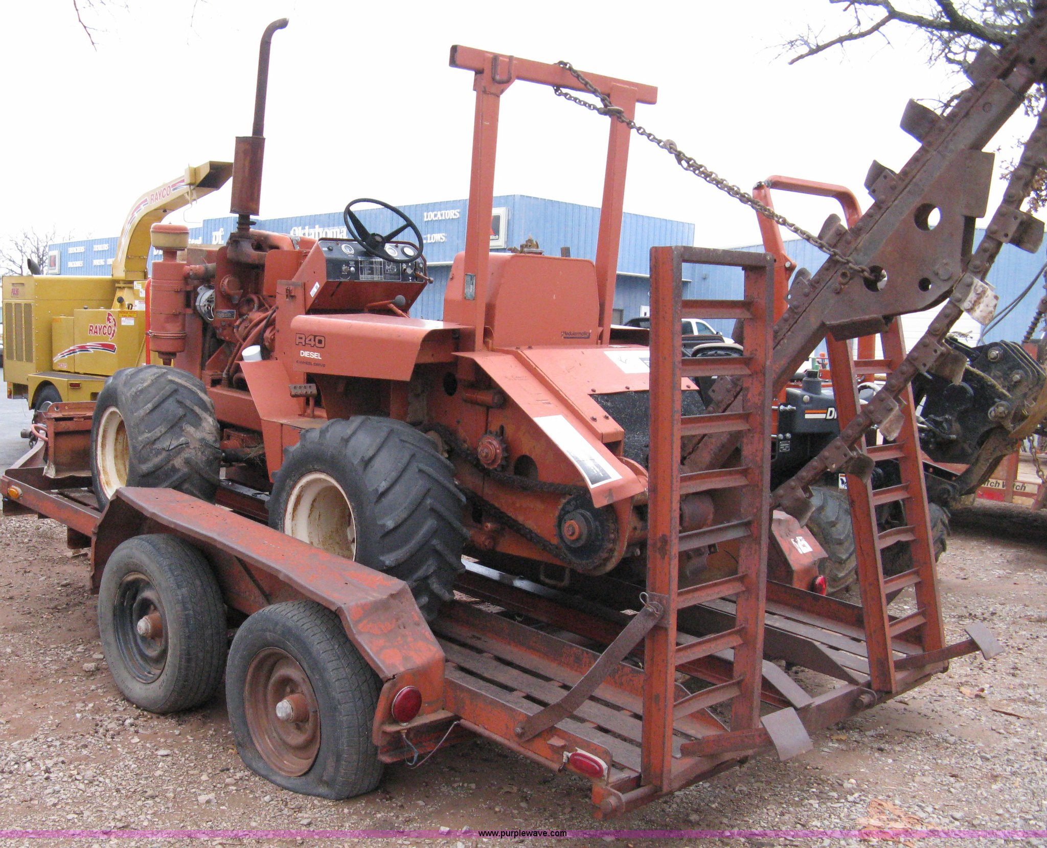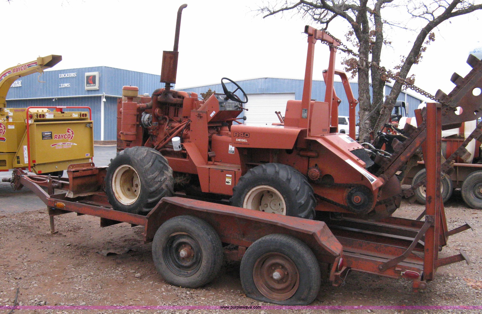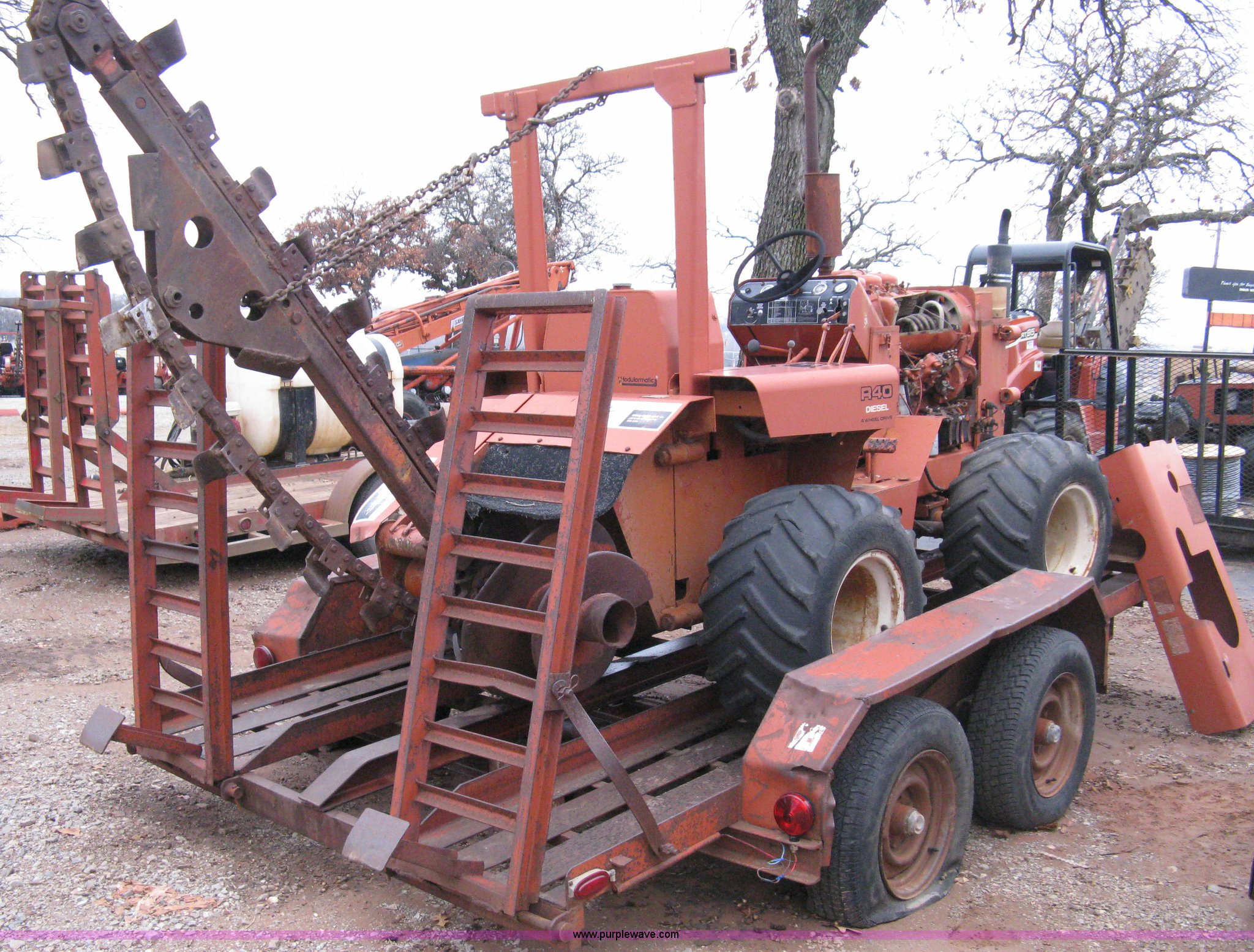 Purple Wave is selling a used Trencher or Rock Saw in Oklahoma. This item is a Ditch Witch R40 trencher and trailer with the following: 2,133 hours on meter, Model R400DD, Diesel engine, Four wheel drive, 64" push blade, Trencher attachment, 80"L, 12"W, Model R40A, Serial ST427636, Auxiliary hydraulics, Two-post roll bar, Key start, Throttle on dash and foot pedal, Engine needs repairs, Fuel lines removed