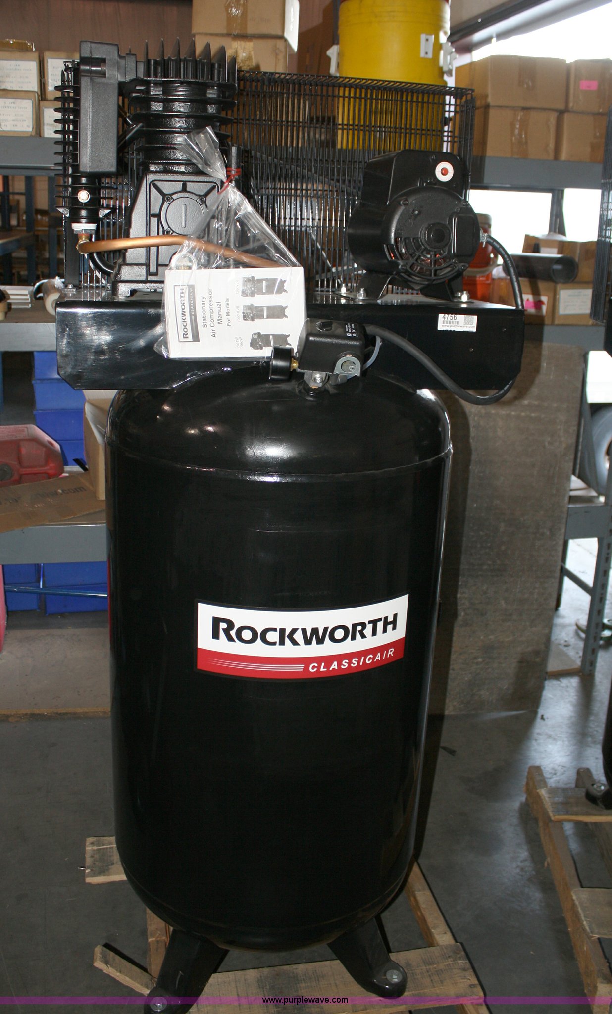 Purple Wave is selling a used Air Compressor in Kansas. This item is a Rockworth 80 gallon air compressor with the following: 208-230V single phase motor, 5hp running, 175 max psi, 15.2 SCFM @ 175 psi, 17.1 SCFM @ 90 psi, 1400rpm max, Cast iron pump