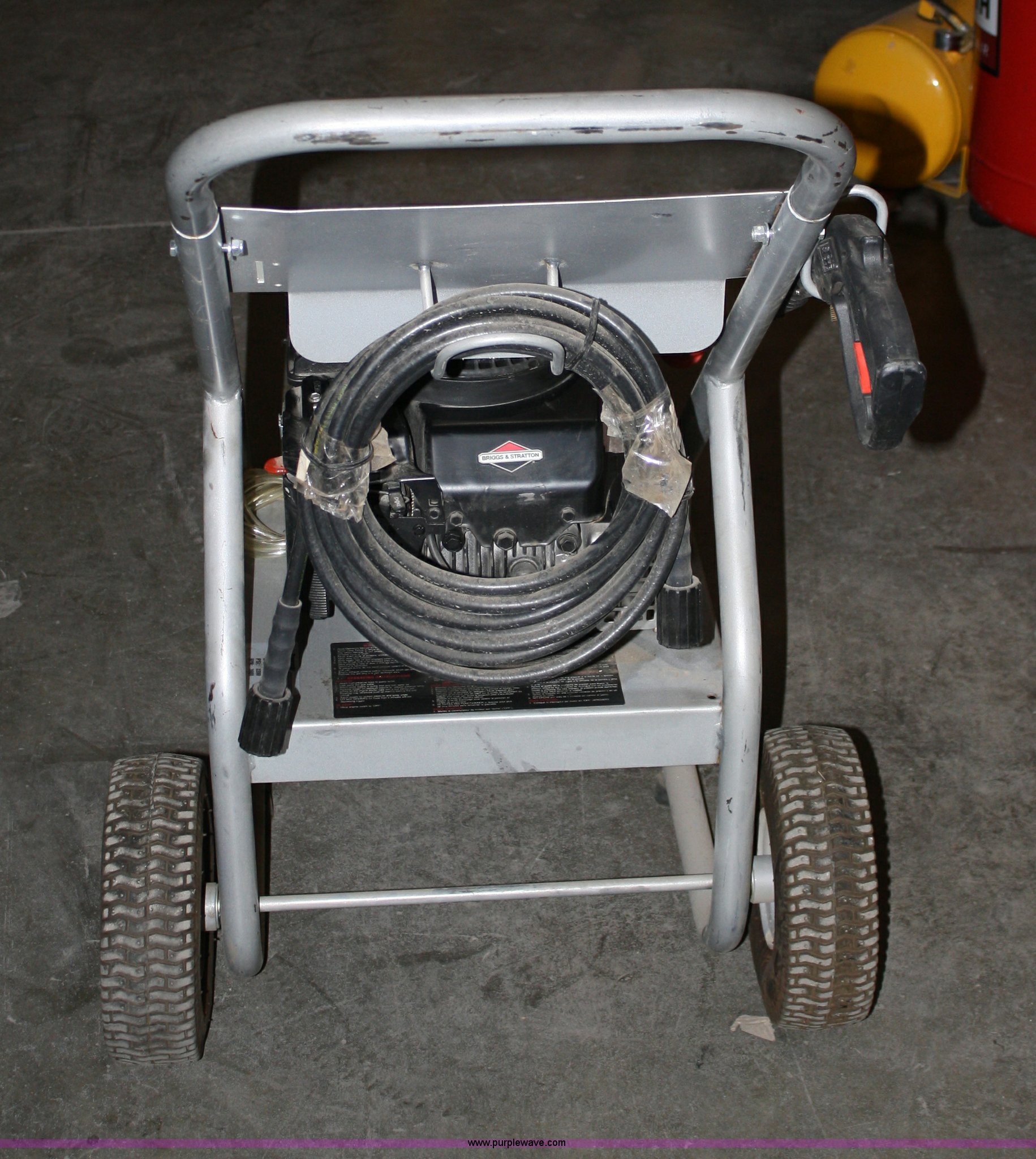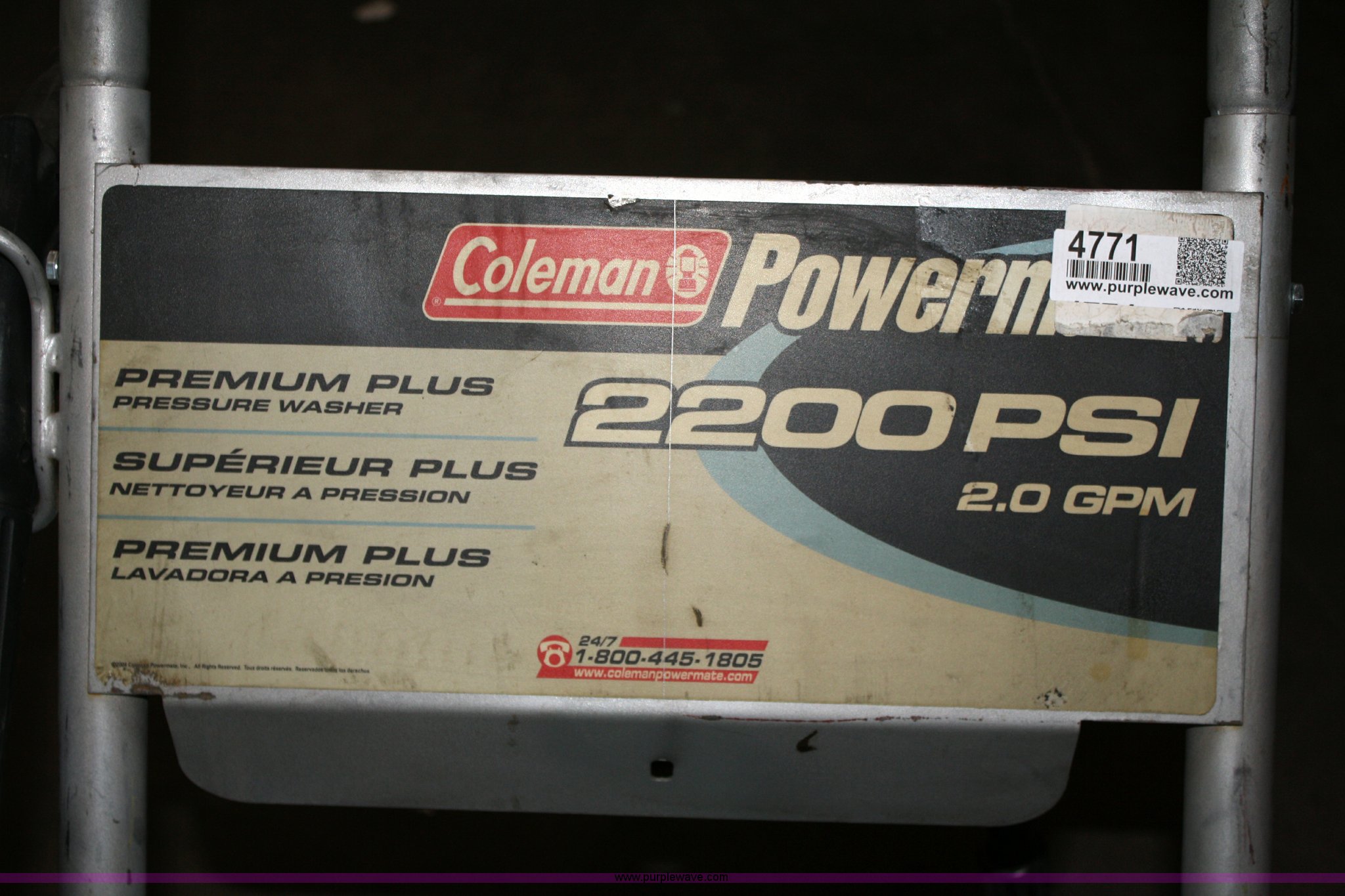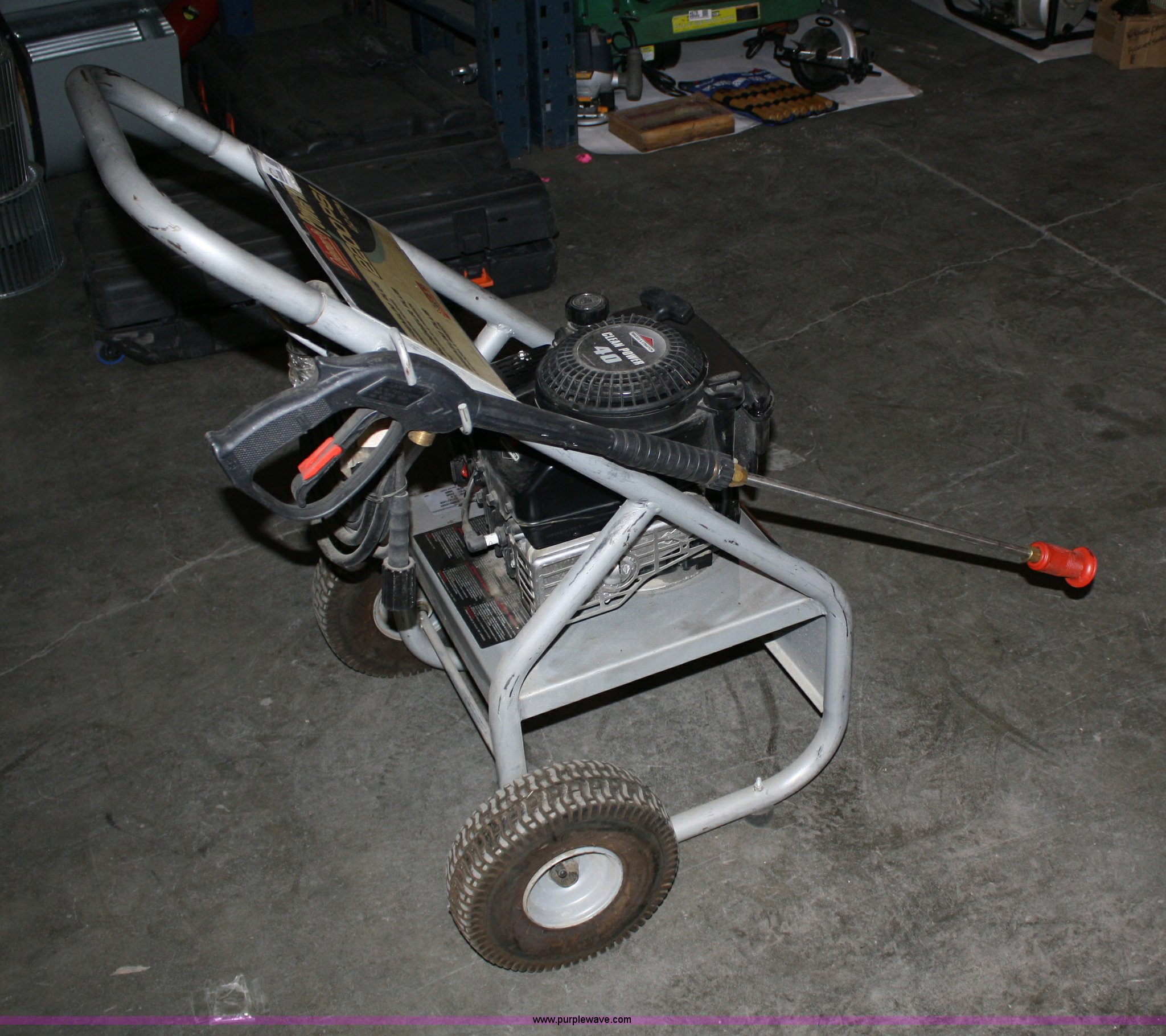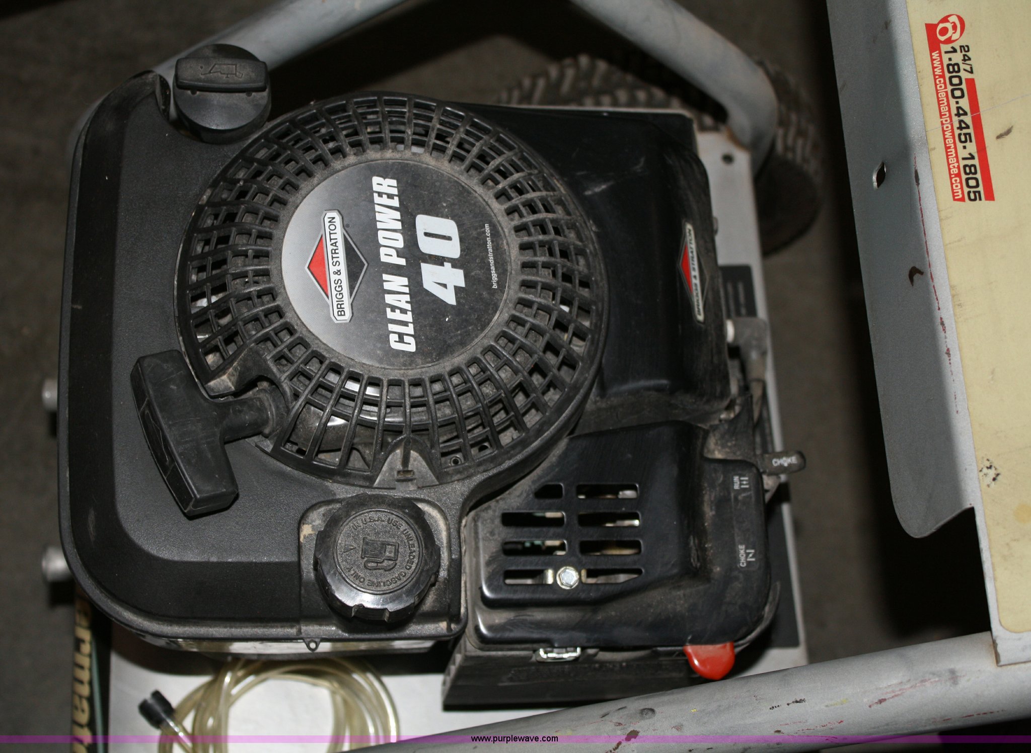 Purple Wave is selling a used Tools in Kansas. This item is a Coleman Powermate pressure washer with the following: 2000psi premium plus, 2.0GPM, 4hp Briggs & Stratton engine, Includes portable wheeled frame, wand and 30ft hose, soap dispensing capabilities
