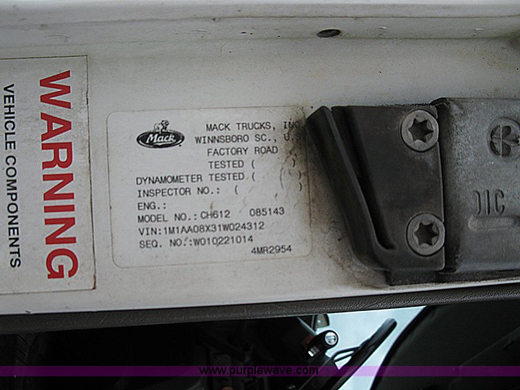 Purple Wave is selling a used Truck Tractor in Florida. This item is a 2001 Mack CH612 semi truck with the following: 798,456 miles on odometer, Mack E7 12.0L diesel engine, Eaton Fuller 10 speed manual transmission, Serial FR011210C, Twin screw, AC and heat, AC knob missing, Tilt, Cruise, AM/FM/Cassette, Passenger daylight door, Air ride cab, Power and heated mirrors, Bumper, Dual fuel tanks, Single exhaust stack, Steel deck plate, Fiberglass half fenders, Hydraulic tank, Small storage area between seats and overhead, Storage box under driver steps, PTO-apsco AV-295, Wet kit, Air suspension, Air brakes, Wheel nut covers, Rockwell axle, GVWR 32,000 lbs, FAWR 12,000 lbs, RAWR 20,000 lbs, 295/75R22.5 tires, Middle of bumper missing, Currently does not start, Batteries dead