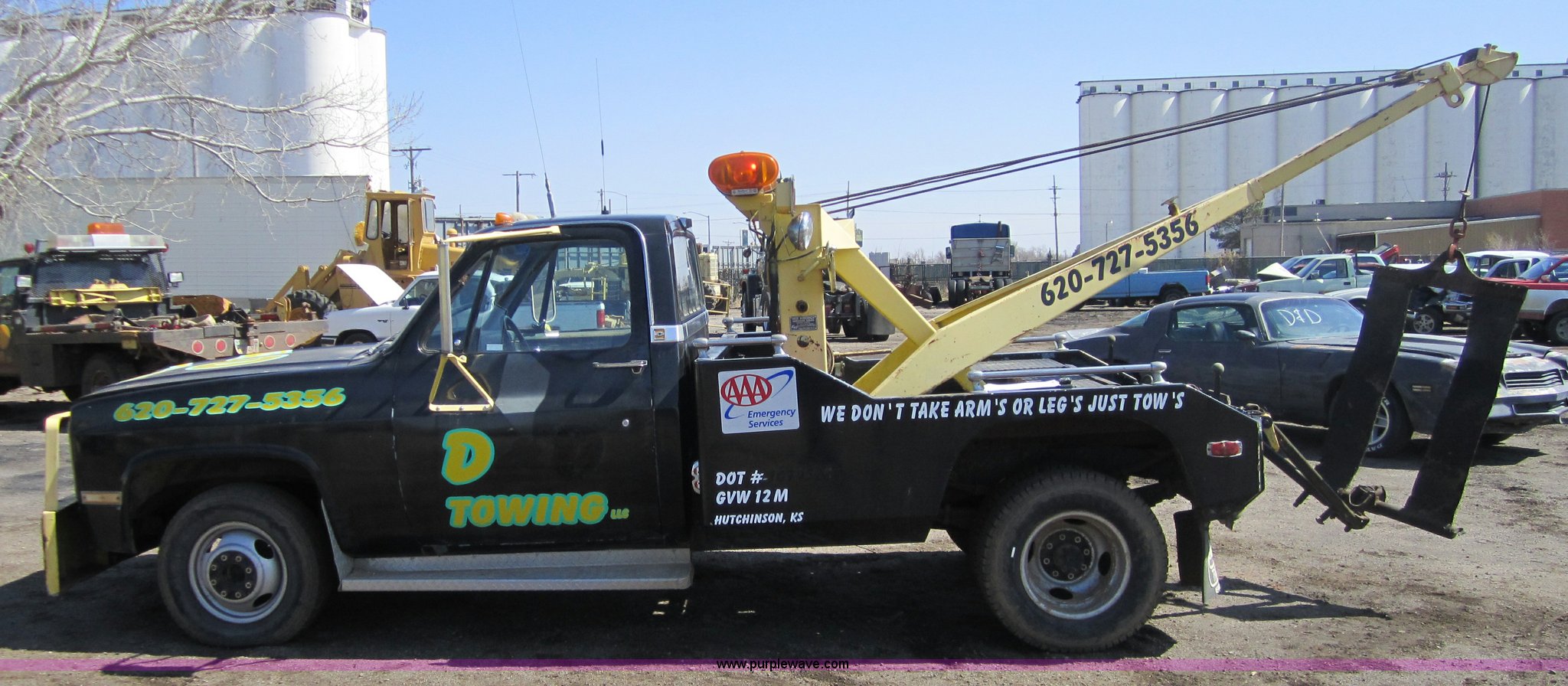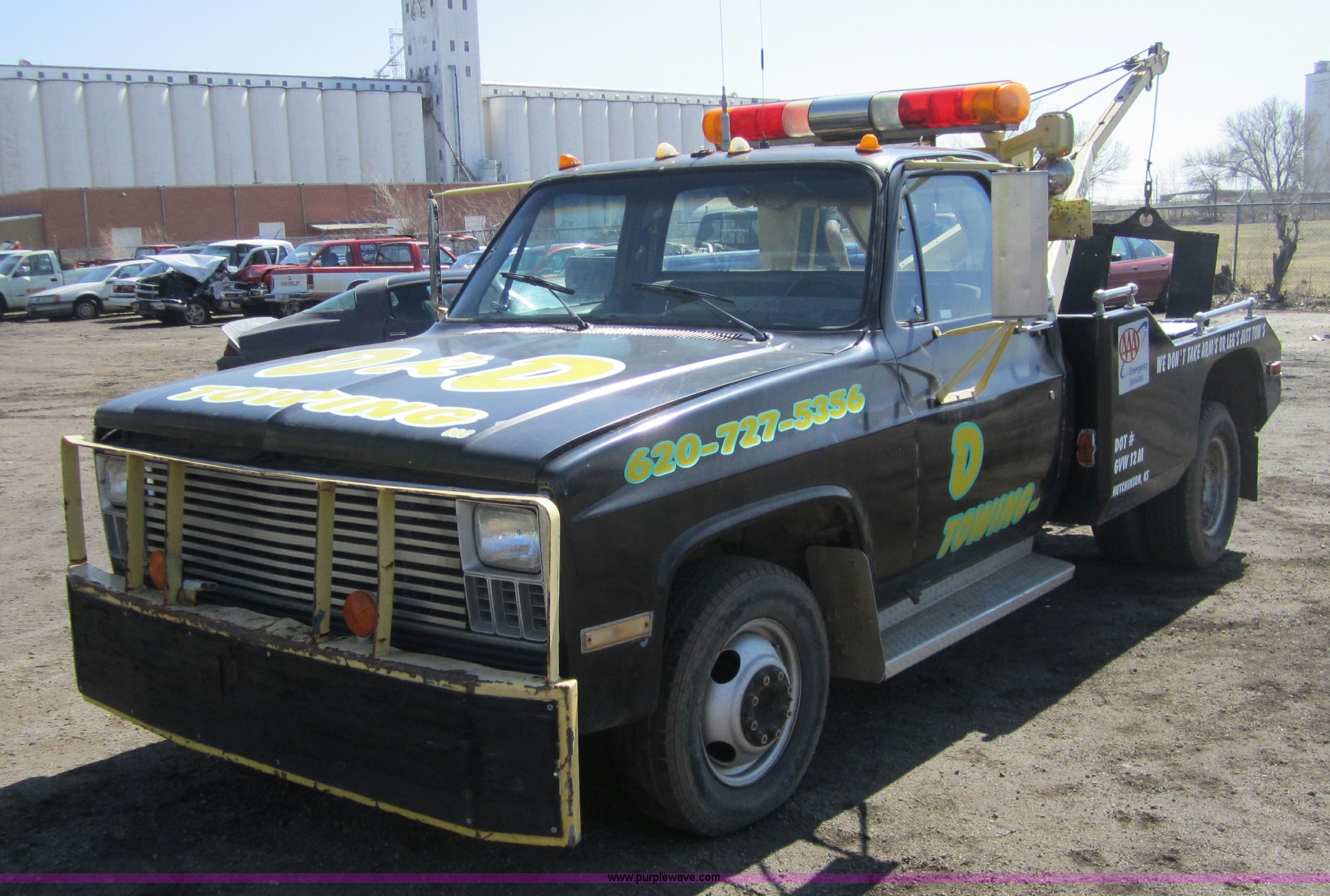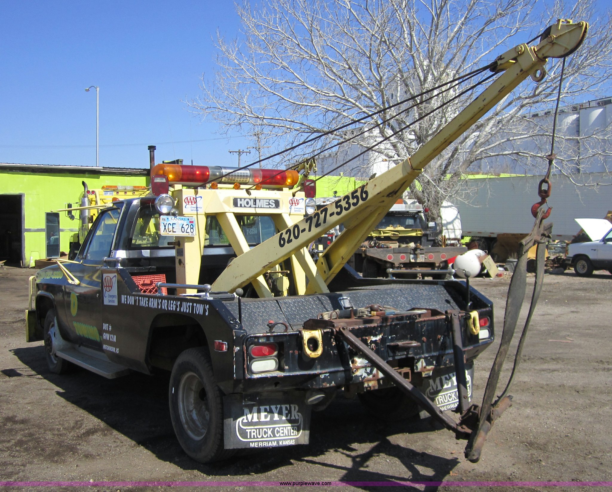 1982 Chevrolet C30 wrecker/tow truck. 57,607 miles on odometer, 5.7L V8 gas engine, Four speed manual transmission, AC and heat, Cruise, Manual windows and locks, Trailer wiring, Holmes 440 tow bed, Goose neck equipped, Micro lock, PTO, Decals and light bar not included, Cracked windshield, LT225-75R16 tires. 1GBHC34MXCV106475. Shipping quotes available. D & D Towing LLC. 2321 E 4th. Hutchinson, KS 67501
