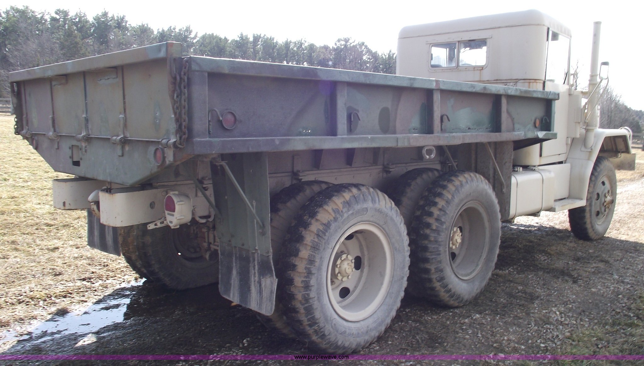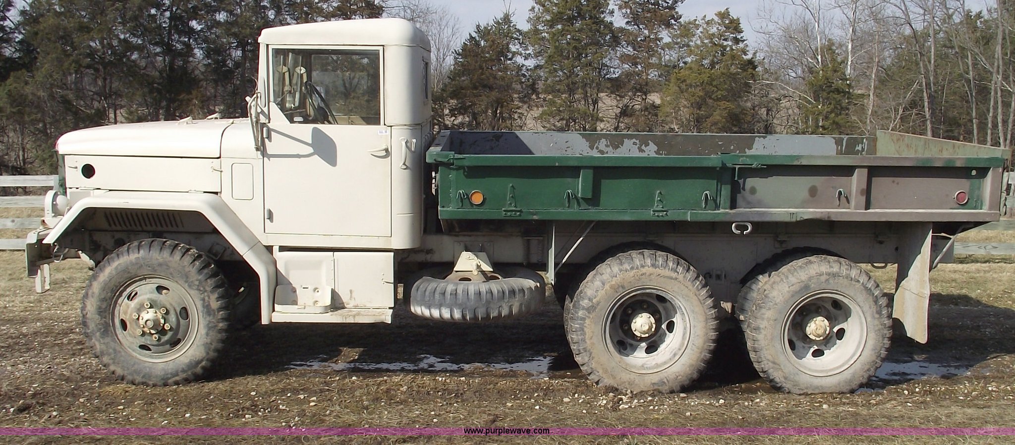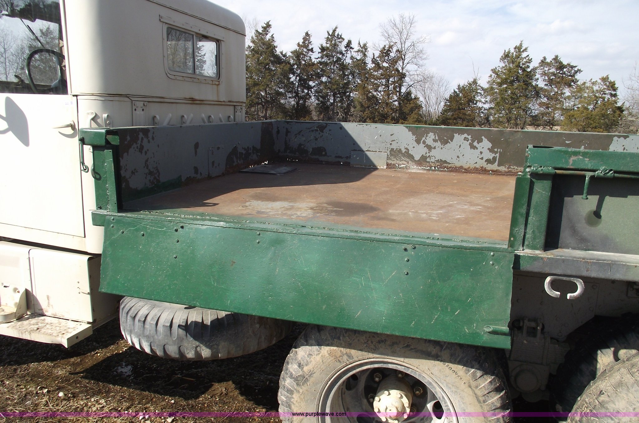 Purple Wave is selling a used Flat Bed Truck in Missouri. This item is a 1967 AMG M35 A26 heavy truck with the following: AM-General six cylinder multi fuel diesel engine, Five speed manual transmission with Hi-Lo, Six wheel drive, Twin screw, Heat, Spring ride seat, Bench seat, Hard top, Bumper, Block heater, Trailer wiring, Pintle hitch, 12'6"L x 8'W bed, Manual end gate, 100 gallon fuel tank, Spring suspension, (2) new 12v batteries, Air brakes, Full spare tire