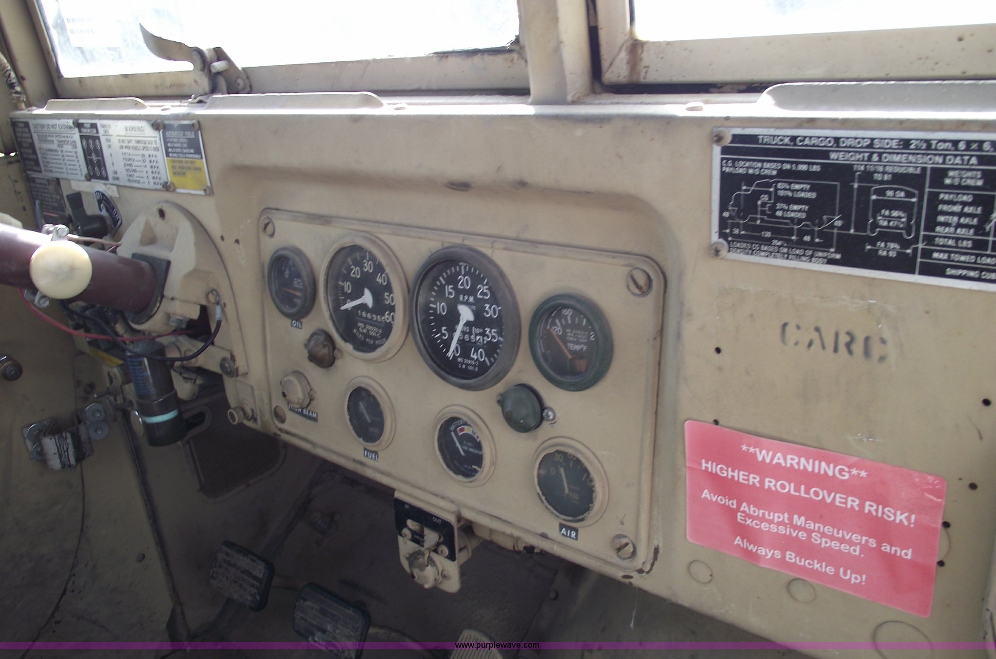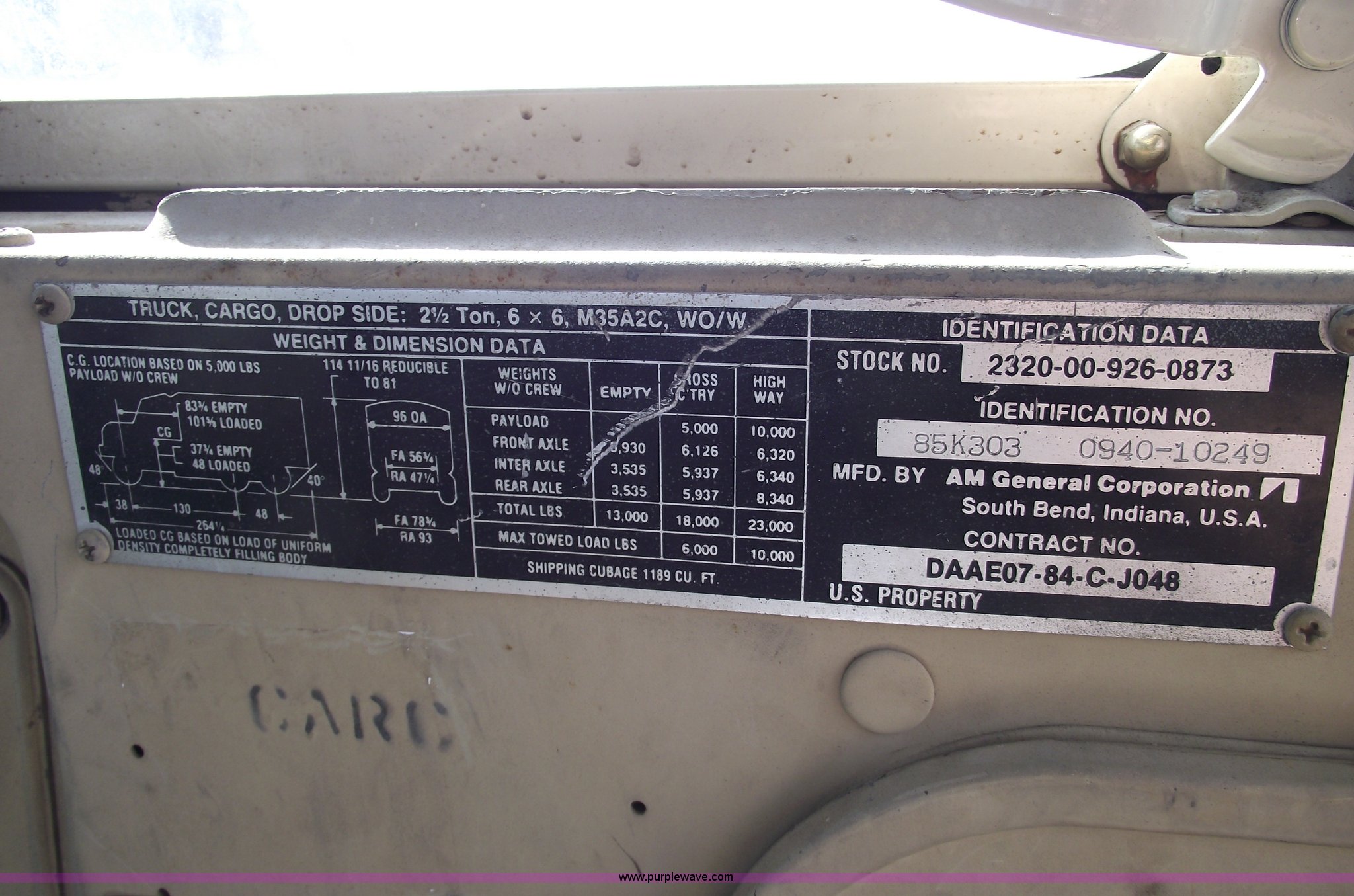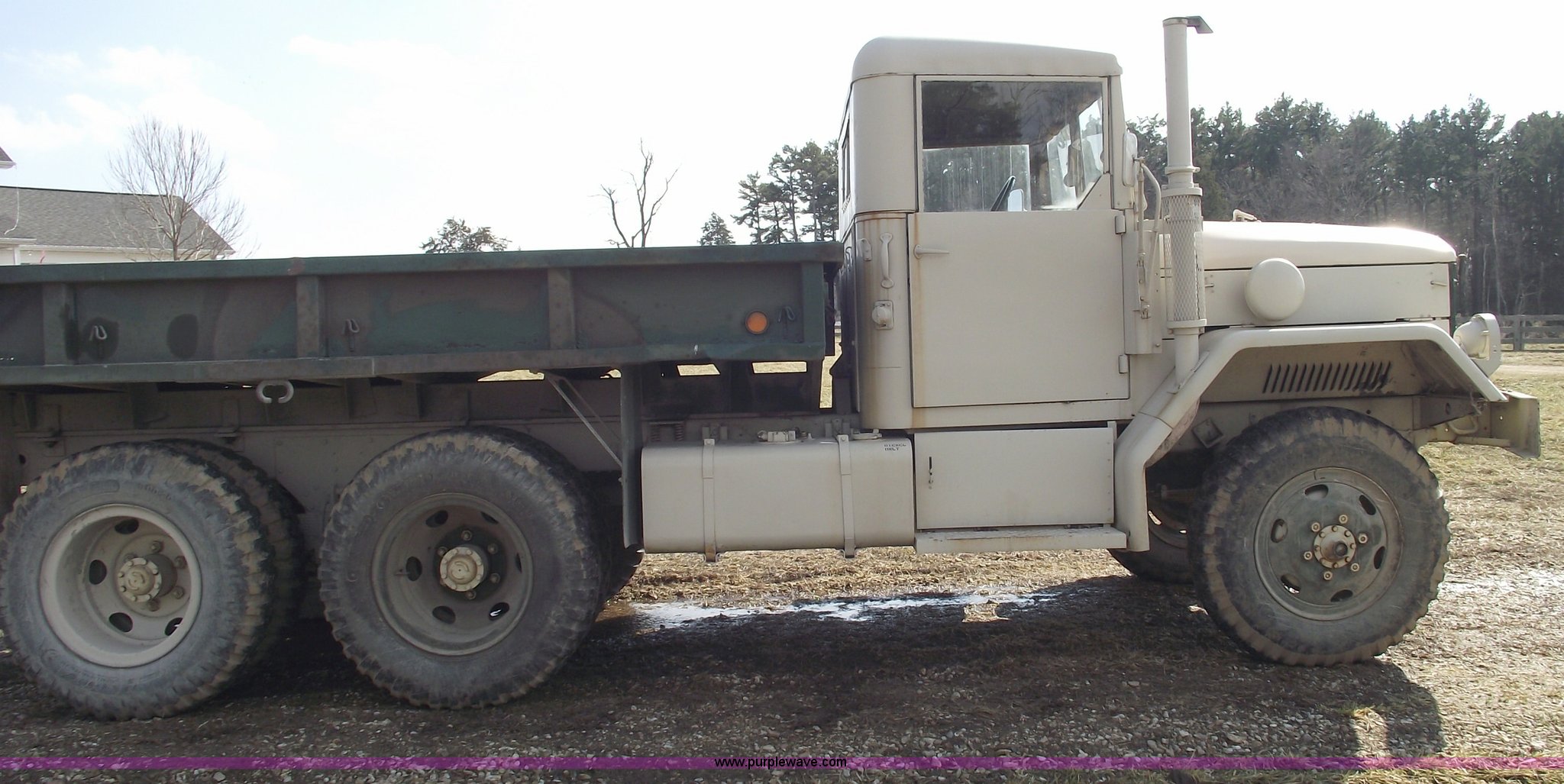Purple Wave is selling a used Flat Bed Truck in Missouri. This item is a 1967 AMG M35 A26 heavy truck with the following: AM-General six cylinder multi fuel diesel engine, Five speed manual transmission with Hi-Lo, Six wheel drive, Twin screw, Heat, Spring ride seat, Bench seat, Hard top, Bumper, Block heater, Trailer wiring, Pintle hitch, 12'6"L x 8'W bed, Manual end gate, 100 gallon fuel tank, Spring suspension, (2) new 12v batteries, Air brakes, Full spare tire