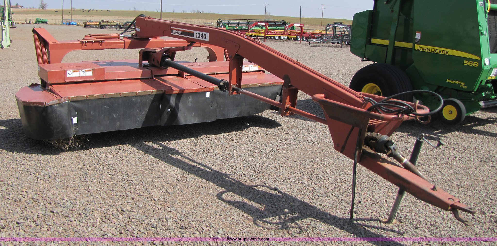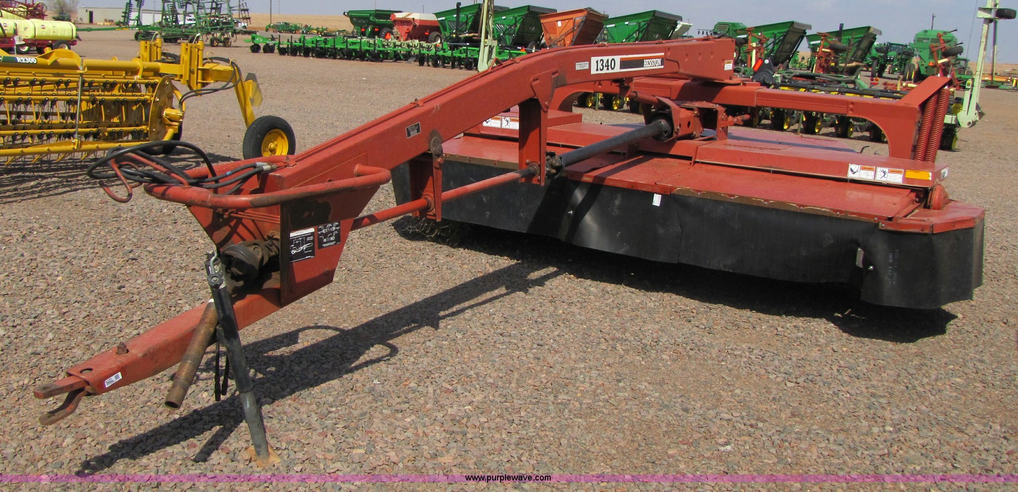 Purple Wave is selling a used Windrower Pull Type in Texas. This item is a Hesston 1340 center pivot disk mower with the following: 12' cut, 1000 PTO, Rubber over metal crimpers, 11L-15 tires, Serial 134T02053, Stock# 43089