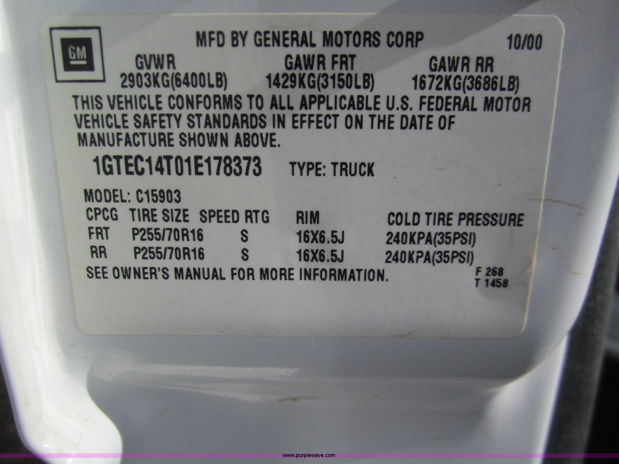 Purple Wave is selling a used 1/2 Ton Pickup or Van in Kansas. This item is a 2001 GMC Sierra C1500 pickup truck with the following: 106,346 miles on odometer, 5.3L V8 MPI gas engine, Automatic transmission, Two wheel drive, AC and heat, Tilt, Cruise, AM/FM, Manual windows and locks, Pickup bed, Receiver hitch, 255/70R16 tires