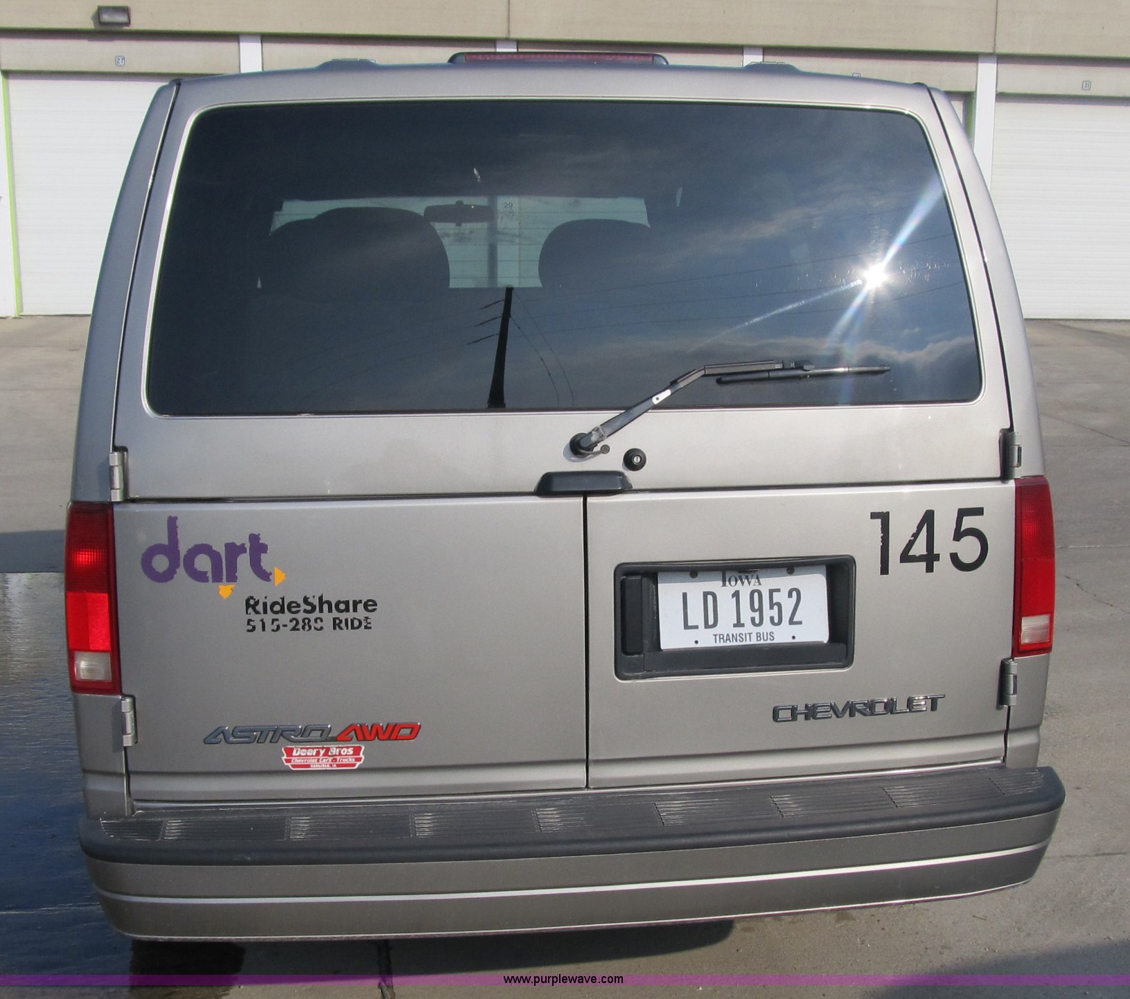 2005 Chevrolet Astro van. 139,022 miles on odometer, 4.3L V6 CPI gas engine, Automatic transmission, All wheel drive, Tow package, AC and heat, Tilt, Cruise, AM/FM, Power windows, locks, and mirrors, P215/70R16 tires. Title distribution may be delayed up to 14 days from verification of funds. 1GNEL19X75B109335. Des Moines DART. 1100 Dart Way. Des Moines, IA 50309
