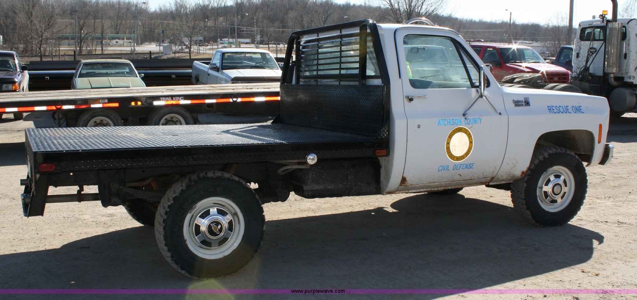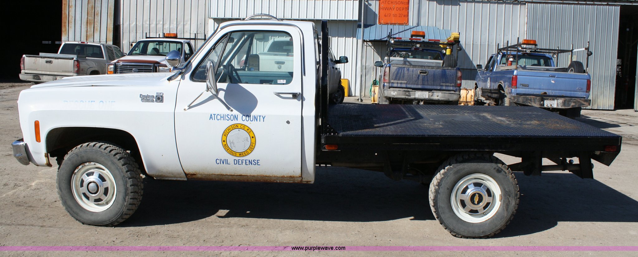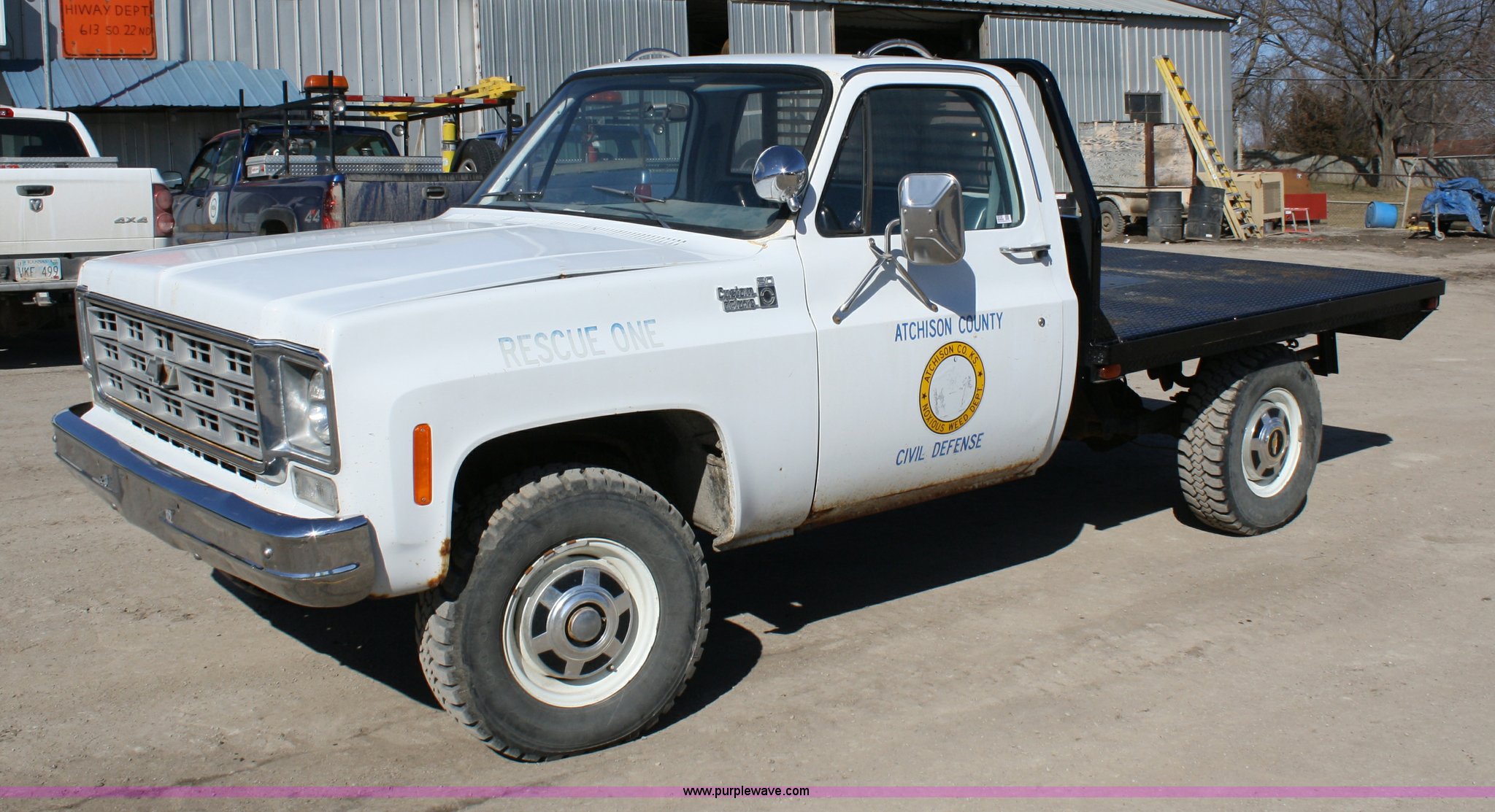1977 Chevrolet Custom Deluxe 20 pickup. 16,526 actual miles 1532 on odometer, 14994 on replaced odometer, V8 350CID gas engine, Automatic transmission, Four wheel drive, 99"L x 80"W flatbed, 235/85R16 tires, Heat, Manual windows and locks, Light valve job and tune-up 1100 miles ago, No gooseneck ball. CKL237J149870. Atchison County Road and Bridge. 613 S. 22nd St.. Atchison, KS 66002