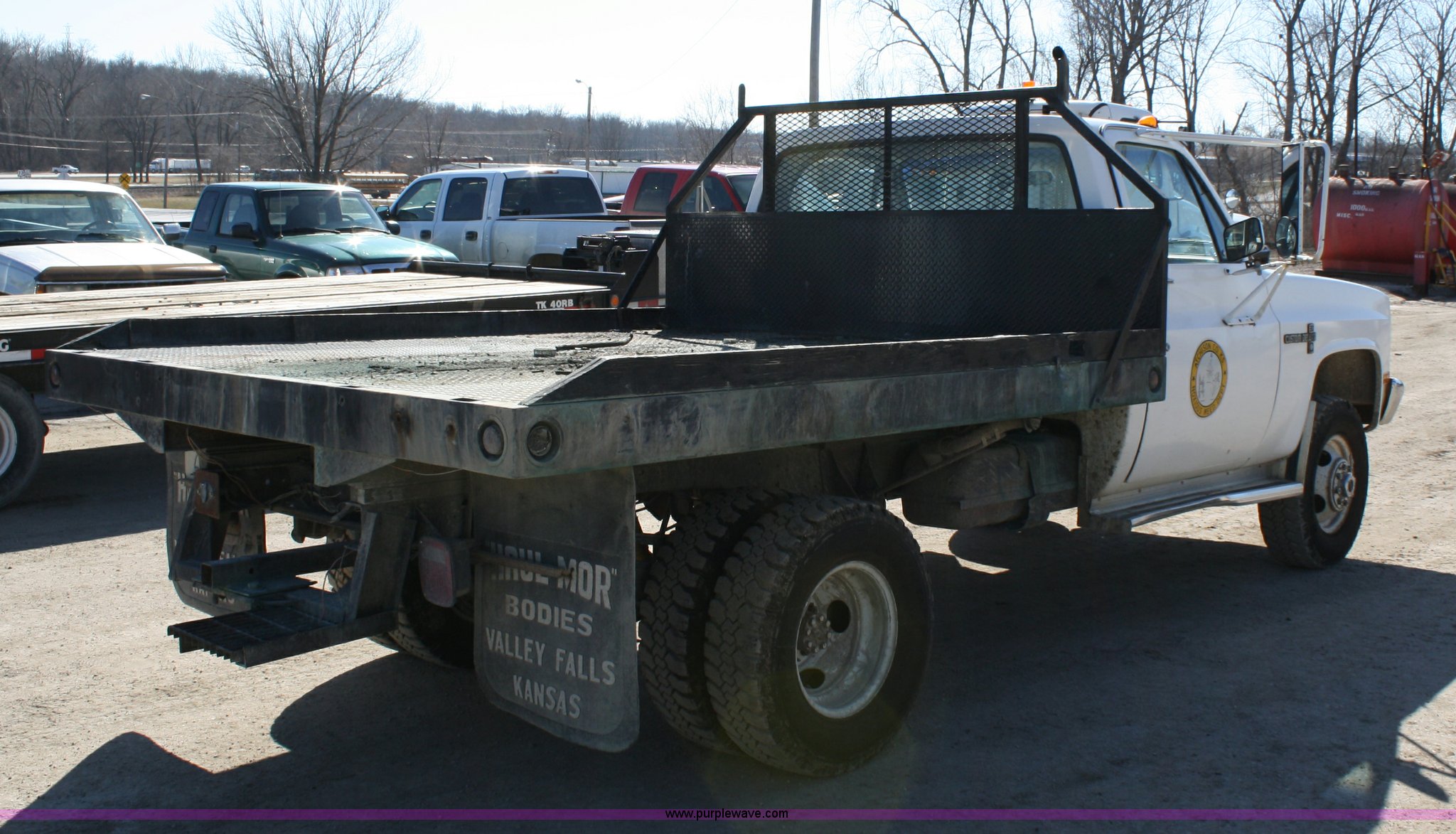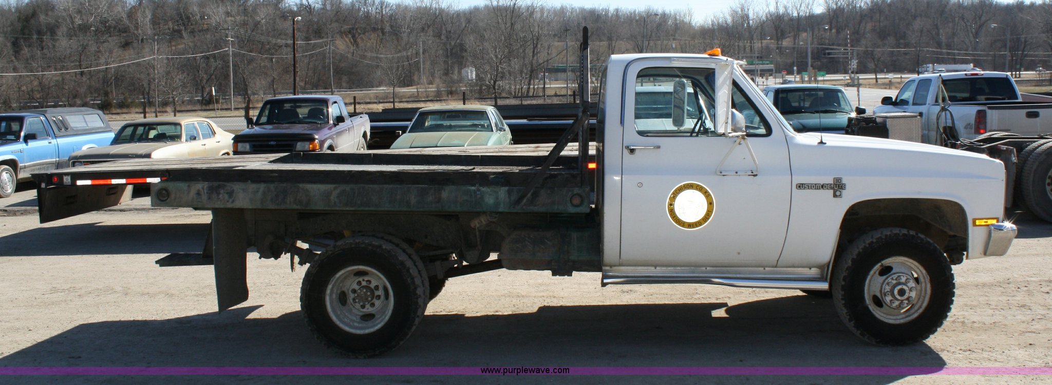 Purple Wave is selling a used Compact Pickup or Van in Kansas. This item is a 1988 Chevrolet Custom Deluxe 30 pickup with the following: 86,659 miles on odometer, V8 350CID gas engine, Four speed manual transmission, Four wheel drive, 107"L x 94"W flatbed, Receiver hitch, 235/85R16 tires, Manual windows and locks, Heat, AM/FM, Manual lockout hubs